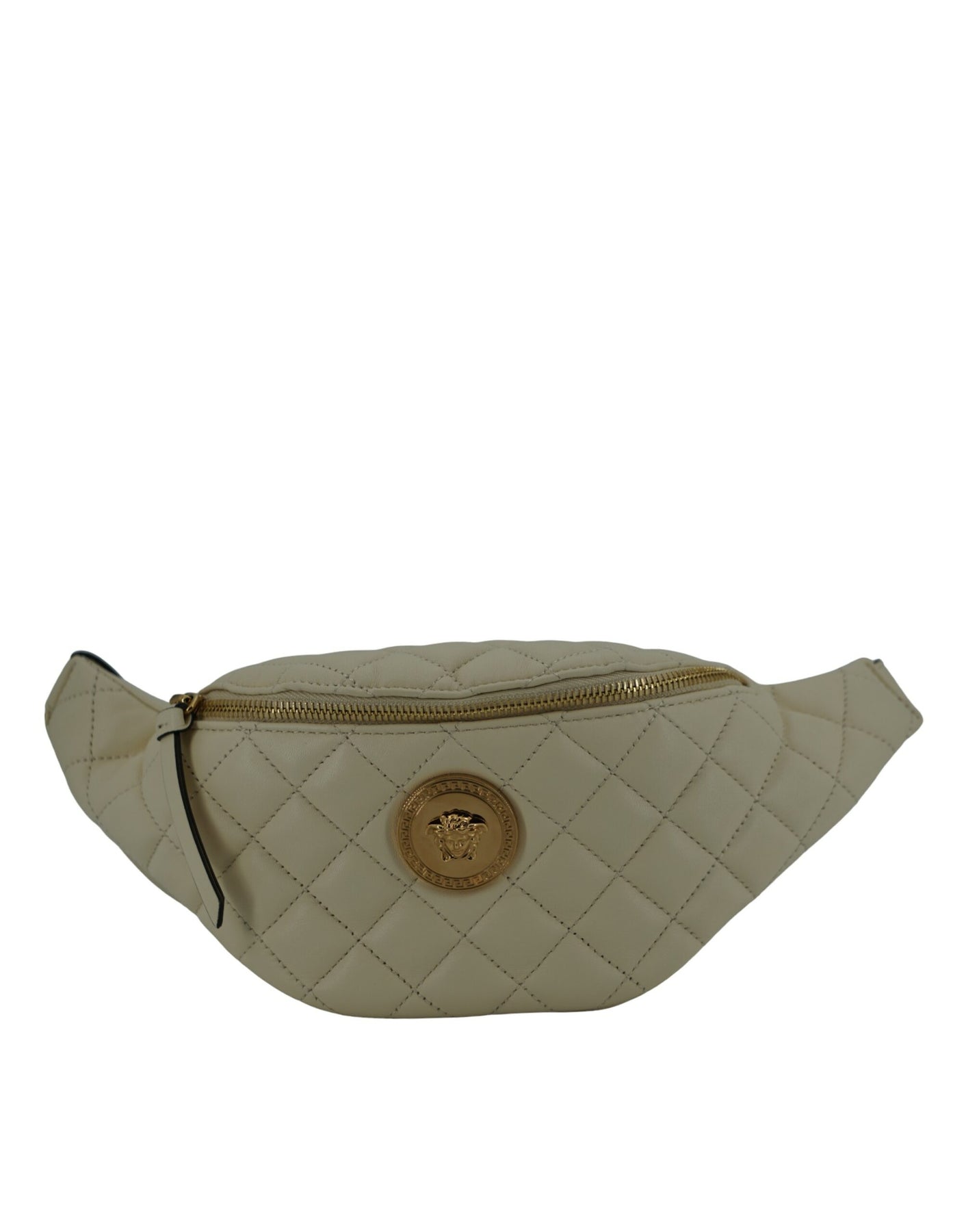 Indulge in the epitome of luxury with this pristine white Belt Bag, a masterpiece from the renowned house of Versace. Expertly crafted from sumptuous 100% lamb leather, this brand new accessory is accompanied by tags and its original dustbag. Its compact silhouette, featuring a secure zip closure, unravels to reveal a meticulously organized main compartment. Inside, an internal slip pocket with signature logo details ensures your essentials remain neatly stowed. Designed for comfort and versatility, the adjustable leather belt strap allows you to wear it in multiple styles, elevating any outfit with its sophisticated charm.