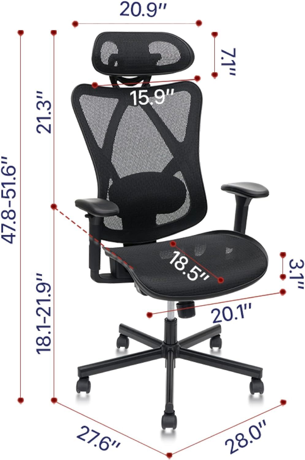 - Adjustable armrest go up and down for the comfortable arm support. The mesh headrest with height and angle adjustment, keep you get great neck support and avoid cervical pain. The ergonomic chair is sturdy with a max capacity 280lbs.