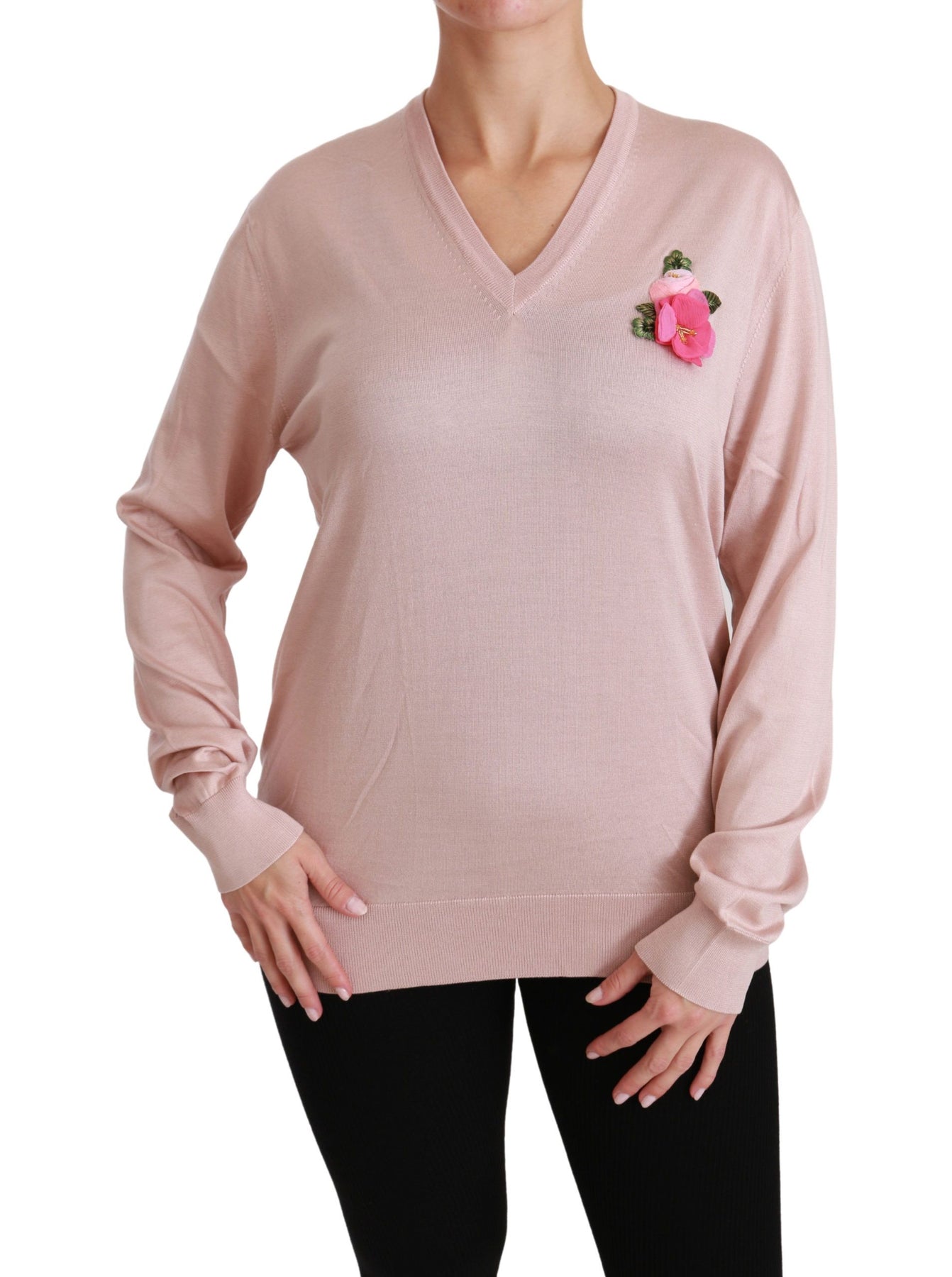 Dolce & Gabbana Pink Floral Embellished Pullover Silk Sweater