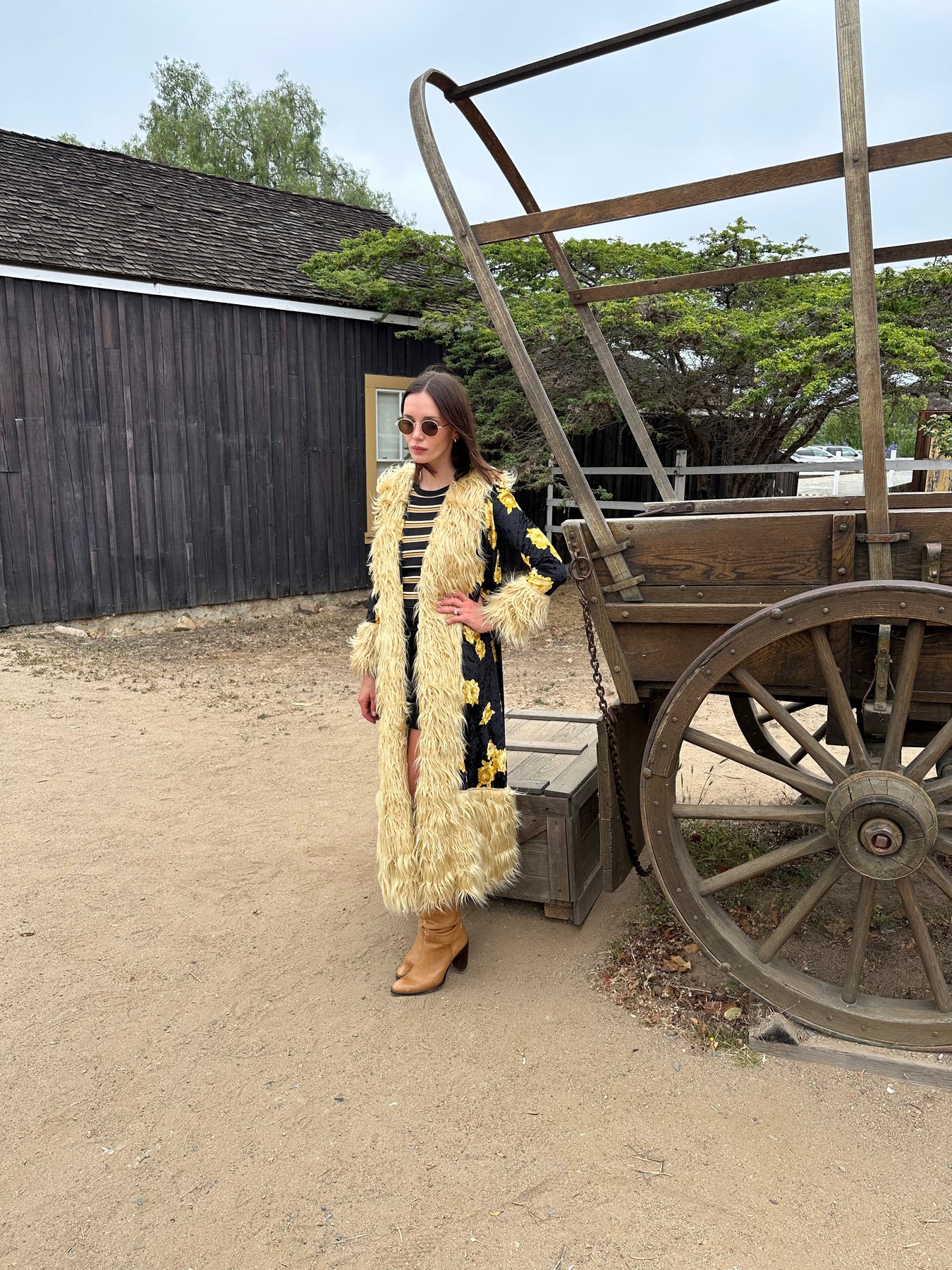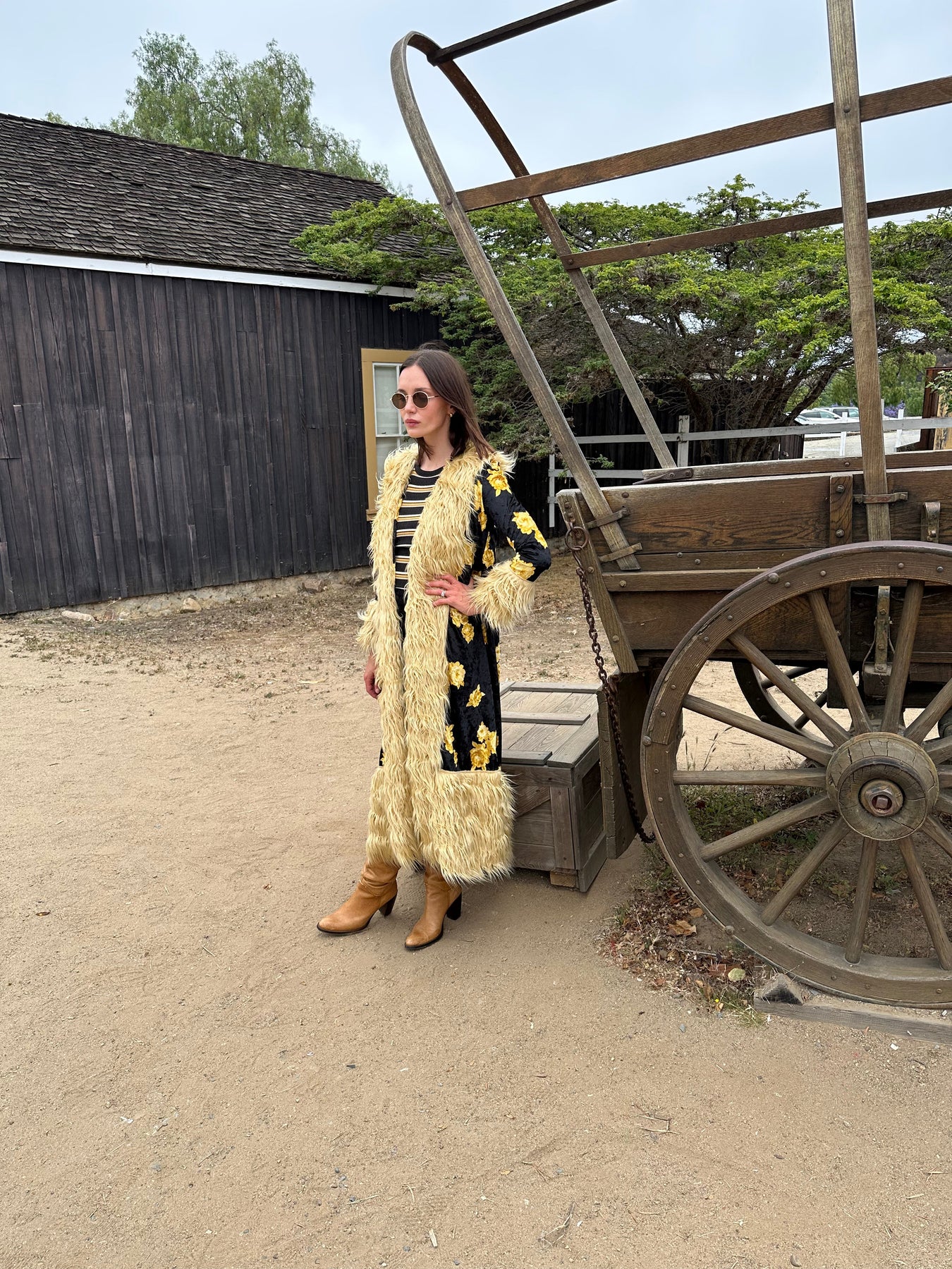 This dark floral boho coat was handmade in southern California. Made with an ultrasoft stretch velvet lined with a cozy bamboo jersey, this piece features faux tawny colored  fur cuffs at sleeve, a matcjimng faux fur collar and hem, and in-seam pockets for the ultimate fusion of style and comfort.