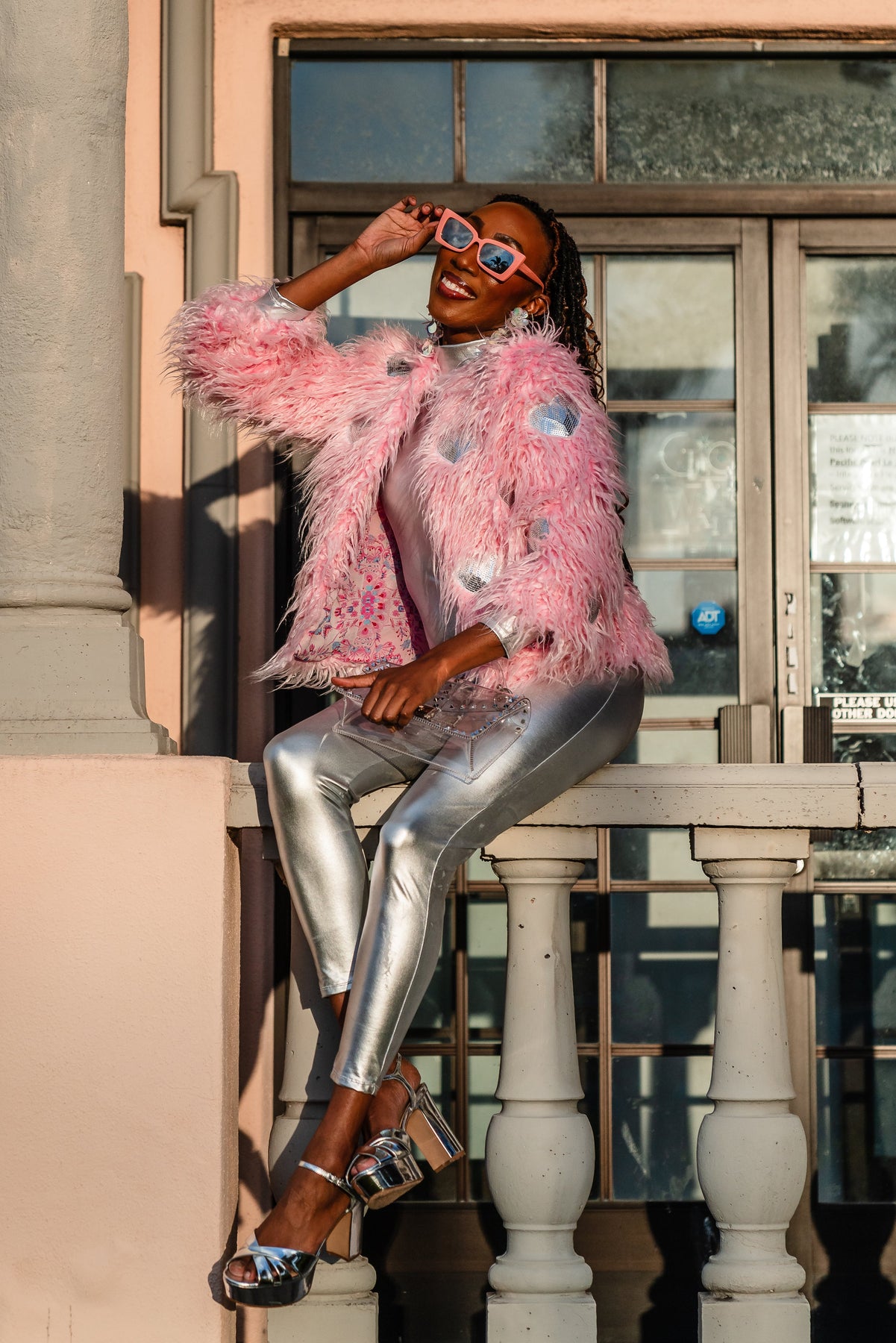 The romantic little one was voted for BY our Jennafer Grace collectors, you spoke and we listened! The Valentine Queen jacket is hand crafted with stunning chrome heart patches on ultra soft synthetic all faux Mongolian sheep fur. Featuring pockets and a bright, cheerful rayon lining! Style your look for casual funk in jeans and a Band T, or red-carpet ready over sequins and shine! Our Jennafer Grace Valentine Queen Jacket is generously sized and ready to steal hearts!