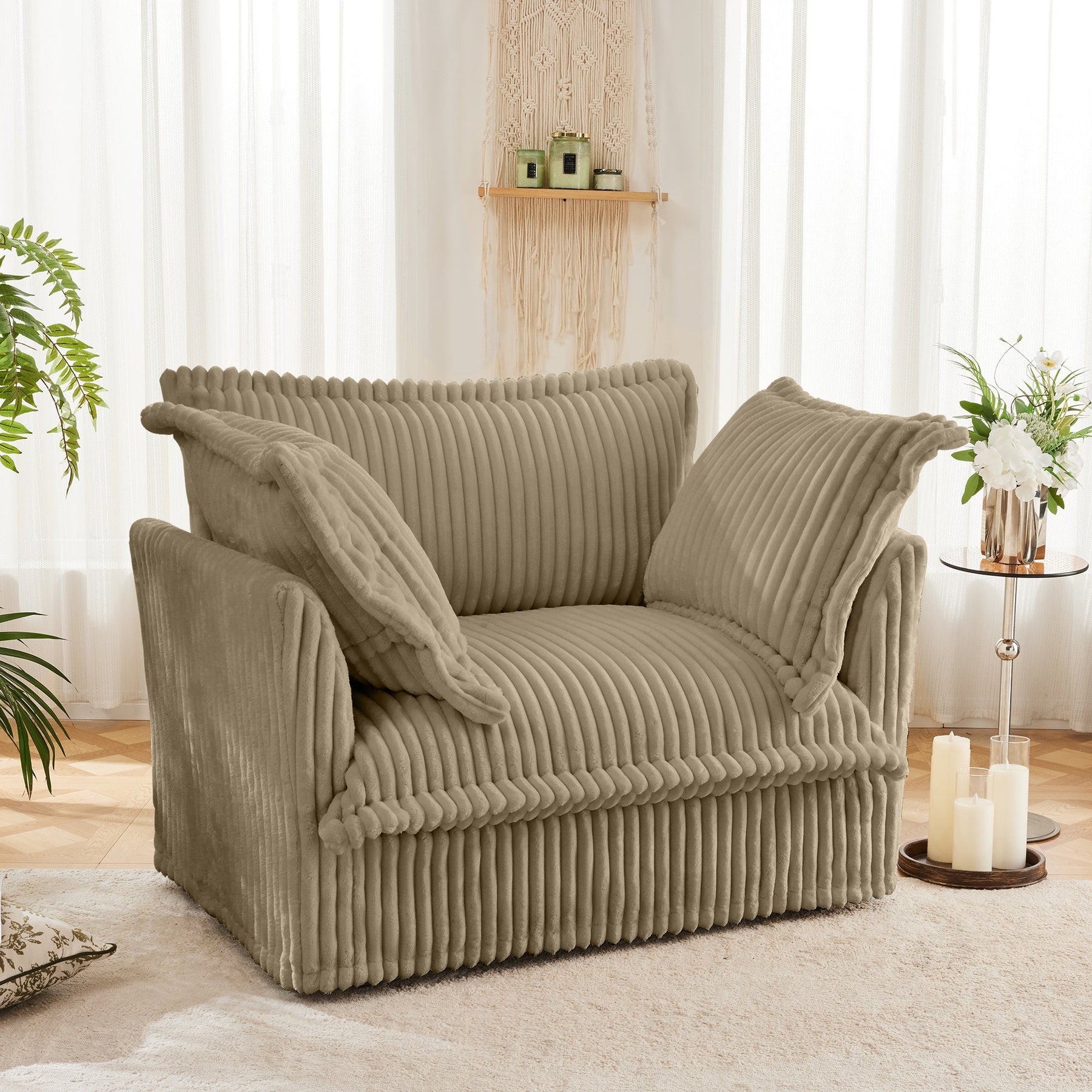 Slip-covered Armchair with 1 Big Back Cushion and 2 Big Toss Pillows, Single Deep Seat Comfy Single Couch Sofa Multiple Large Soft Pillows, Camel Corduroy Fabric
