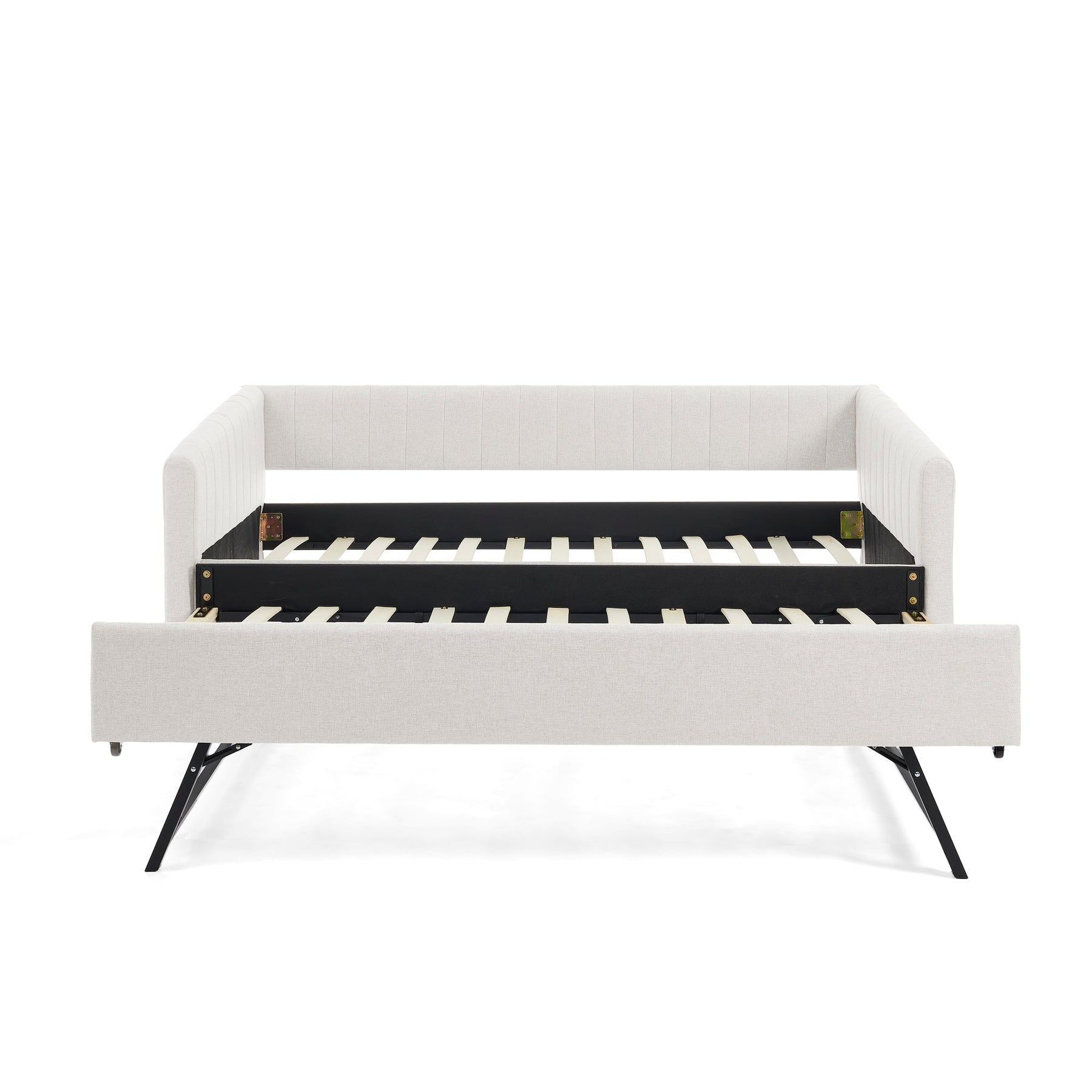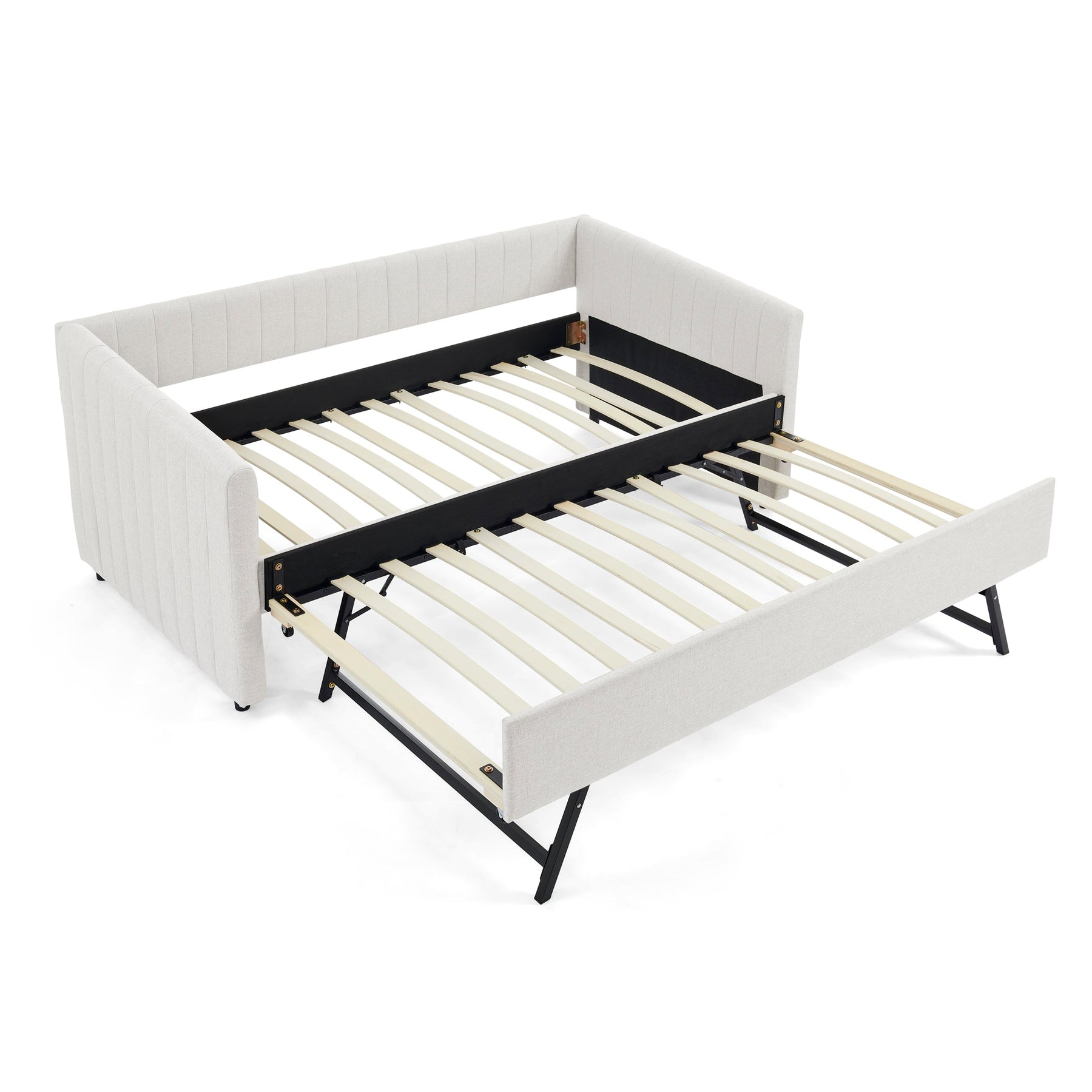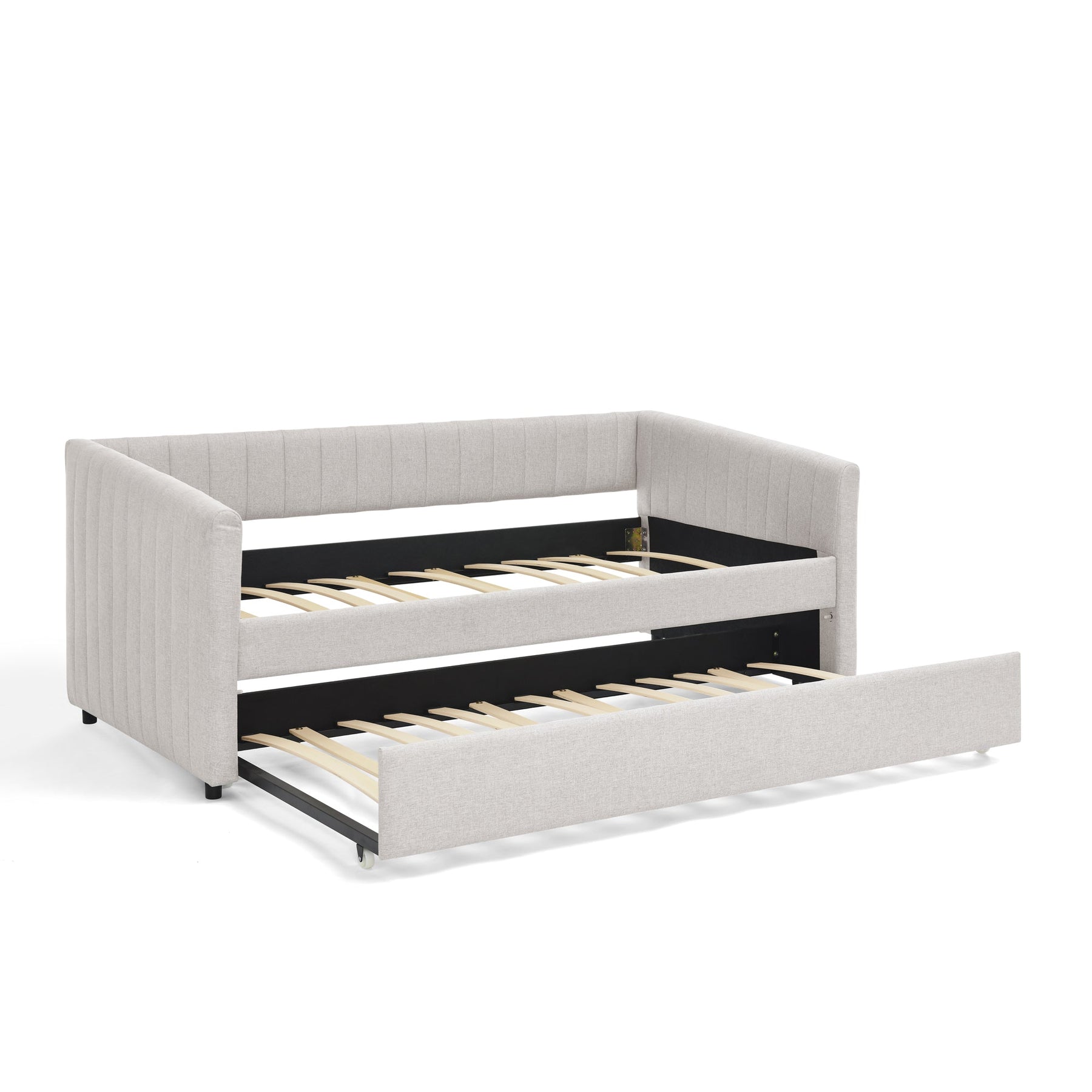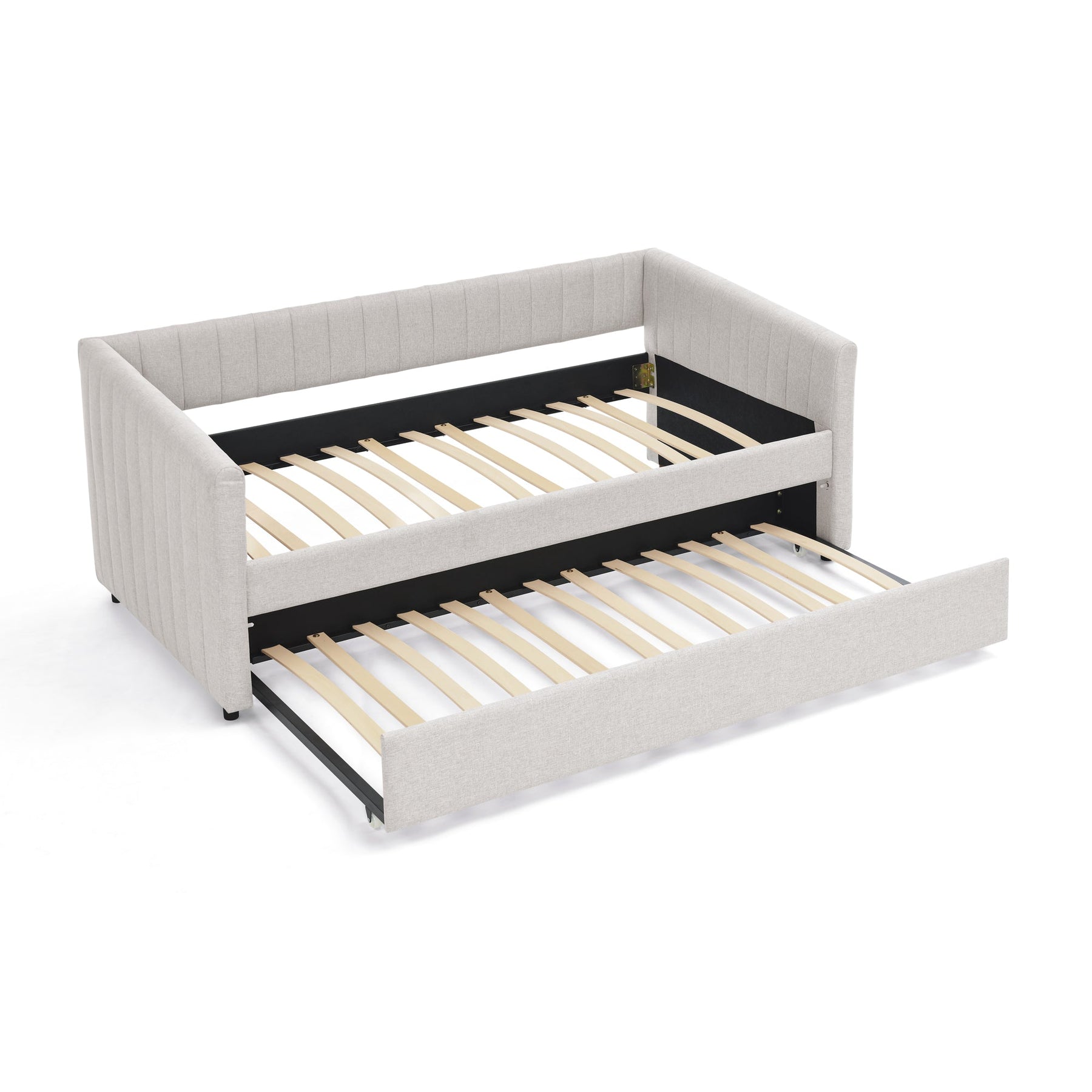 Twin Size Daybed with Trundle Upholstered Sofa Bed, with Vertical Stripes, Linen Fabric, Beige  (82.5&