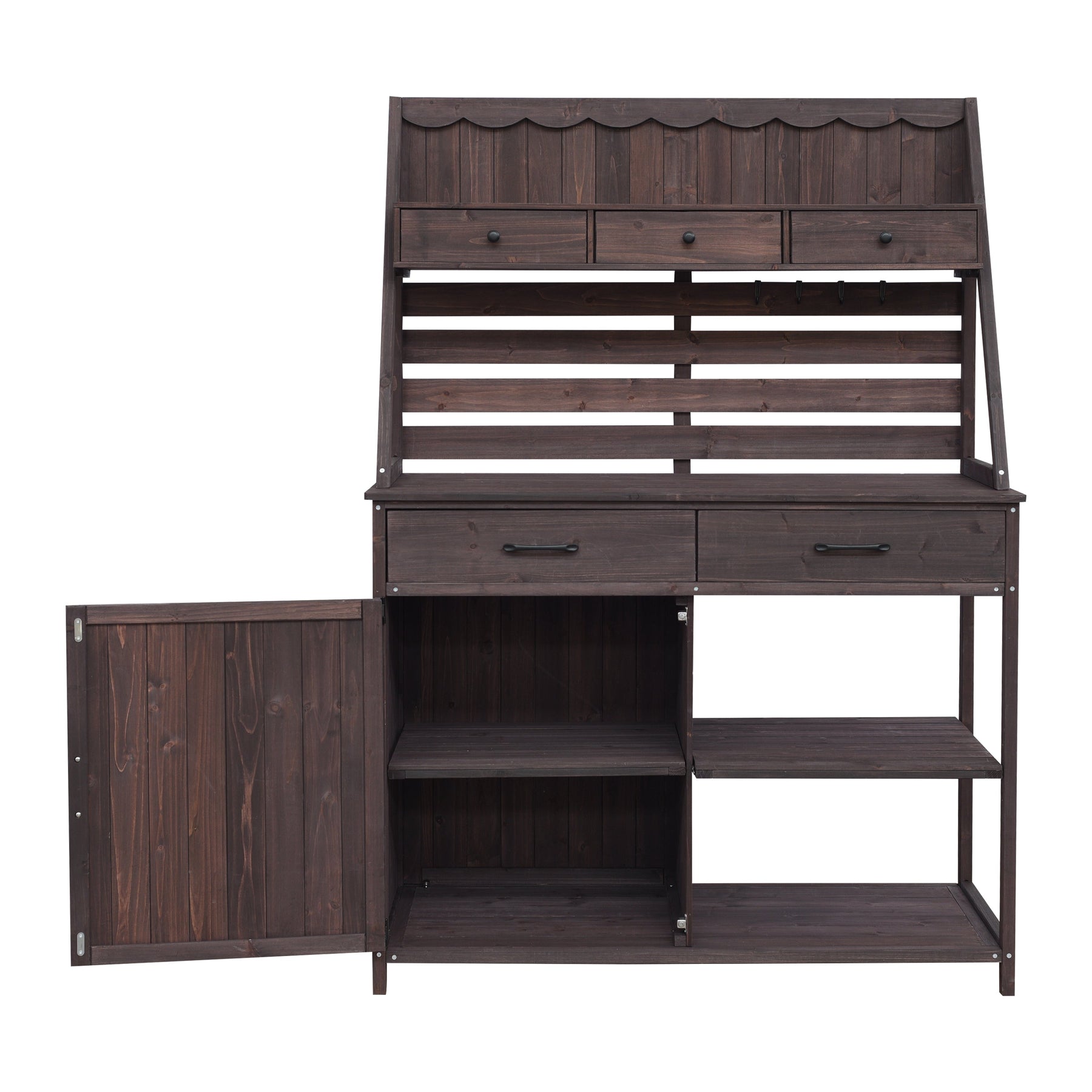 Brown Fir Wood Potting Bench - 5-Drawer Garden Workstation with Slatted Back Panel & Storage Cabinet