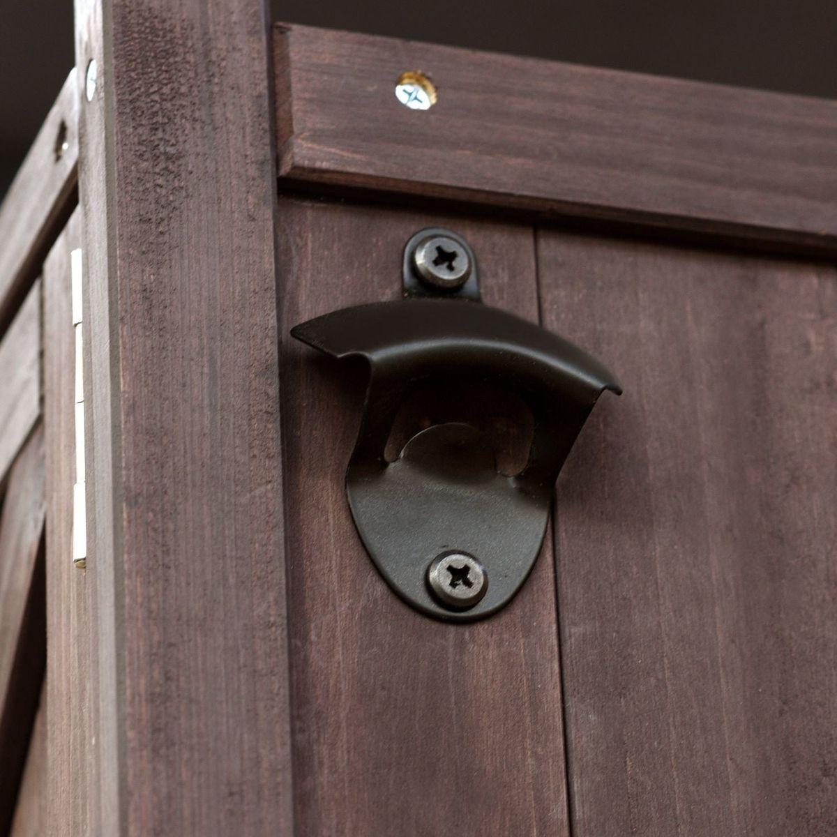 Summary This outdoor kitchen cart is ideal for hosting backyard barbecues or gatherings with friends and family on the patio. Constructed from solid fir wood and a 201 thick stainless steel top, it is perfect for food preparation, serving trays, or keeping beverages cold. The frame is made of solid fir wood with a distressed finish, featuring slatted door fronts with a natural finish for added farmhouse charm. This bar cart sits on 4 lockable casters for easy mobility and stability. The thoughtfully designed three shelves on either side can be adjusted or removed for maximum adaptability. Additionally, this cart includes internal storage racks and a spacious spice rack to accommodate bottles and glasses.