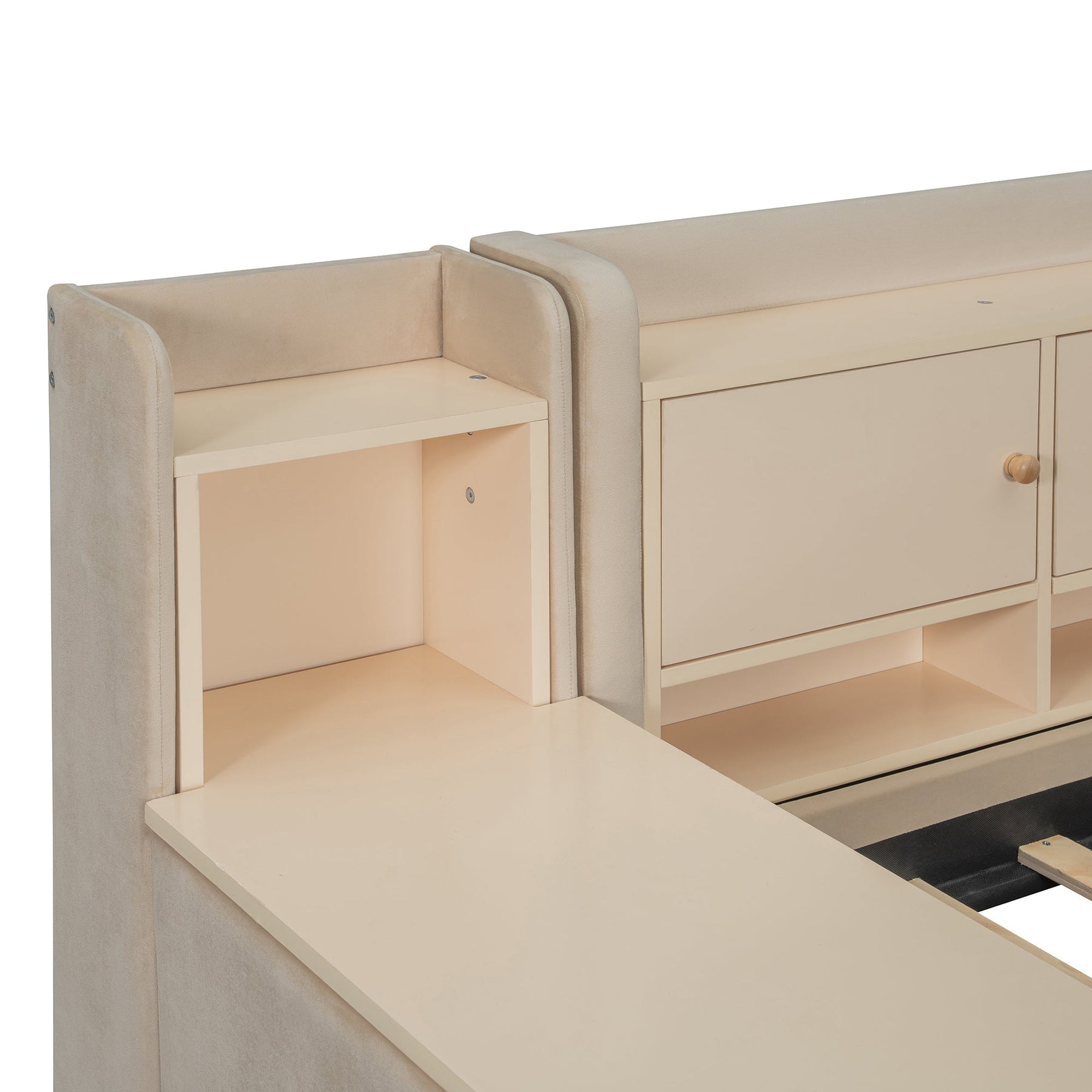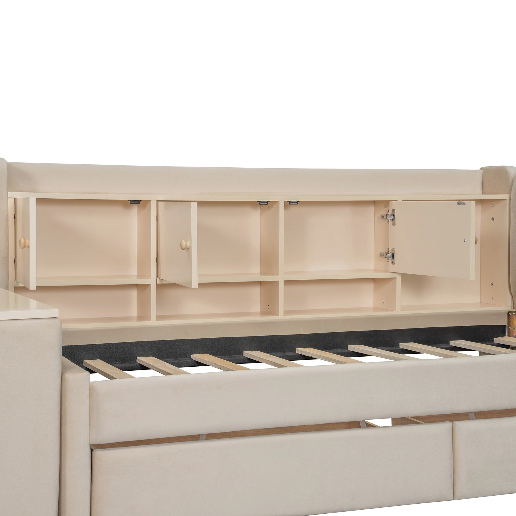 Twin Size Upholstered Daybed with Drawers, Shelves, Flip Cabinets & Side Table (Beige)