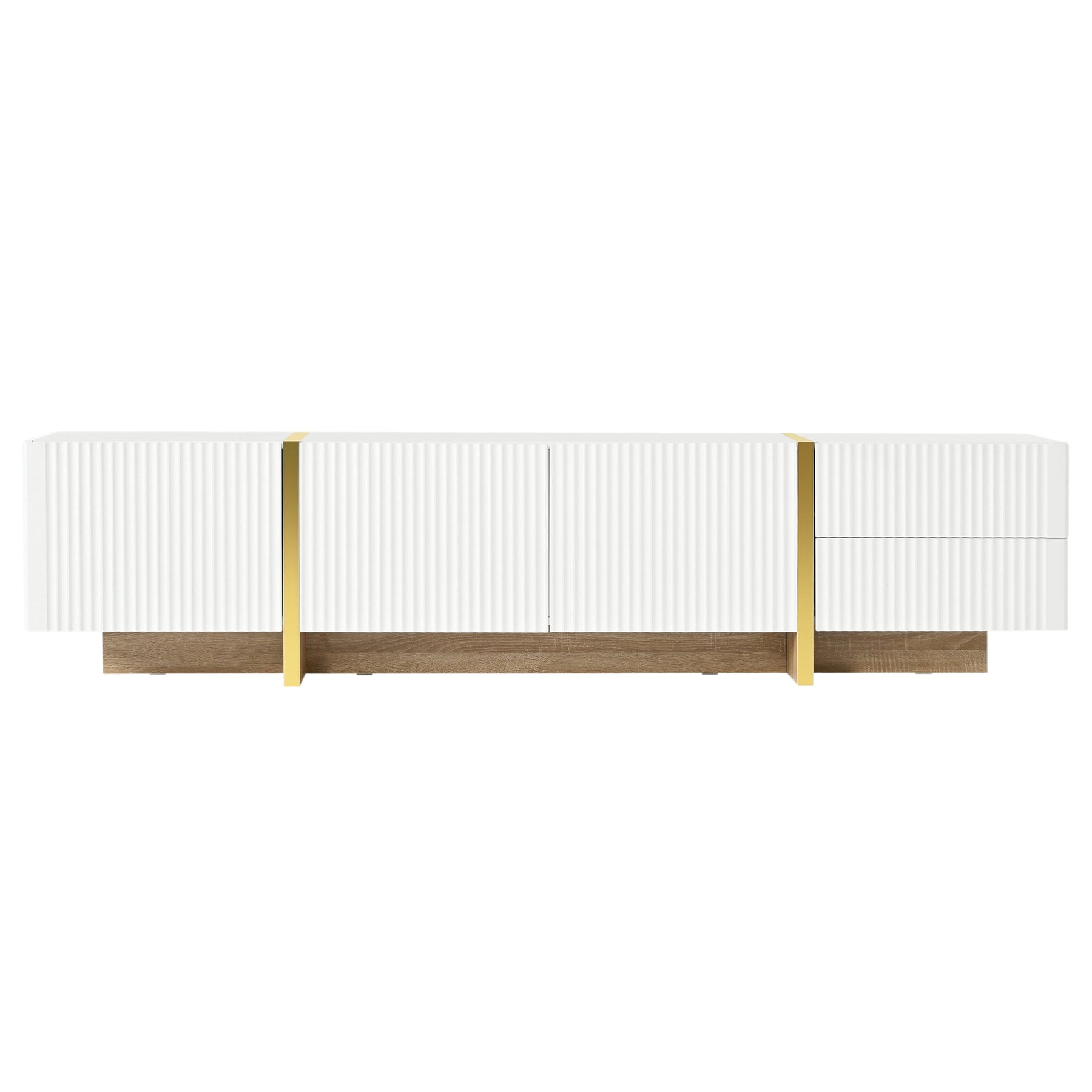 Featuring smooth fluted panels and golden wood grain legs, this TV stand emanates a luxurious elegance that harmoniously complements a wide range of modern furniture styles. It displays a distinctive, three-dimensional, and high-end aesthetic, adding beauty and personalization to any space.