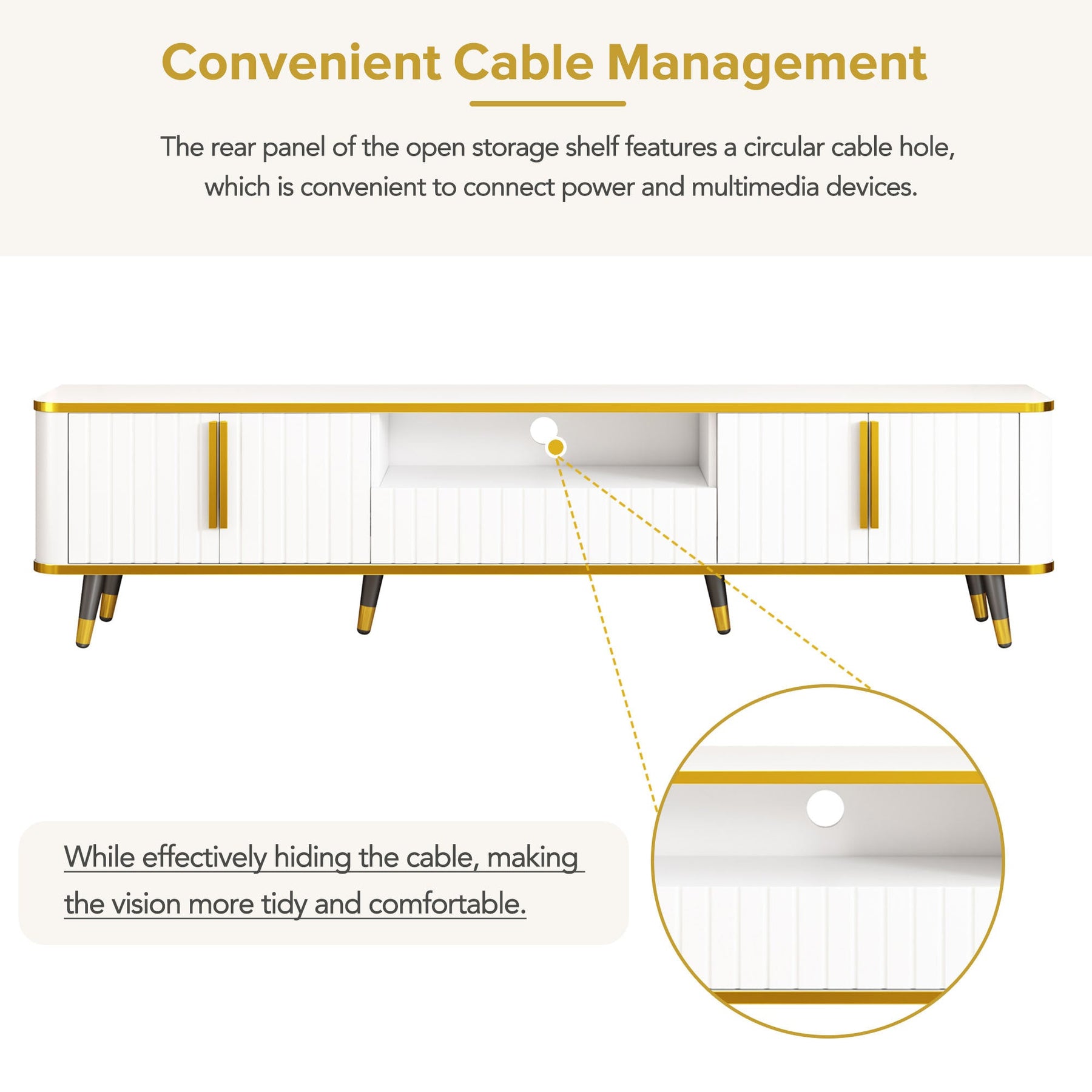 ON-TREND Luxury Minimalism TV Stand with Open Storage Shelf for TVs Up to 85', Entertainment Center with Cabinets and Drawers, Practical Media Console with Unique Legs for Living Room, White