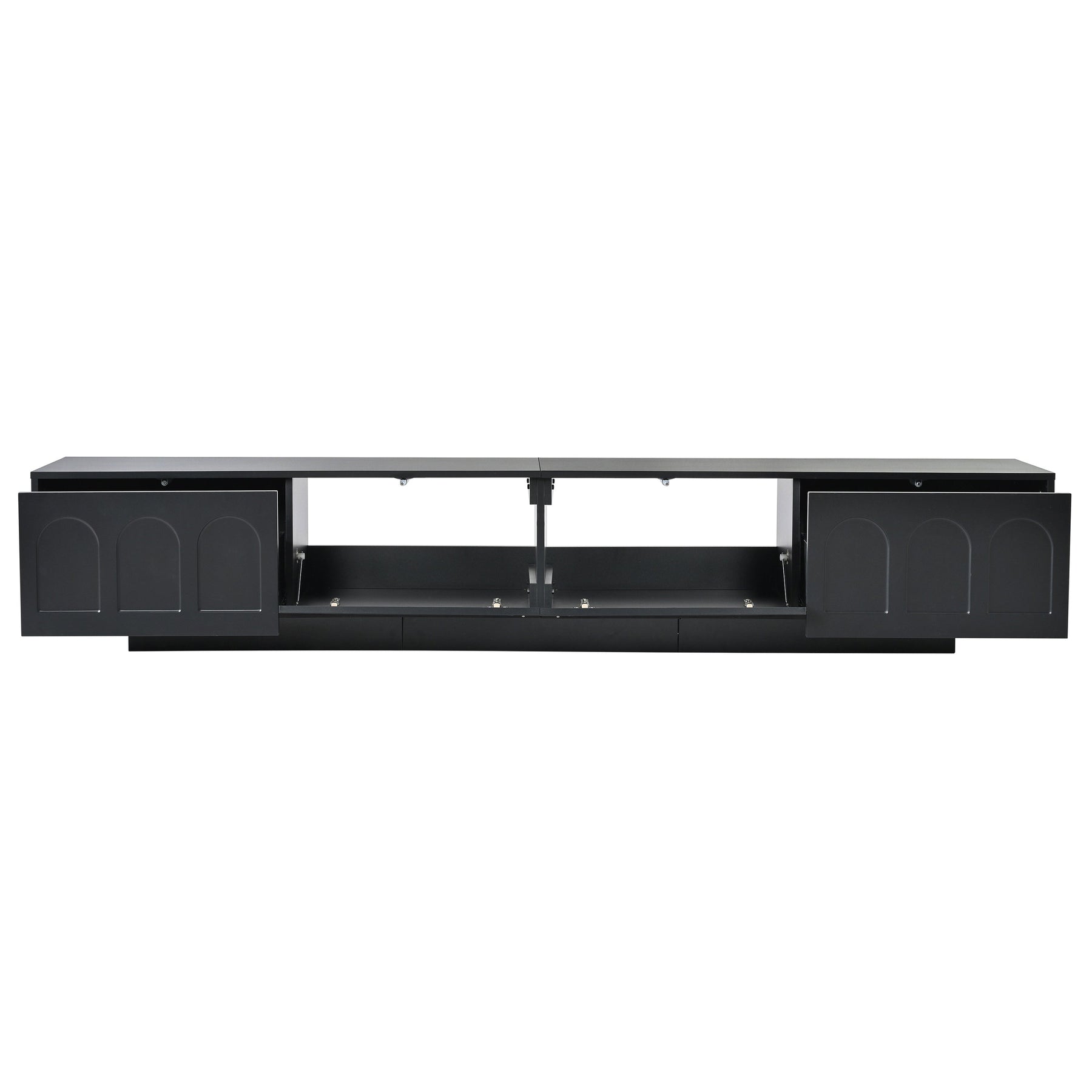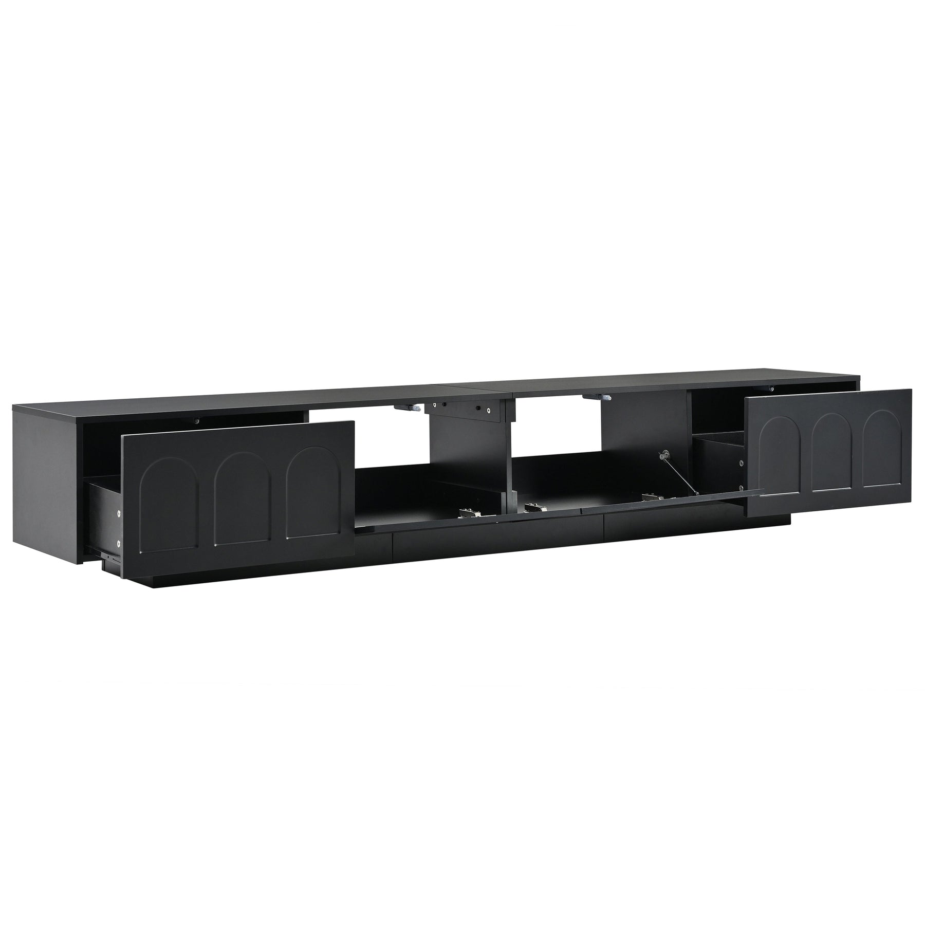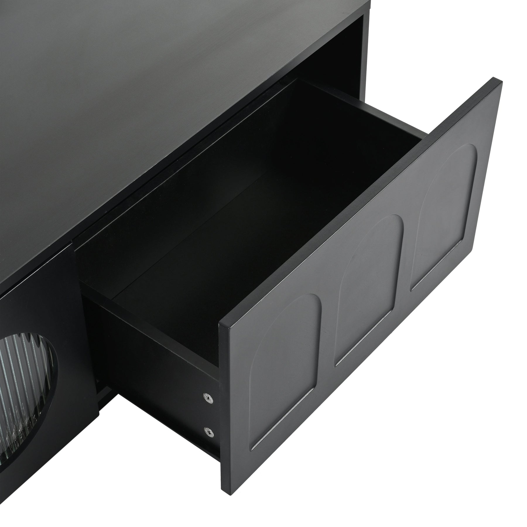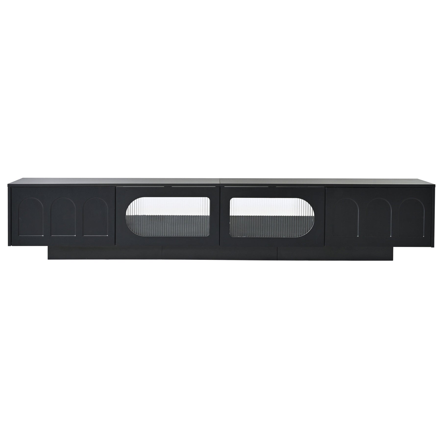This TV stand boasts a distinctive geometric design, which gracefully enhances the cabinet's overall aesthetic with a contemporary and sleek touch. The fluted tempered glass arched doors, being translucent, offer a seamless view of the contents within, while imparting an unparalleled style.