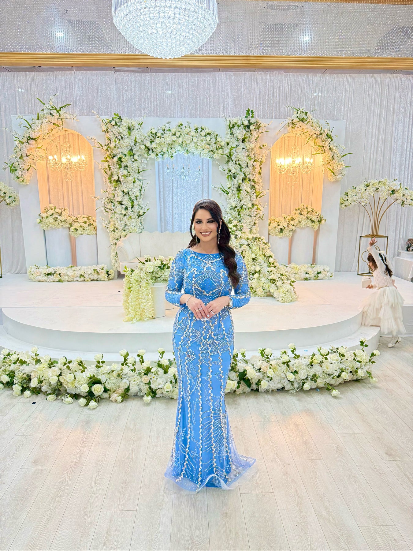 Fully Embellished: Every inch of the Fariza gown is a testament to meticulous craftsmanship. The hand-embellished sequins and stones create a constellation of shimmer across the fabric, offering a dazzling effect that captures and reflects light from every angle. The full-body beading ensures that the wearer stands out as a pinnacle of glamour at any sophisticated gathering.