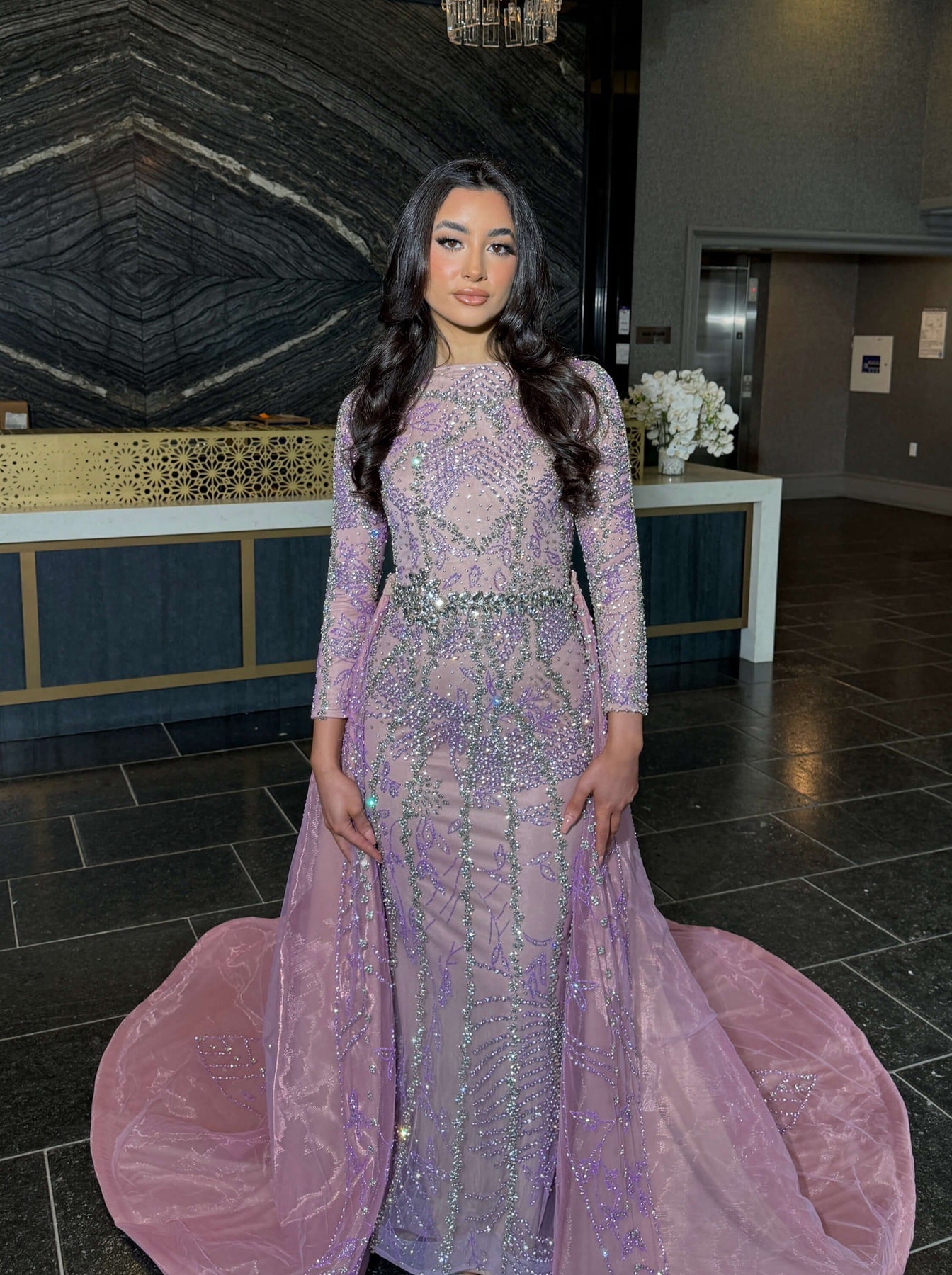 The Fariza Long Sleeve Modest Beaded Embellished Evening Dress by Iyza Belaar exemplifies modesty sophistication with its full-body embellishments and modest design. The lilac, pink, and silver formal gown glistens with allover stones and sequins, creating a slim silhouette that celebrates both luxury and elegance. Perfect for a wide array of events, this dress ensures you shine with uniqueness and grace.