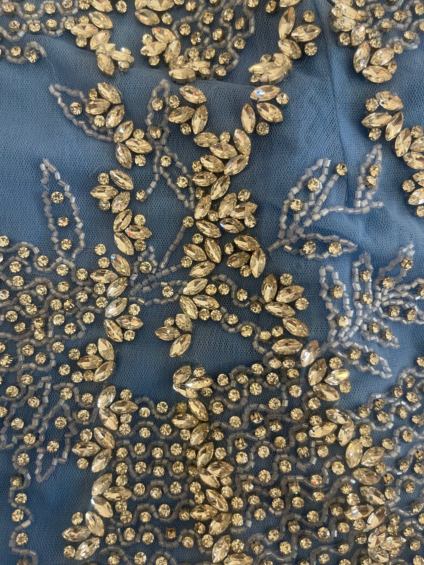 Beaded Silver Belt: At the waist, a beaded silver belt cinches to accentuate the silhouette. This feature not only highlights the wearer's shape but also serves as a sparkling transition that brings balance to the gown's elaborate beadwork. It's a thoughtful detail that amplifies the gown's opulence while maintaining a seamless design.