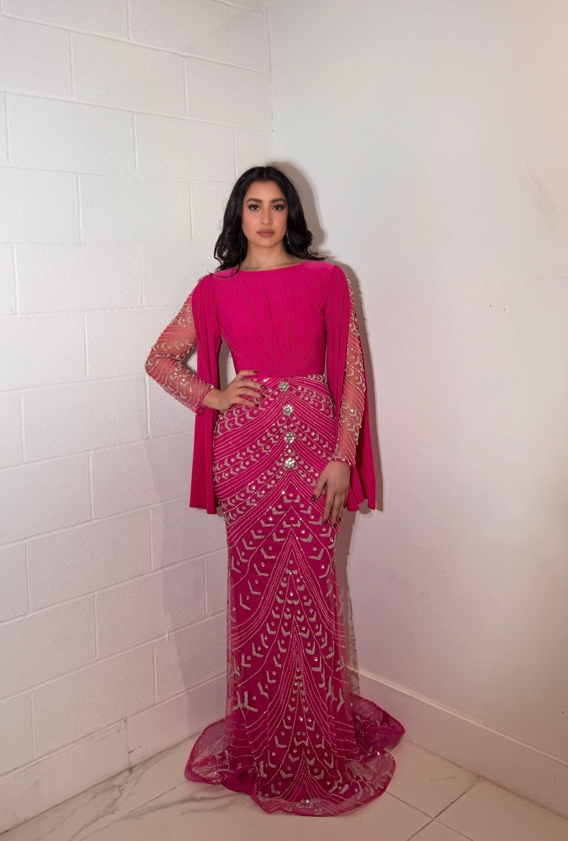 Simple Yet Dramatic Design: The Hosai dress strikes the perfect balance between simplicity and drama. The top features a smooth, understated jersey bodice that radiates elegance. The inner sleeves are fully lined and adorned with delicate beadwork, adding a subtle touch of glamour. Complementing the simplicity of the bodice are the dramatic cape sleeves that flow gracefully, creating an impactful, statement-making look. This unique combination of simplicity and flair ensures you stand out in any event with both sophistication and presence.