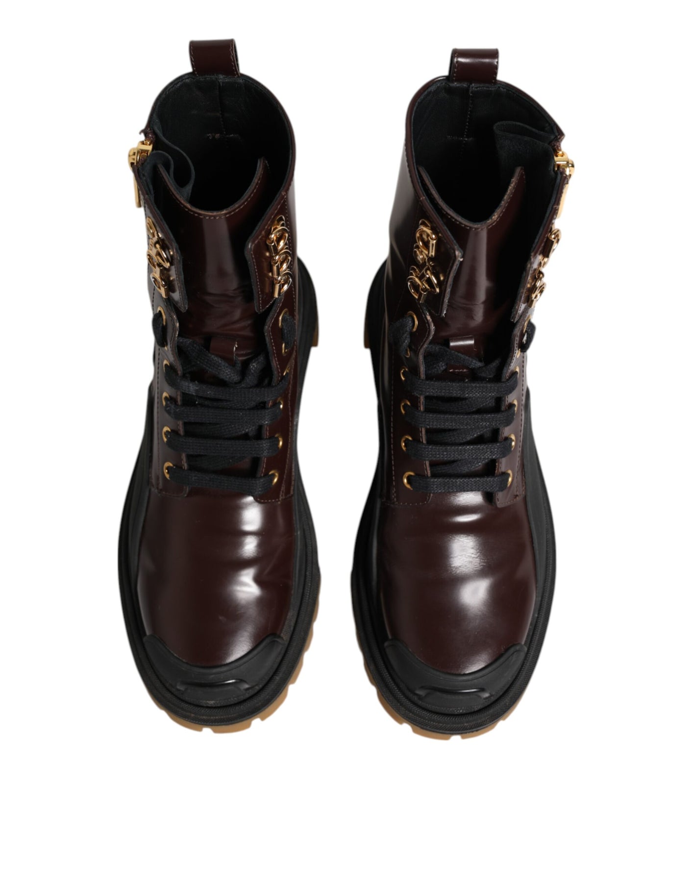 biker boots are crafted from rich maroon leather with a mid-calf height. Featuring a sturdy design with edgy detailing, they blend durability with Dolce & Gabbana’s bold, fashion-forward style.