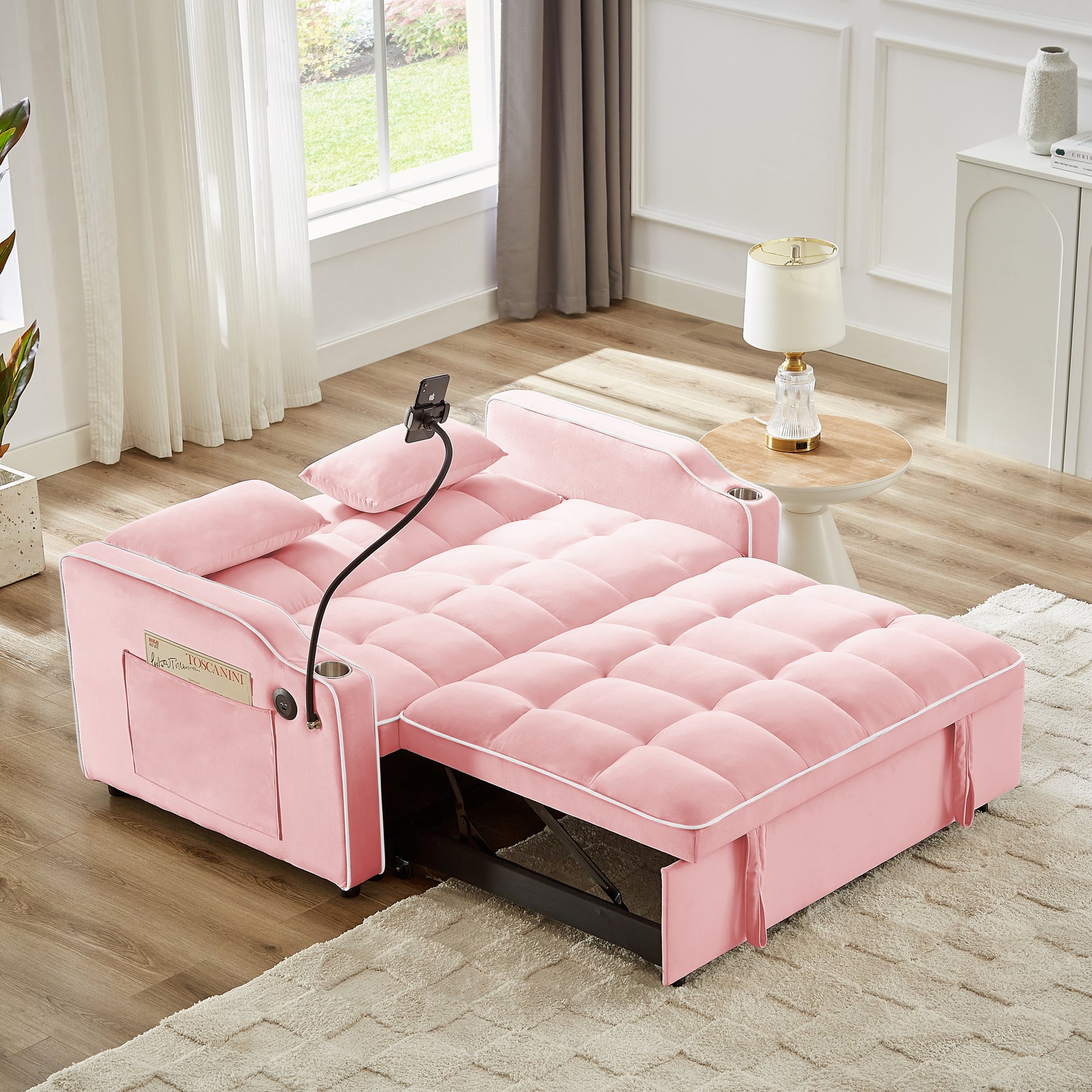 • USB and phone stand:There is a USB charging ports and swivel phone which allowing you to charge your devices and release your hands, let you enjoy watching movies,This sofa bed also comes with 2 soft pillows.