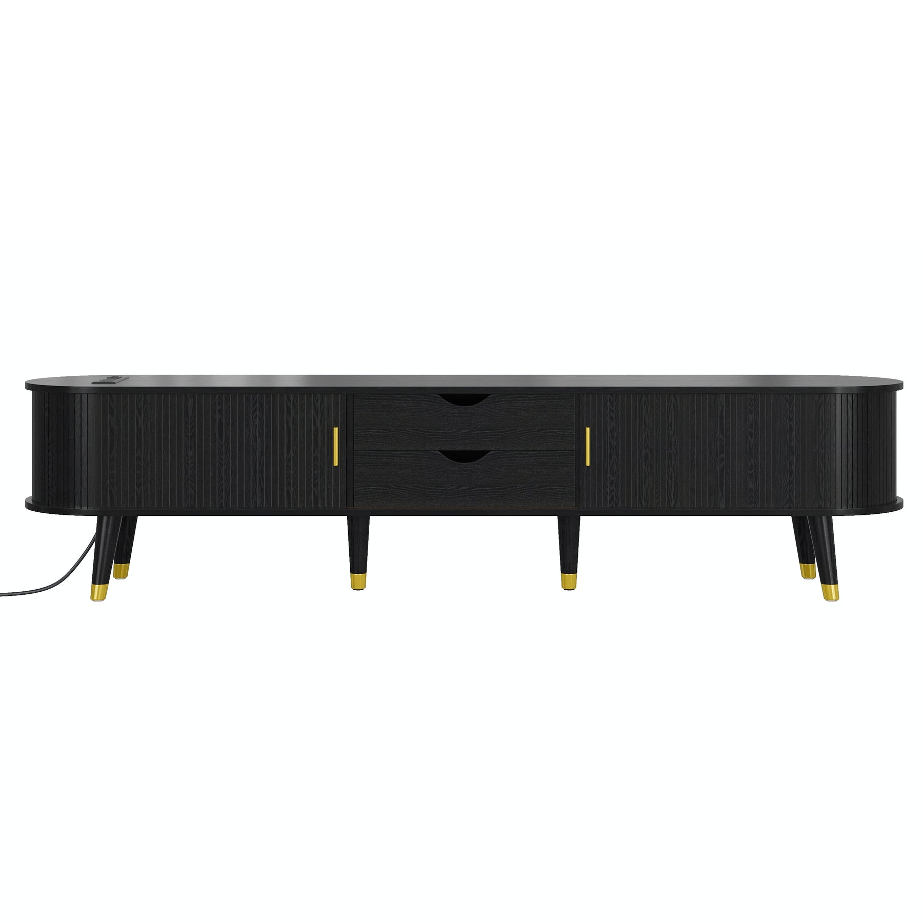 [Assembly Video]Wooden Oval Fluted TV Stand with Charging Station for TV up to 80', Mid-Century Media Console with Sliding Tambour Door, Farmhouse TV Cabinet with Golden Handle for Living Room, Black