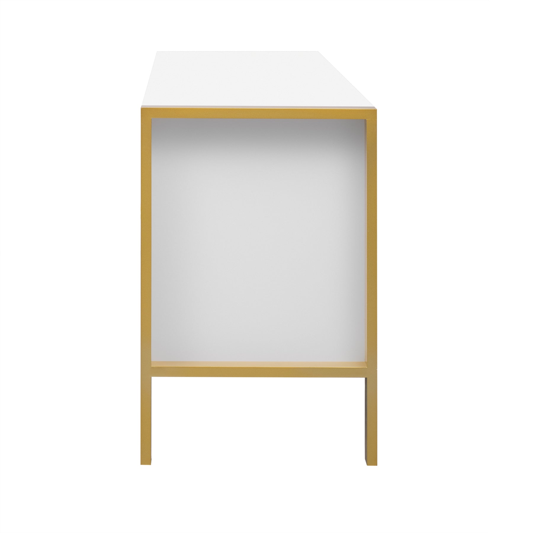 • This TV stand’s most striking feature is its golden metal framework, which serves as a glamorous highlight on either side, providing a stylish, symmetrical balance to the structure and standing out against the overall color of the piece to create a bold contrast that catches the eye.