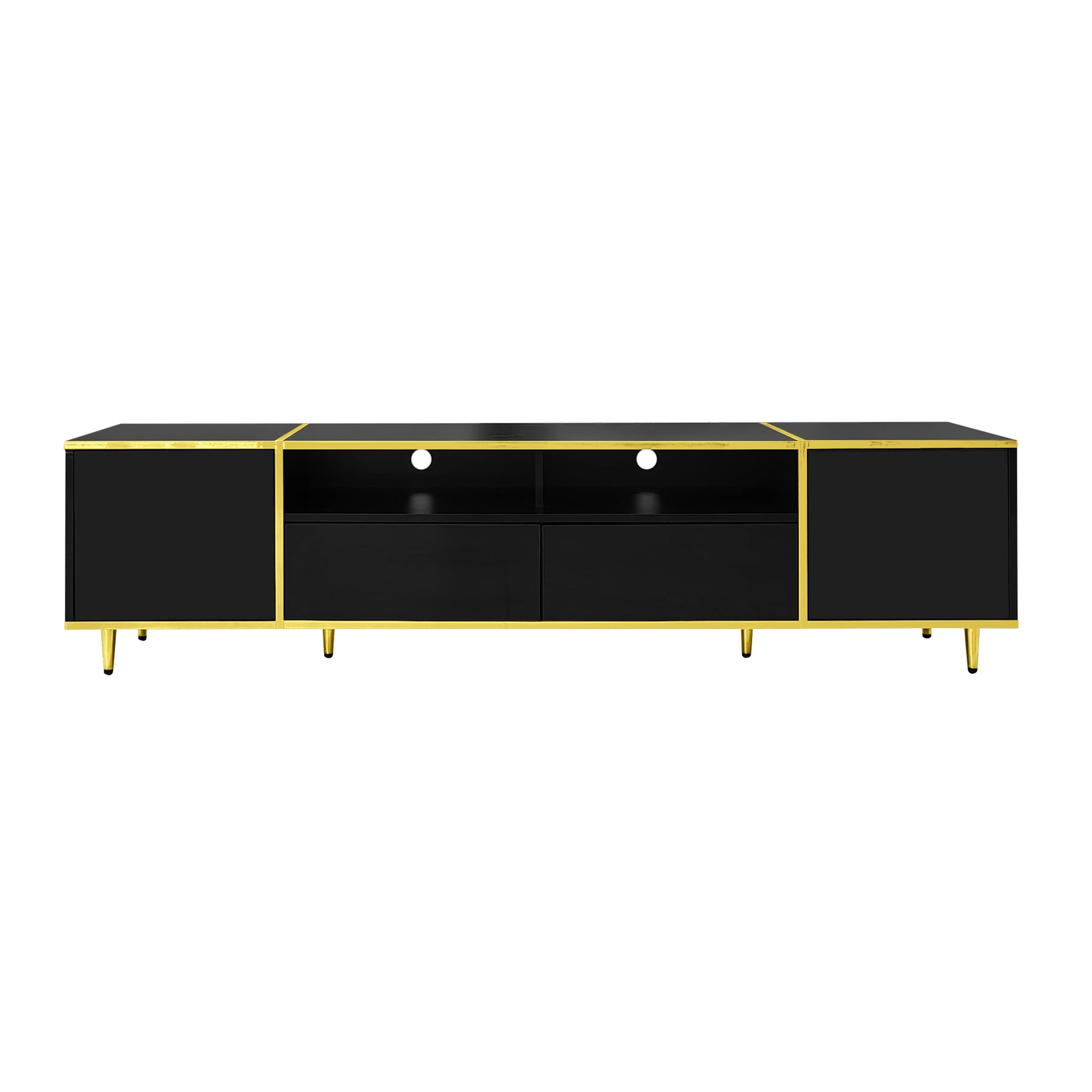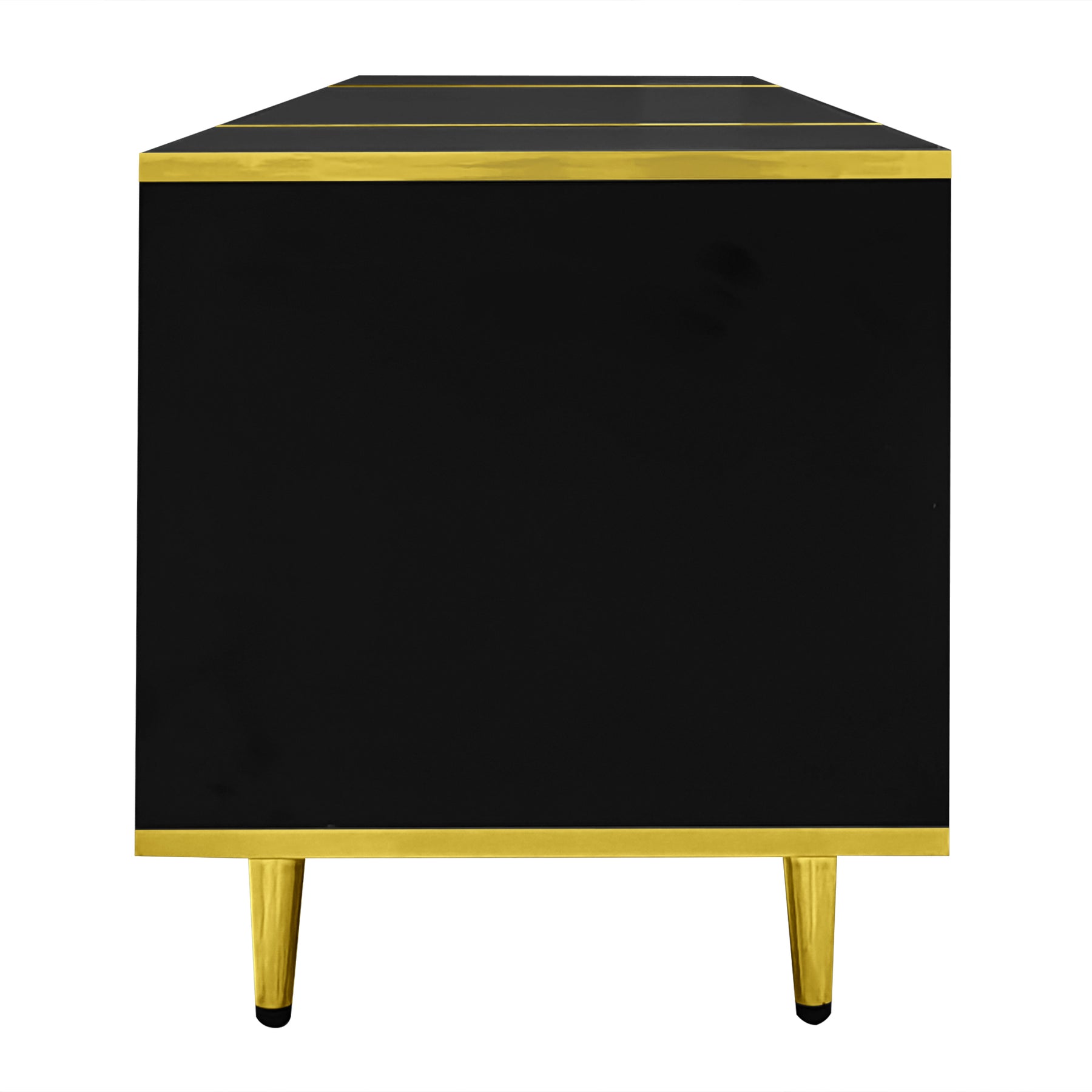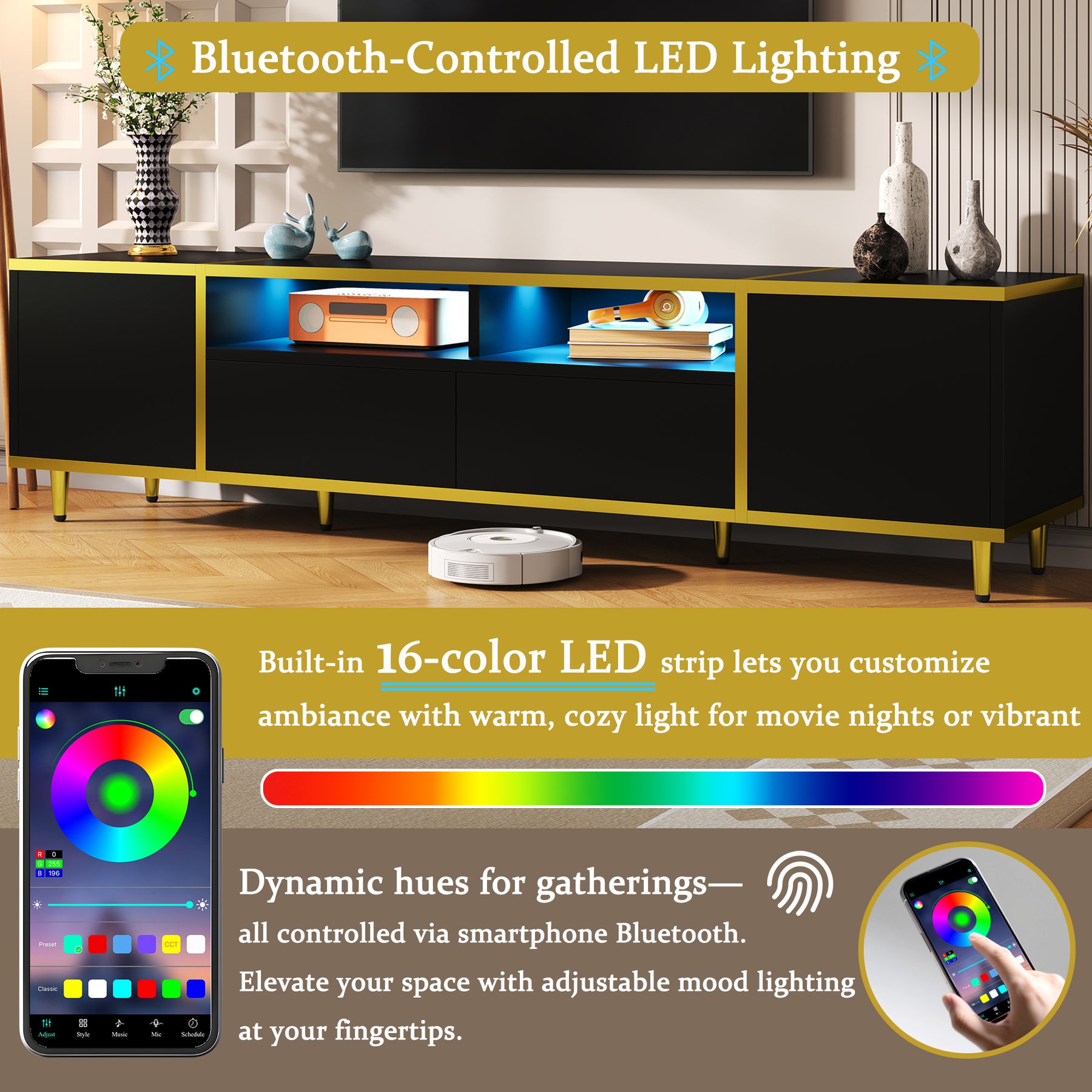 Elevate your living space with this versatile TV stand, featuring 2 cabinets, 2 drawers, and 2 open shelves to organize media devices, collectibles, or decor with ease—tuck away gaming consoles, store remotes, and showcase art for a clutter-free haven in any home, from cozy apartments to spacious living rooms. The sleek golden trim strips, 6 shiny metal legs, and a built-in 16-color LED strip controllable via Bluetooth add upscale glamour with modern flair, making it a perfect fit for minimalist style while doubling as a stylish statement piece. Crafted from premium, durable materials, it withstands daily use with a sturdy frame and smooth surfaces, maintaining beauty and functionality for years. Six solid metal legs ensure exceptional stability and load-bearing capacity, supporting heavy TVs, books, or decor without wobbling—ideal for high-traffic areas. Combining smart storage, elegant design, and long-lasting durability, this TV stand transforms your entertainment area into a harmonious, chic centerpiece that works as hard as it looks.