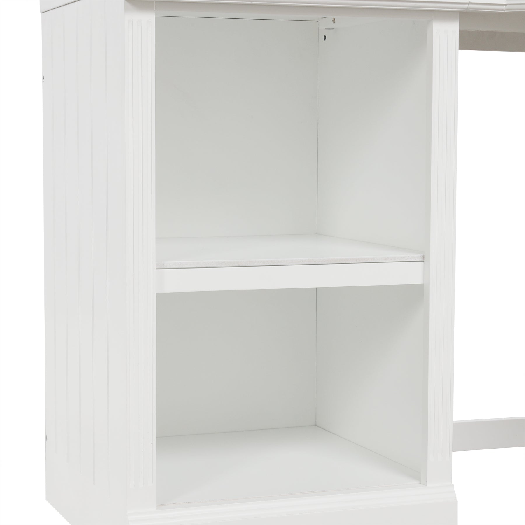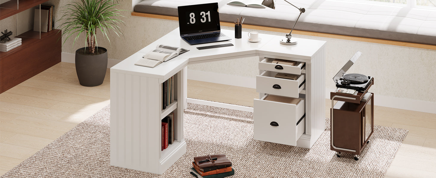 This modern L-shaped desk combines a spacious tabletop, providing ample space for your computer, books, office documents, and other decorative items.