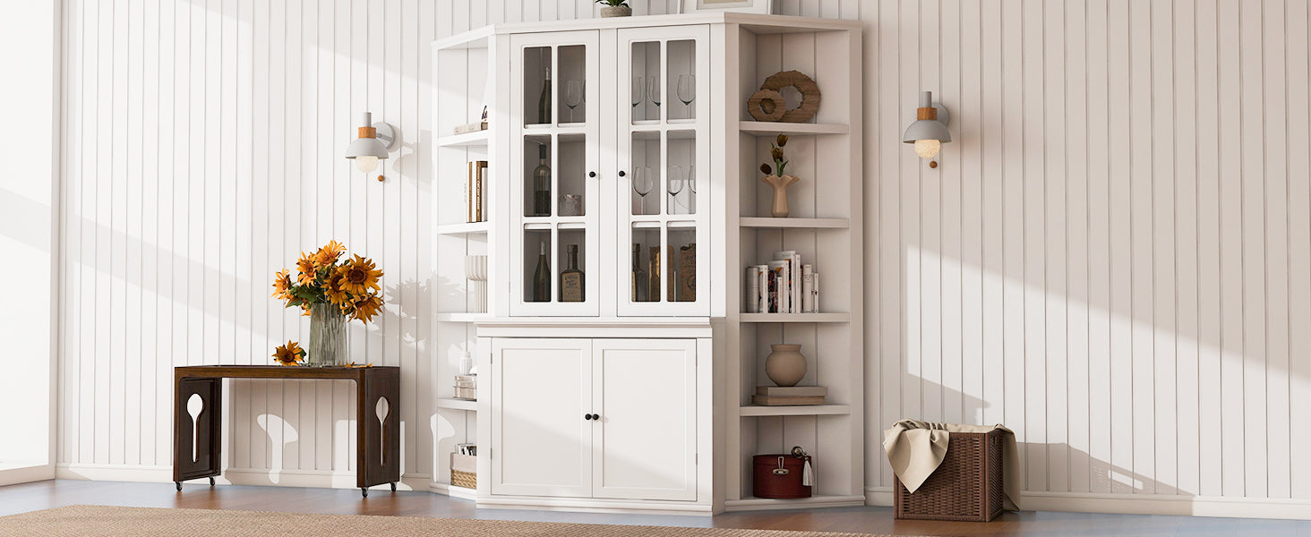 Retro-Modern Wall Suit: This wall suit marries vintage charm with modern functionality, delivering both visual allure and practical storage solutions. It features double glass doors that beautifully display your cherished books, antique collections, or decorative items in the living room. The system also includes two side shelves that offer additional storage space, making it a versatile choice for a study, home office, or hallway. Whether you use it to store documents, display family photos, or organize your reading materials, it adds a touch of timeless elegance to any space while keeping your items neatly arranged. Product Features and Details: 1x Main Display Cabinet: With generous dimensions of 36.25' W x 75.25' H x 24.25' D, the main cabinet allows you to display your prized collectibles dust-free behind two tempered glass doors. 2x Side Shelves: Each side shelf measures 16.75' W x 75.25' H x 16.75' D, providing ample space for additional storage and display. Easy to Assemble: Includes a detailed instruction manual; recommended for two people Easy to Clean: Simply wipe with a dry cloth to maintain its pristine appearance. Package Information: The wall suit is packaged in 4 box.