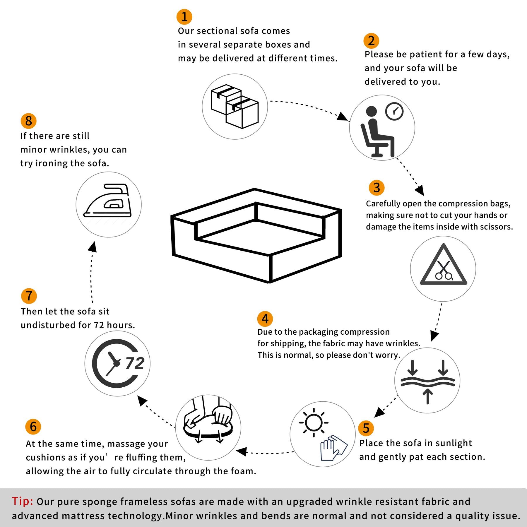 TIP 1 Due to package compression for better shipment, the fabric may have wrinkles.Please take all packages out and pat every part to make it rebound better and fluffy, so that itcan restore to picture-like status.