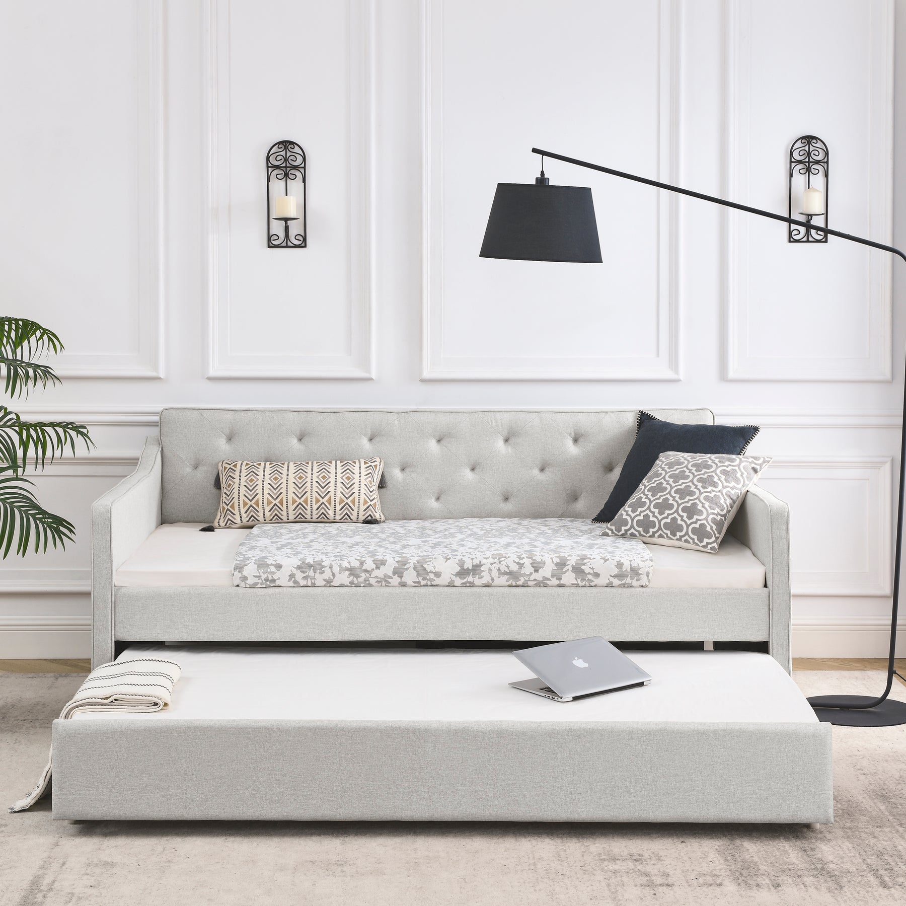 Twin Size Daybed with Twin Size Trundle Upholstered Tufted Sofa Bed,  Waved Shape Arms, Beige (80.5&