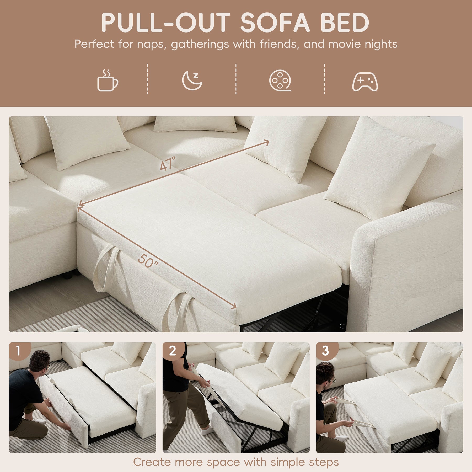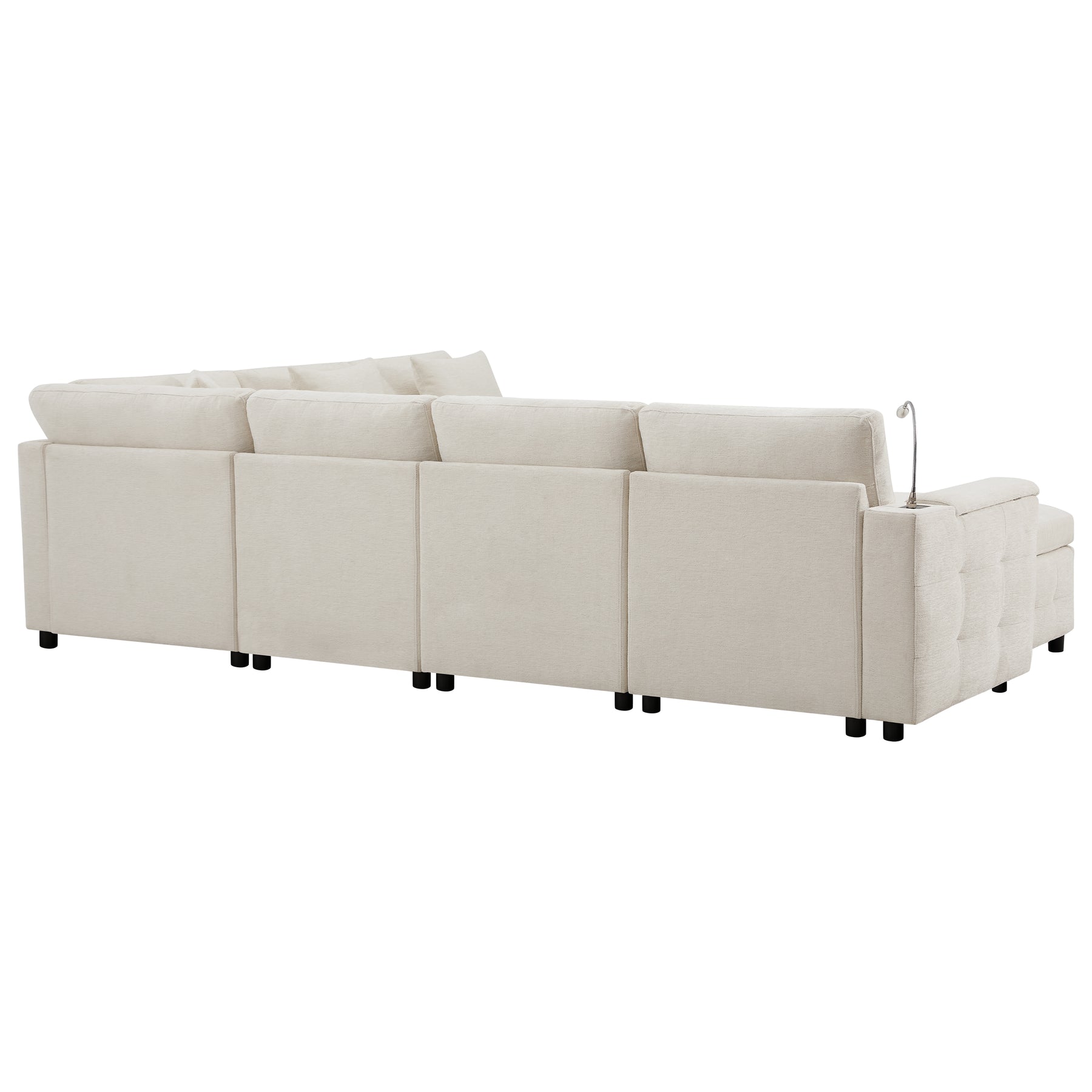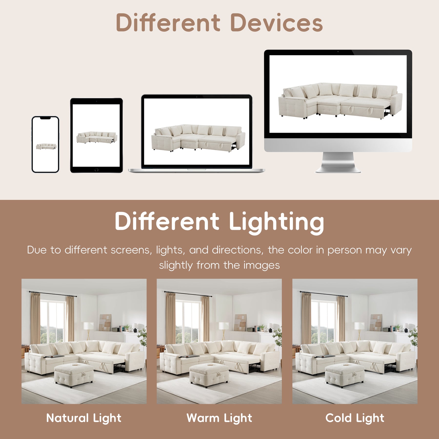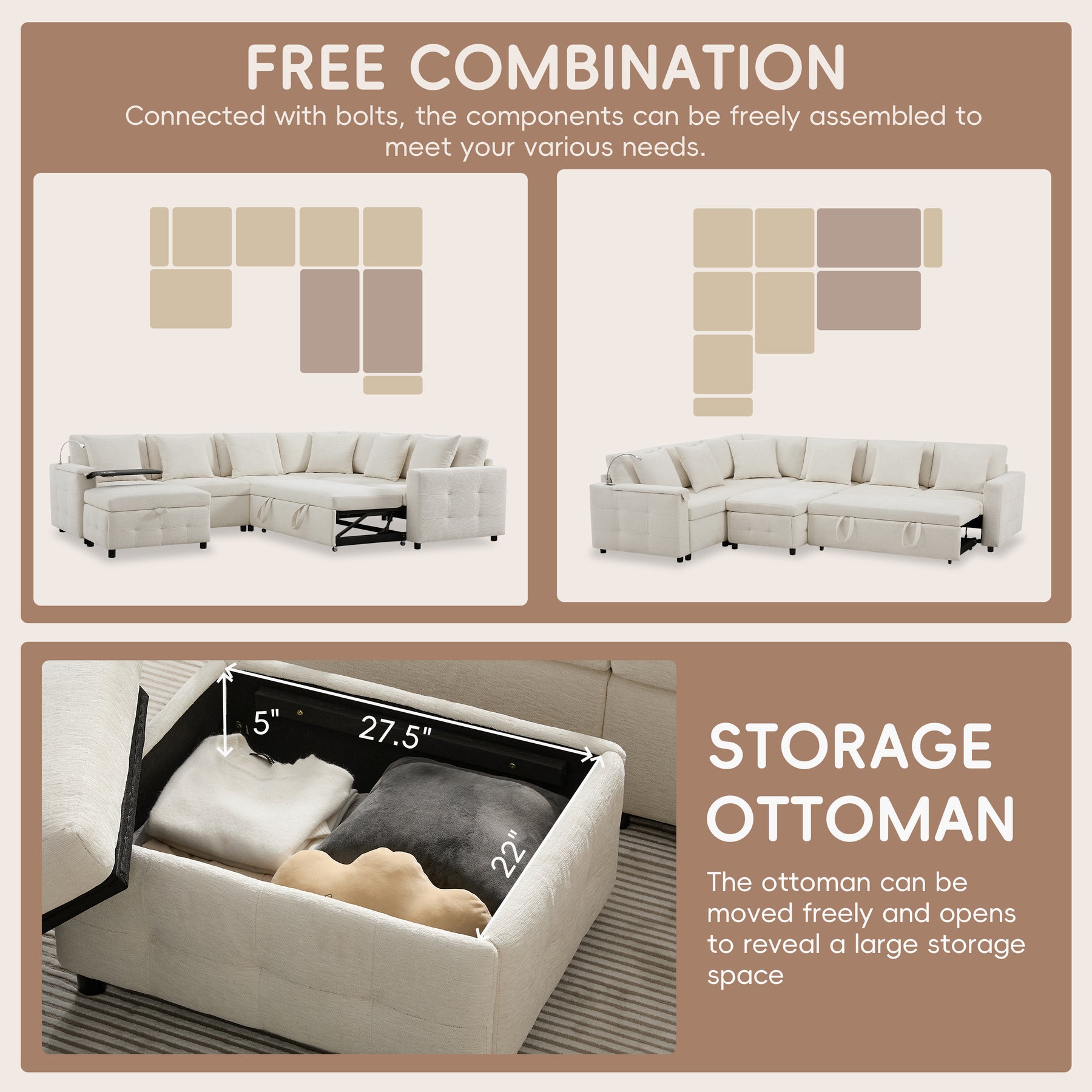 117*90'' Modular Sectional Pull-out Sofa Bed with Flip-up Table Panel, Reading Lamp, Charging Ports, Storage Ottoman, Tufted Design, 6 Pillows, Oversize & Free Combination, Chenille, 2 colors