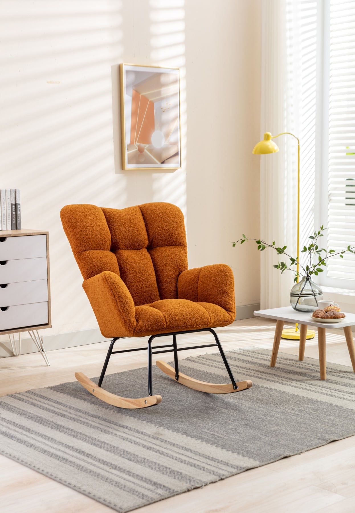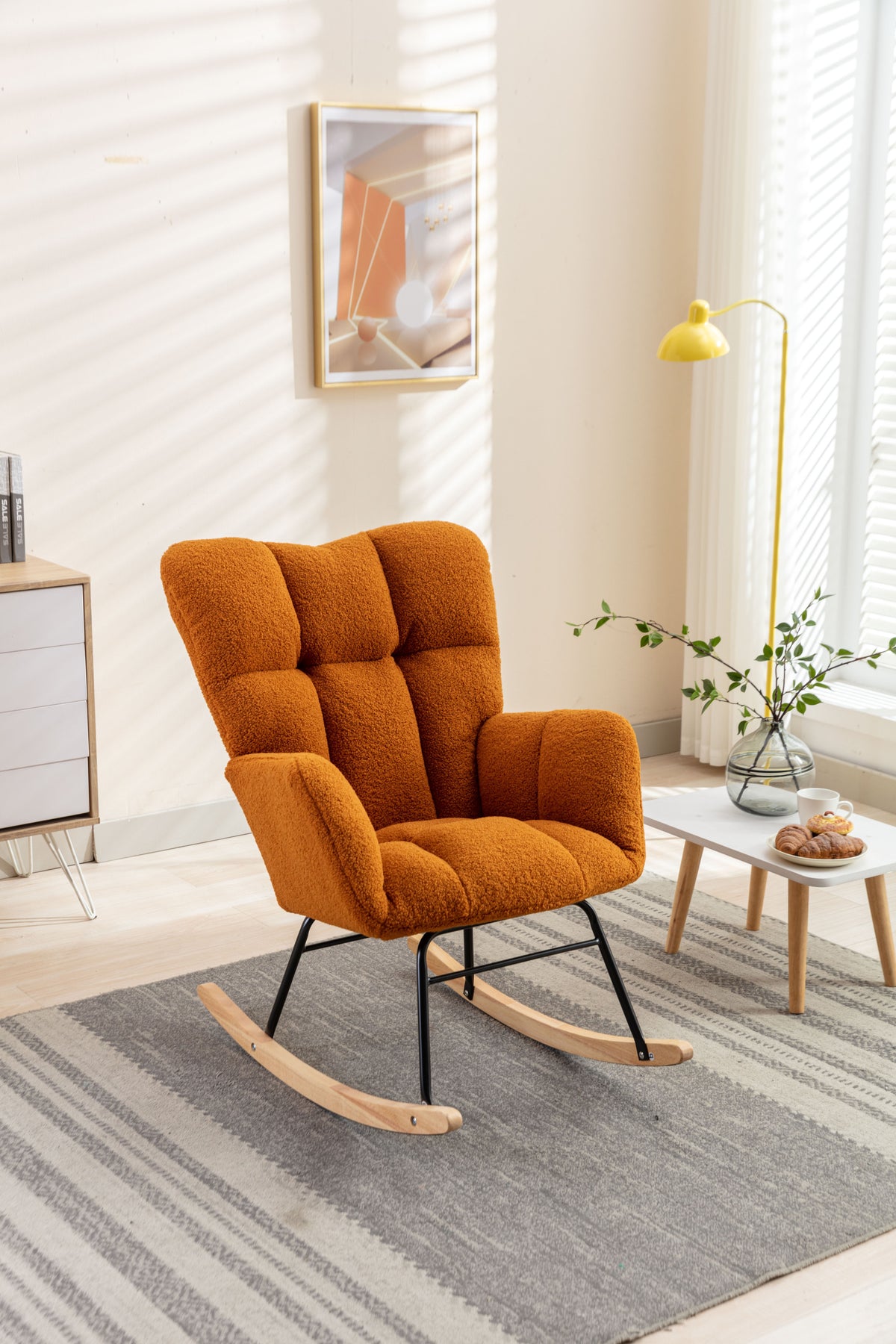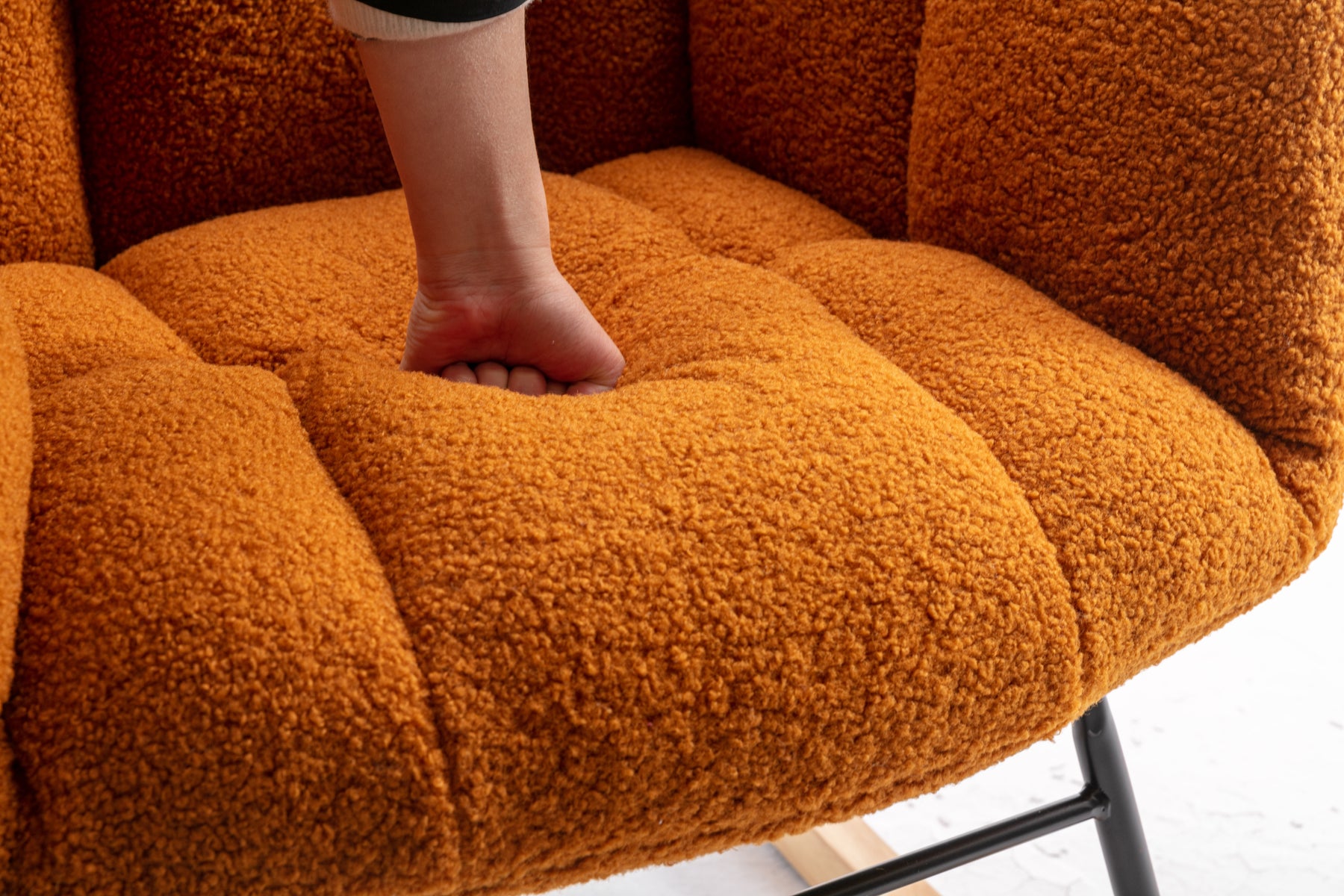 • Product BOM:Soft Teddy Material+Foam Filling+Wooden Frame+Black Paint Metal Base+Wooden Rocking Legs+Upholstered+Floor Protection And Isolation Layer;