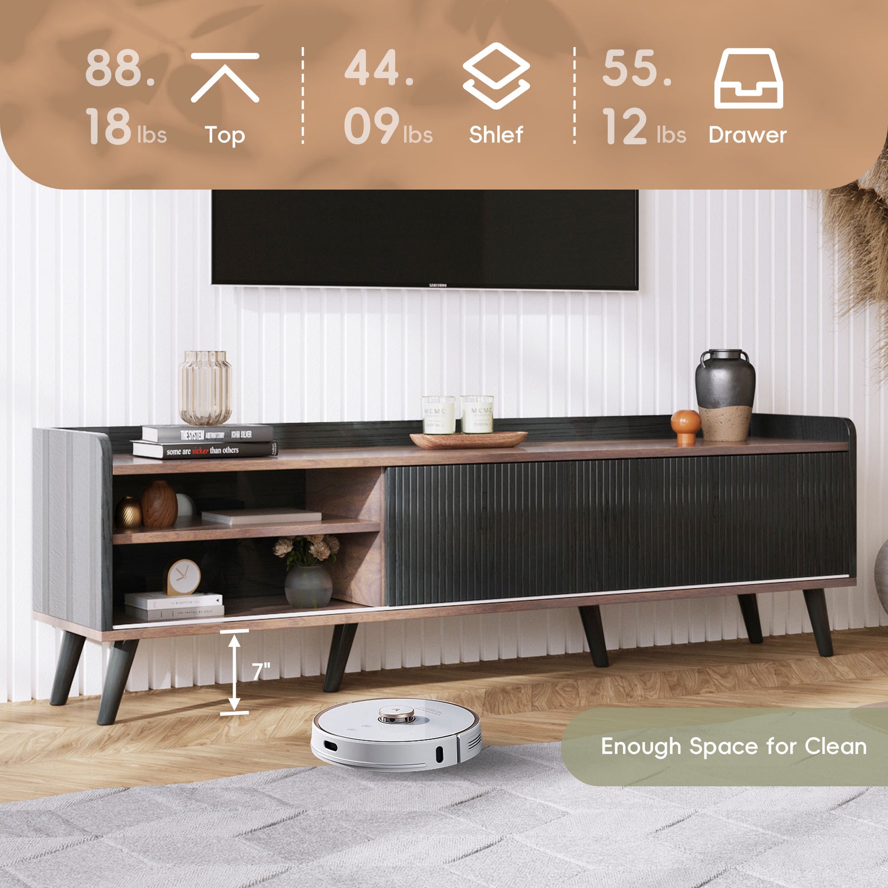 This TV stand comes with two drawers and two sliding cabinets, providing you with ample storage space. The drawers can store daily necessities such as remote controls and sundries to keep the space tidy, while the two sliding cabinets are convenient for you to store larger items.