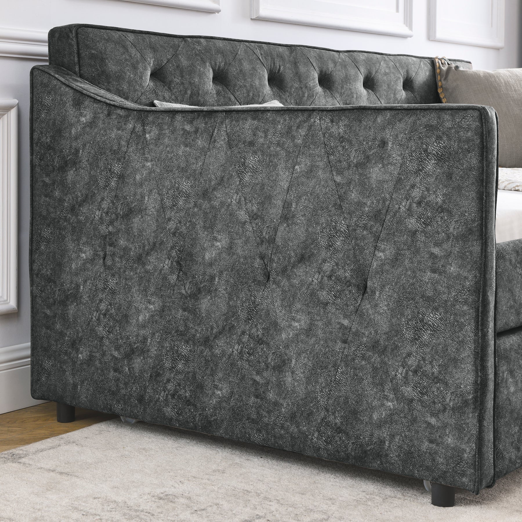 Twin Size Daybed with Twin Size Trundle Upholstered Tufted Sofa Bed,  Waved Shape Arms, Grey (80.5&