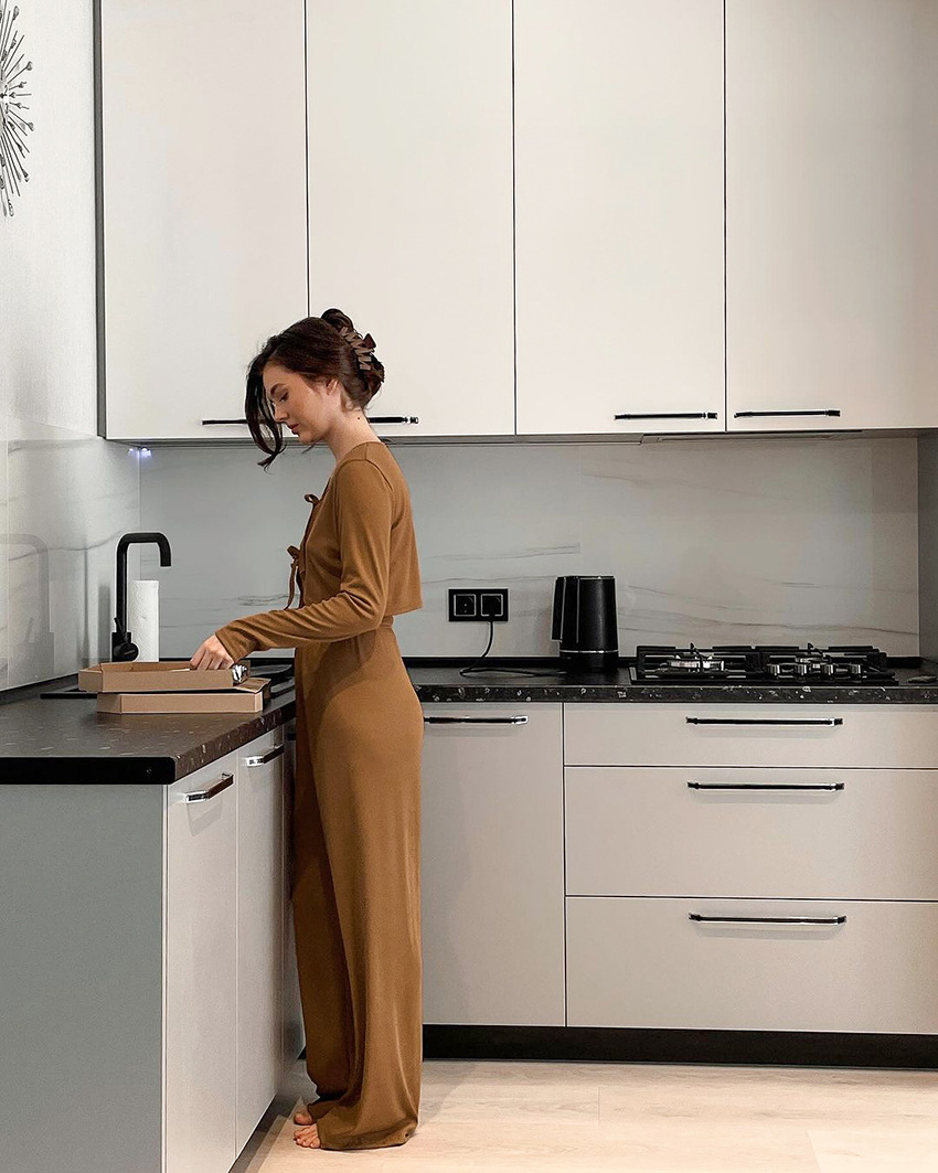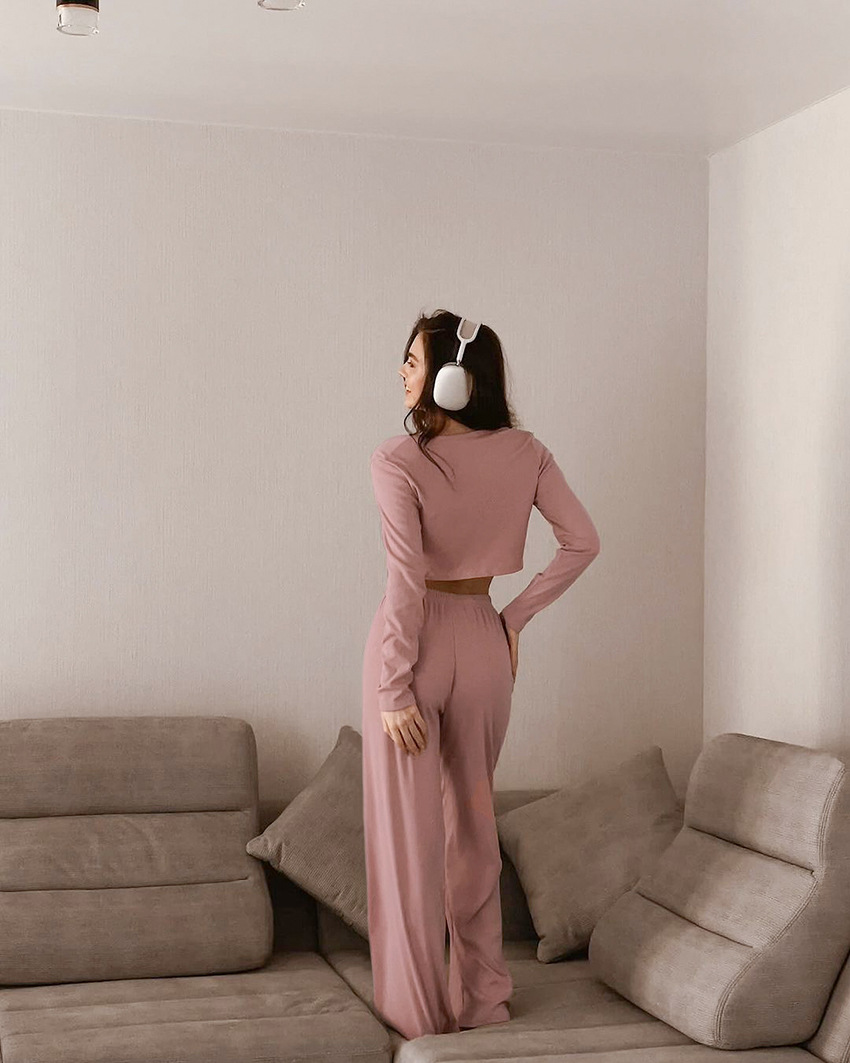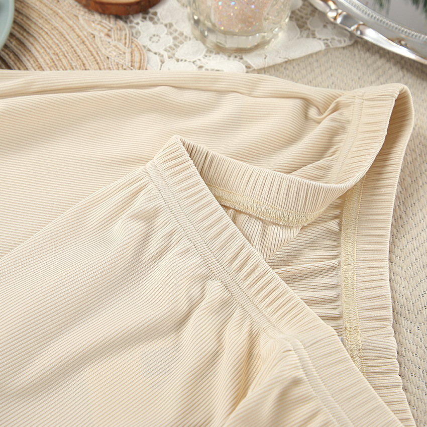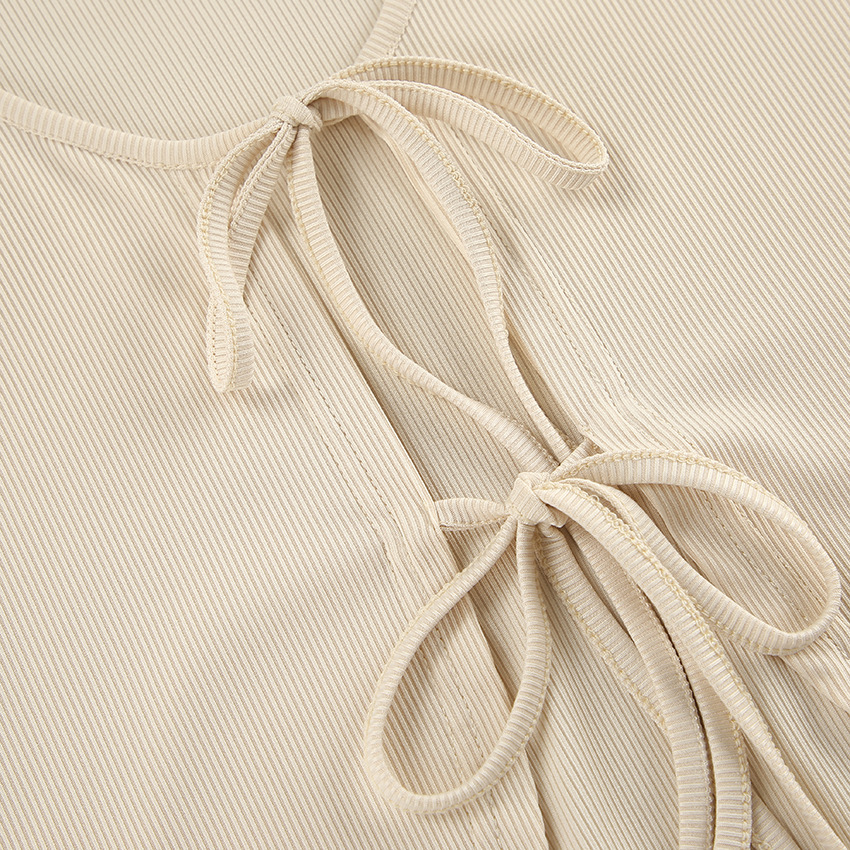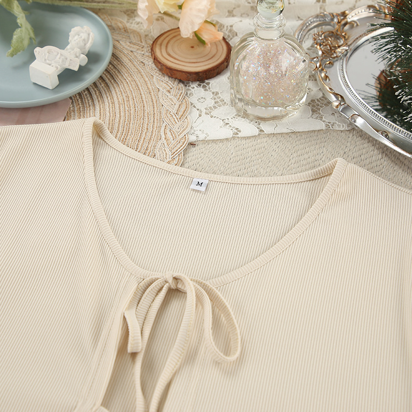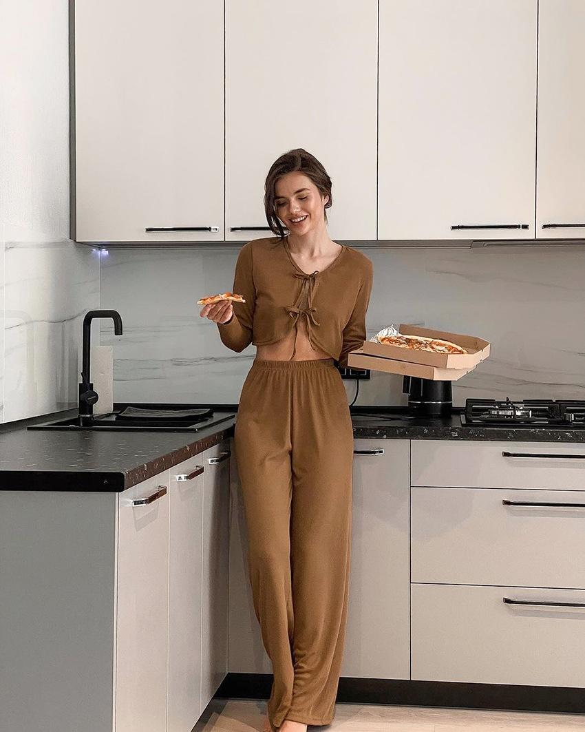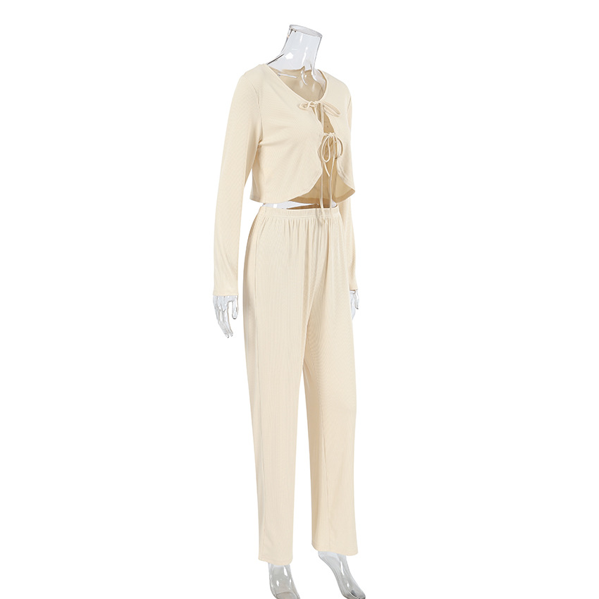 Autumn Winter Long Sleeve Lace up Trousers Two Piece Pajamas Knitted Sunken Stripe Ladies Homewear