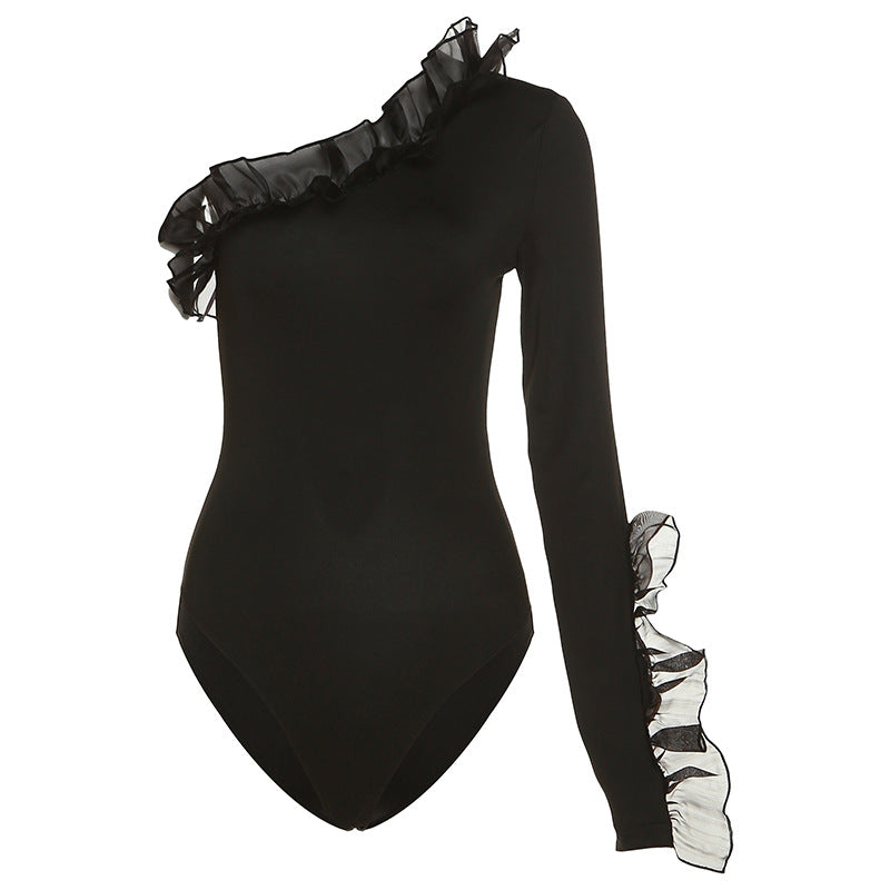 Autumn Winter Women Clothing Mesh Flying Shoulder Sleeve Slim Sheath Bodysuit T shirt for Women