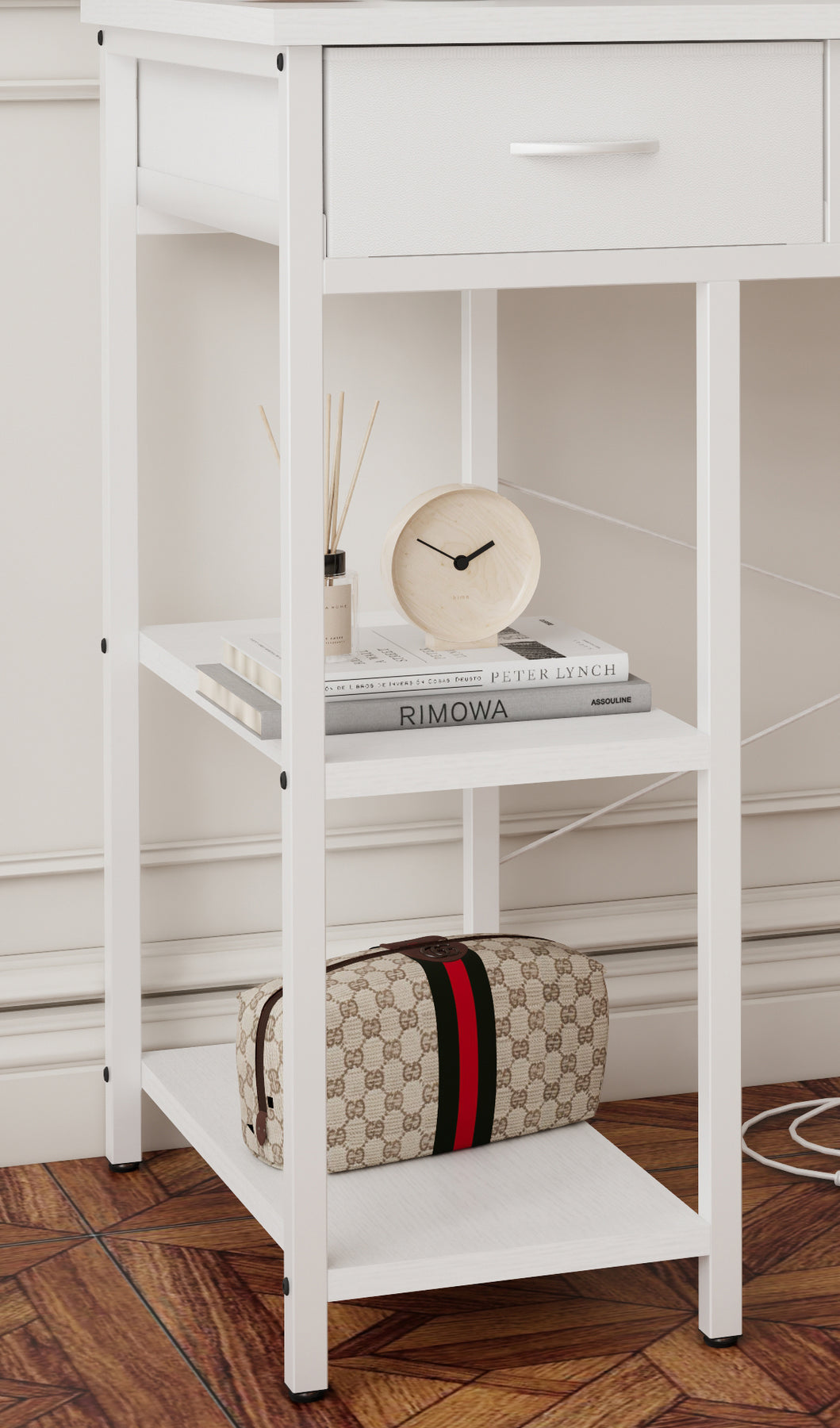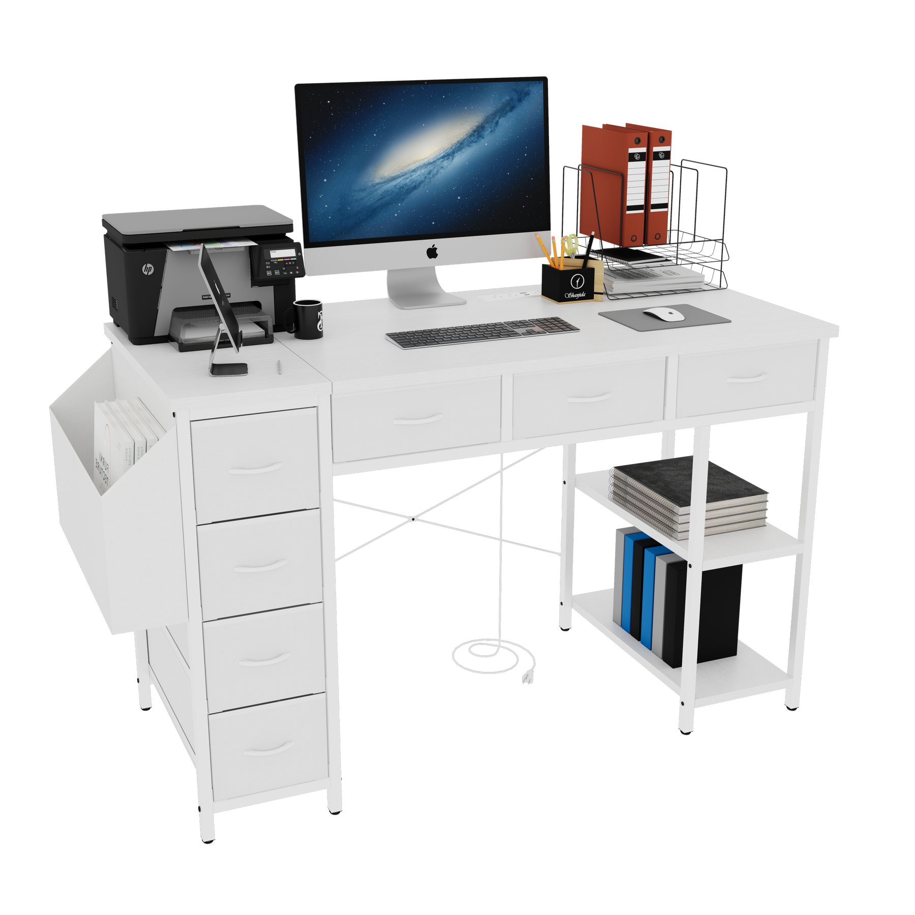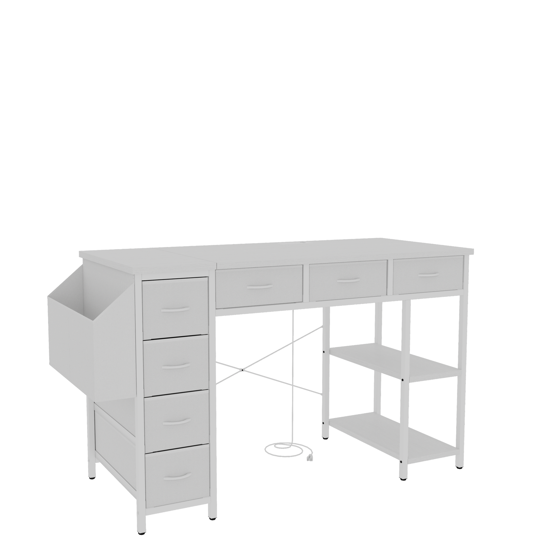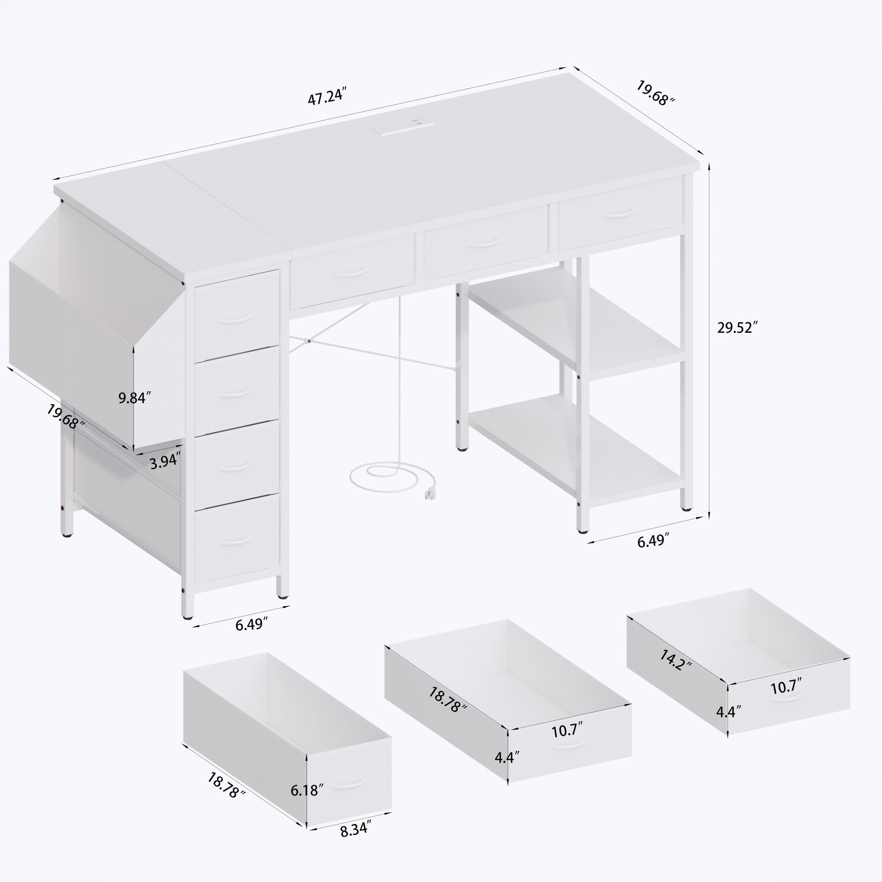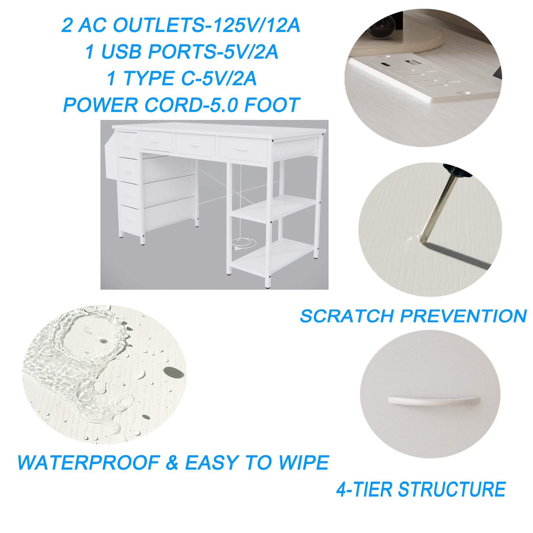 47' Computer Desk With Power Outlet,Writing Desk,Home Office desk,Vanity table with 7 Fabric Drawers, Large Side Pocket,White