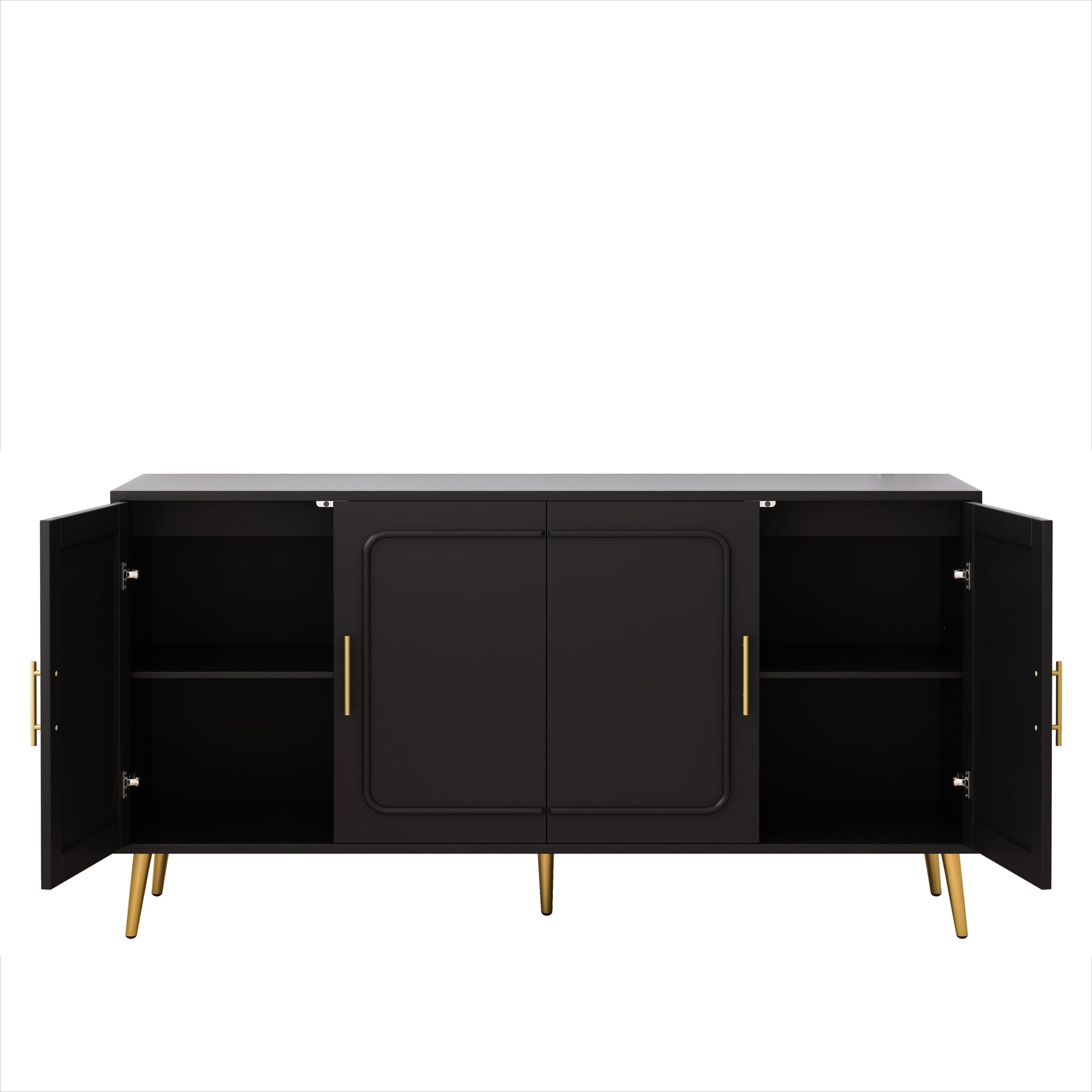 • 1、Elegant Design: The Four-door cabinet features a sleek black finish complemented by stylish gold feet, making it a perfect addition to any modern home decor.