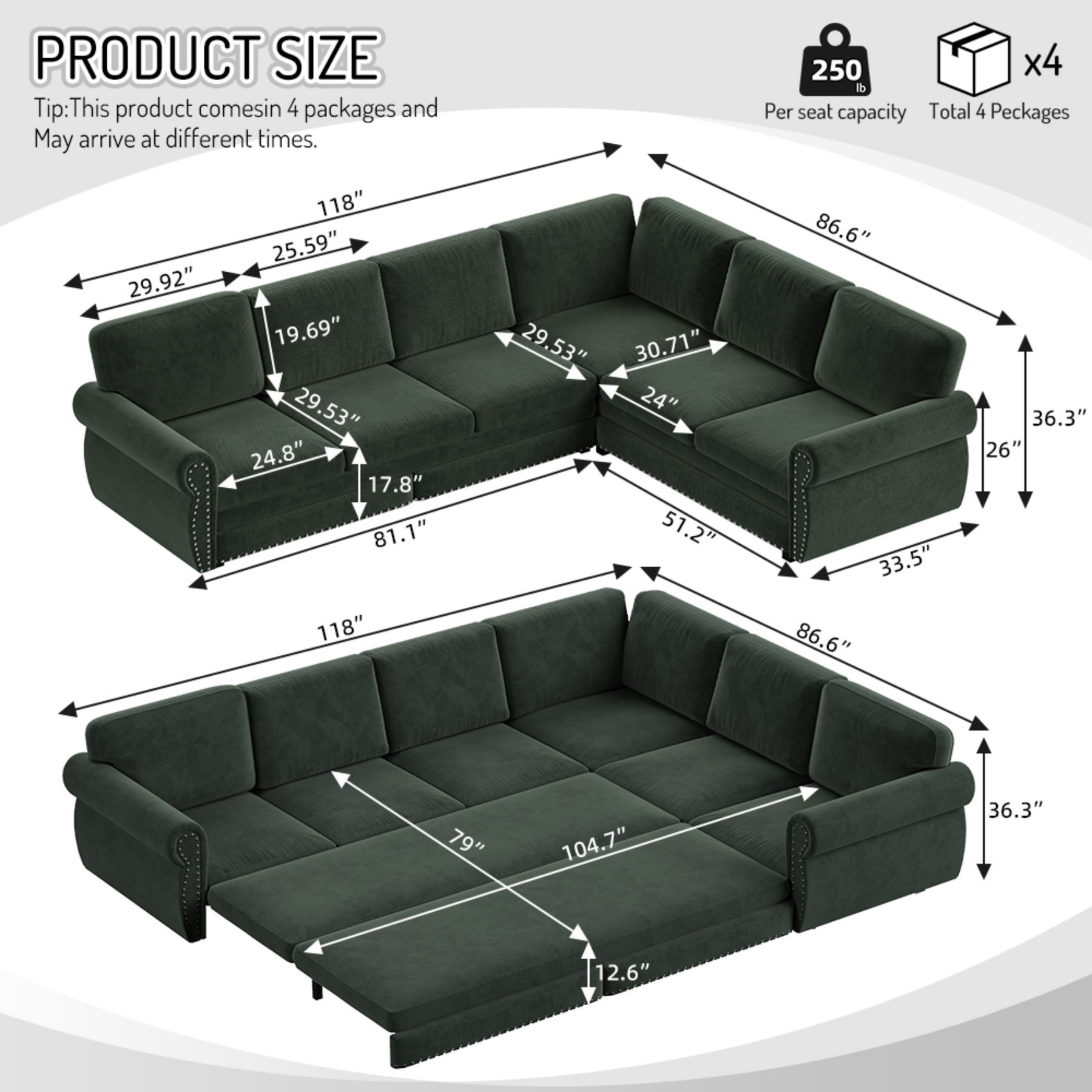 Overall Dimension | Sofa Size: 118'L x 86.6'W x 36.3'H Bed Size: 104.7'L x79'W x 12.6'H |