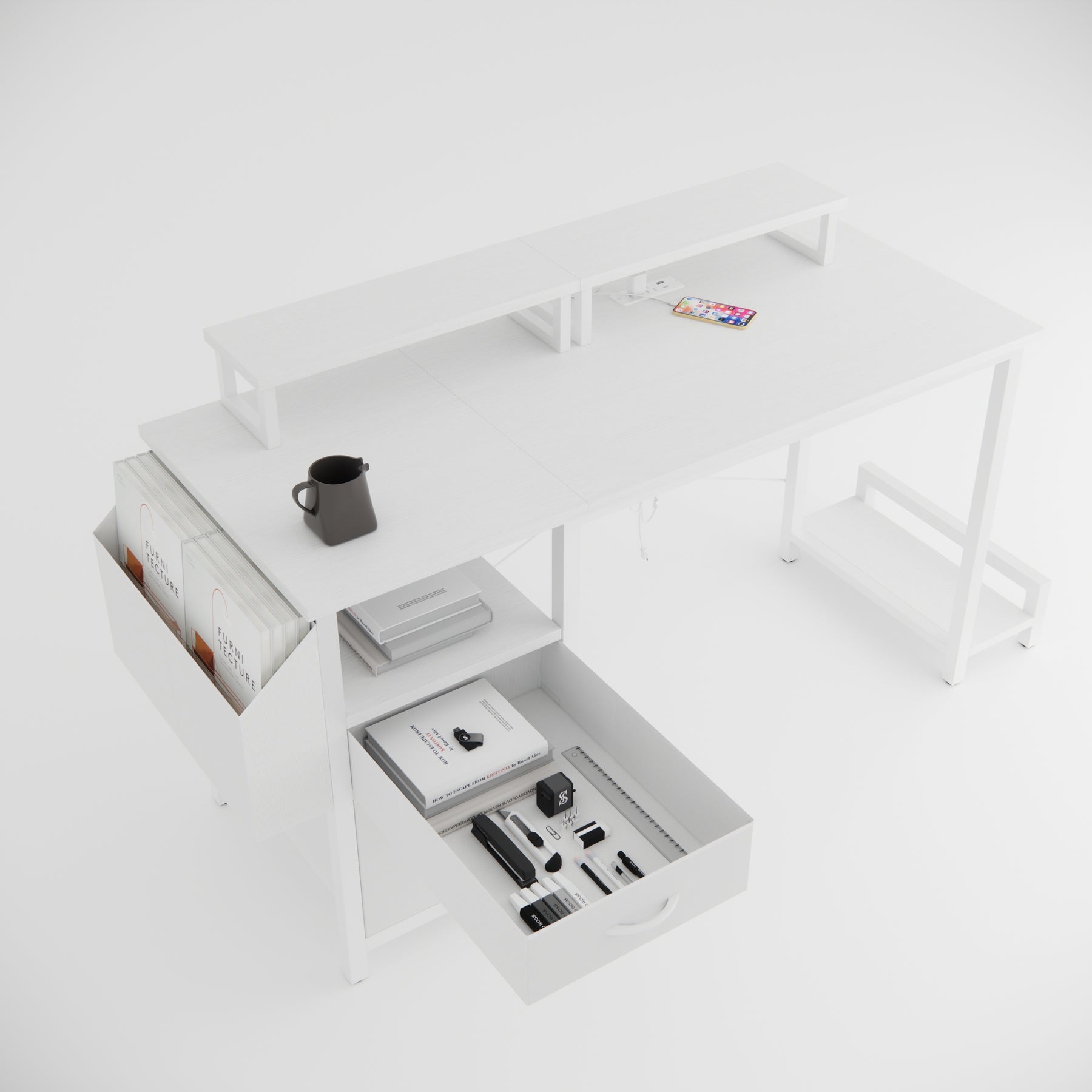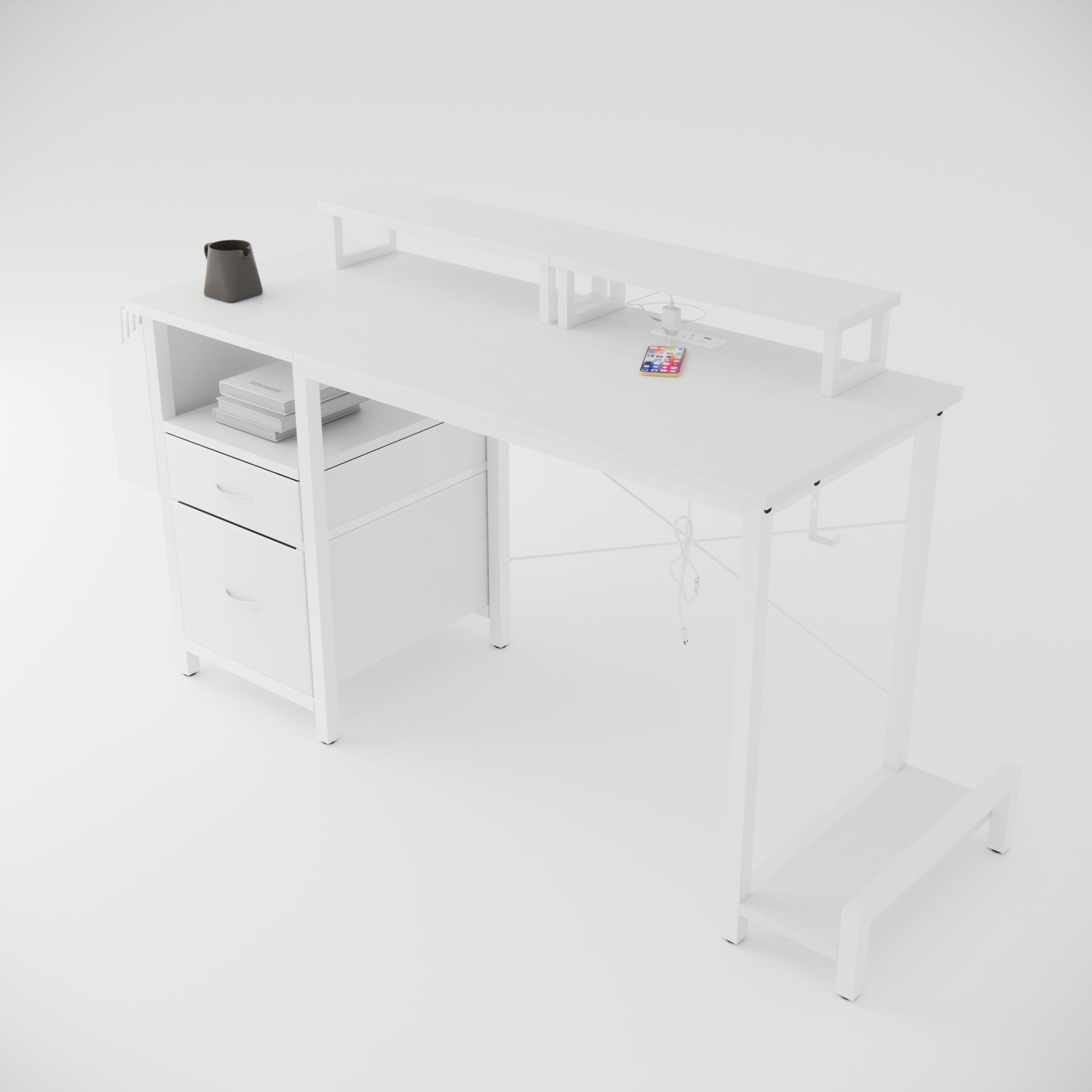 47.3'office desk with power outlet,2 Monitor Stands,2 drawers,Side Pocket,Easy to Assemble,Frame stability Reversible,use for home desk, computer desk, game table,White