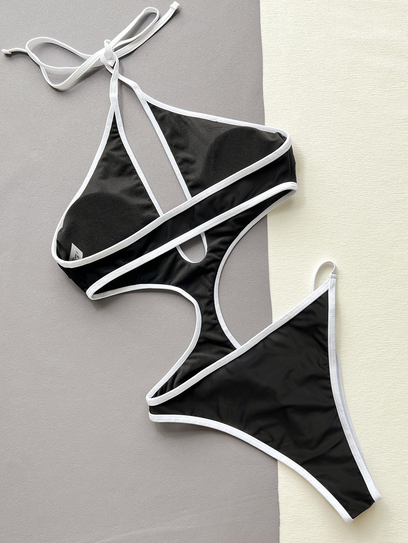 Bikini Black White Contrast Color Hollow Out Cutout Strap One Piece Swimsuit