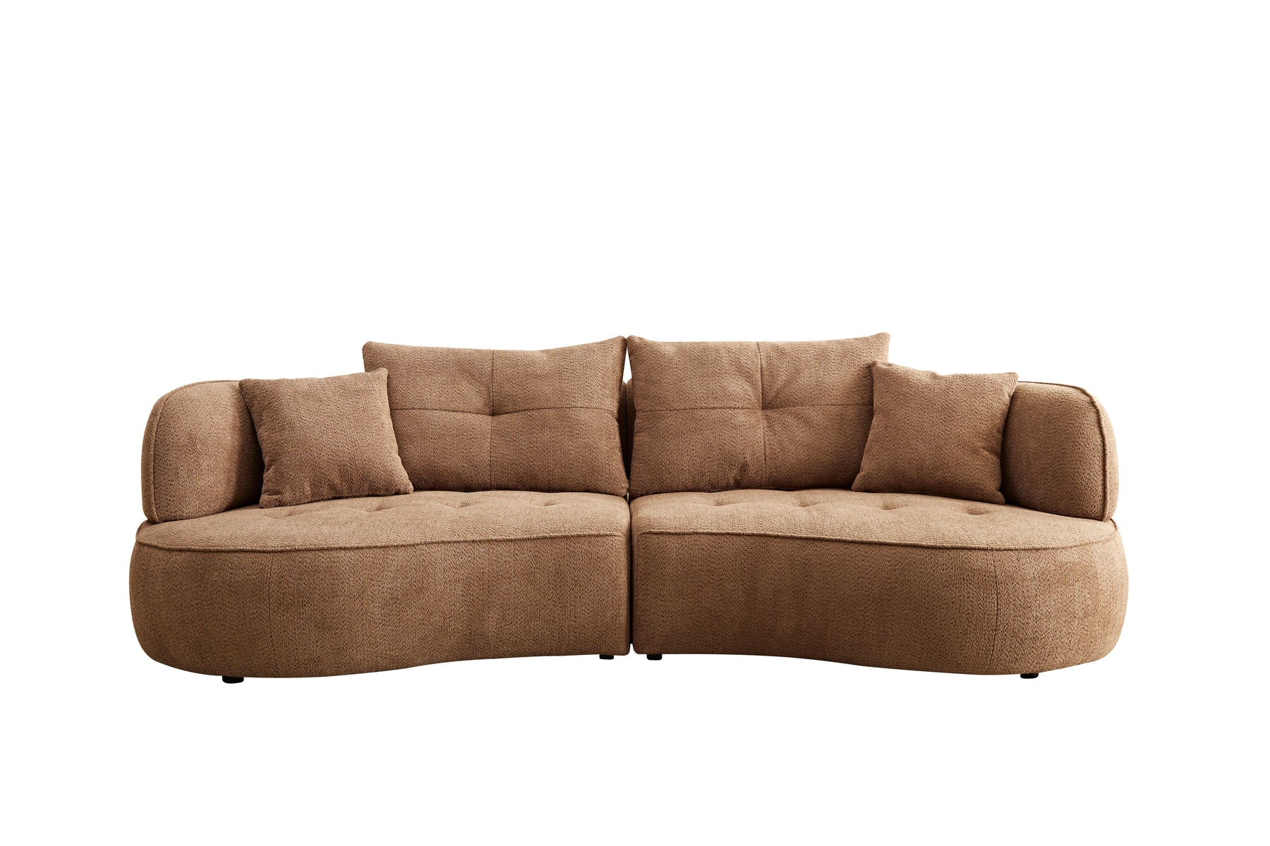 Camel color combo sofa with detachable pillows, durable fabric, solid wood frame, high density sponge padding, modern style moon curve sofa has shape and comes with 4 throw pillows.