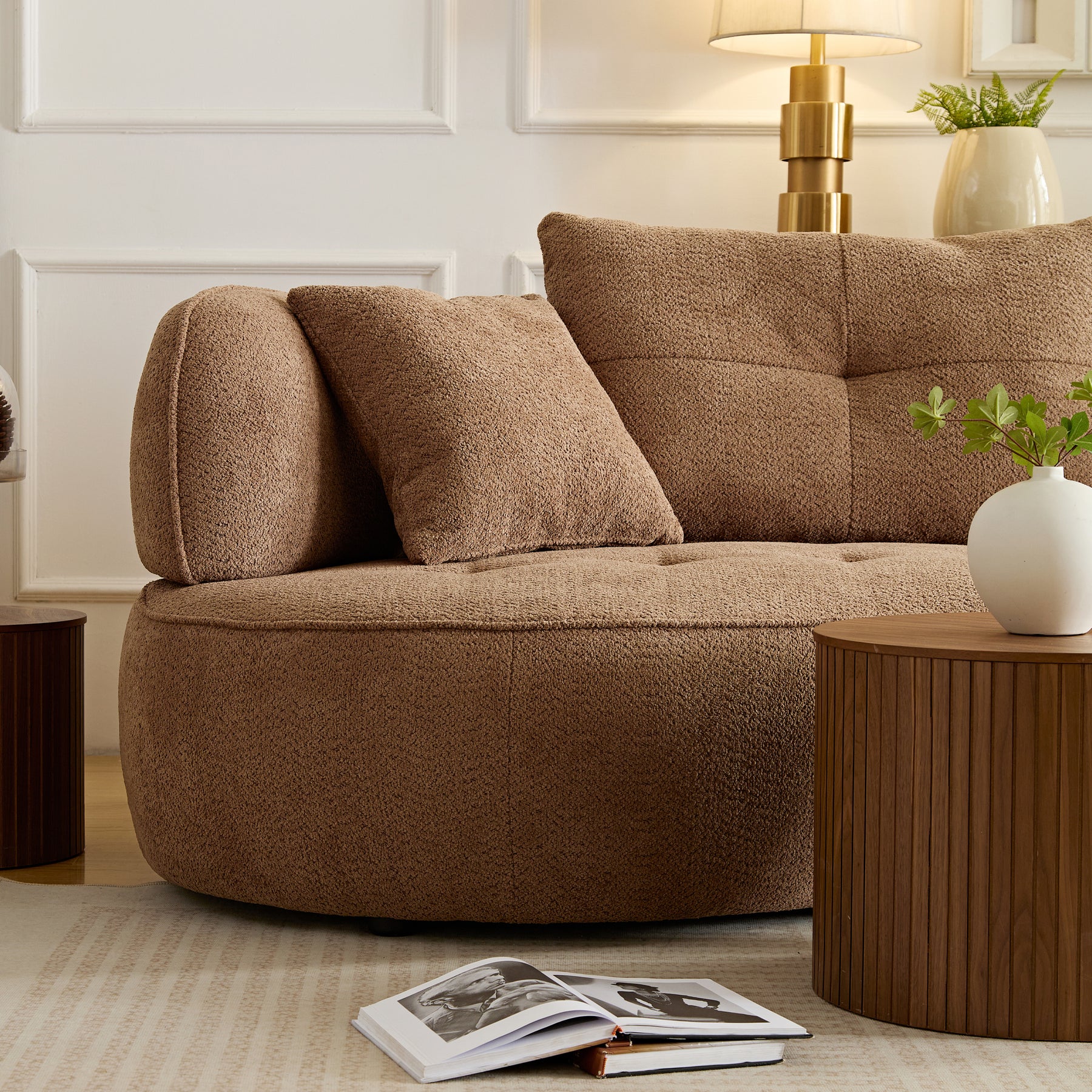 • Camel color combo sofa with detachable pillows, durable fabric, solid wood frame, high density sponge padding, modern style moon curve sofa has shape and comes with 4 throw pillows.