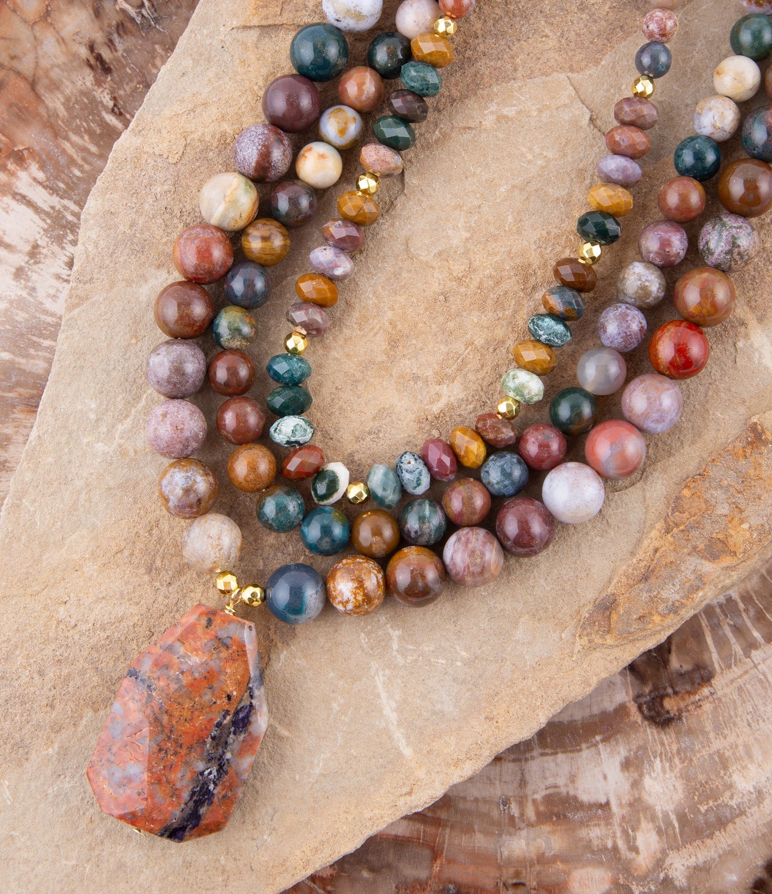 Elevate your look with this stunning Cheyenne Jasper Statement Necklace. Featuring genuine mixed ocean jasper and red creek jasper, this three-layered piece weighs 5.865 oz and measures 17" + 2" with a gold-plated brass extender chain and lobster clasp closure. Crafted and finished by hand, the piece is topped with a unique pendant that measures 1.5" in length and 1" in width. Show off your style and get ready to wow!