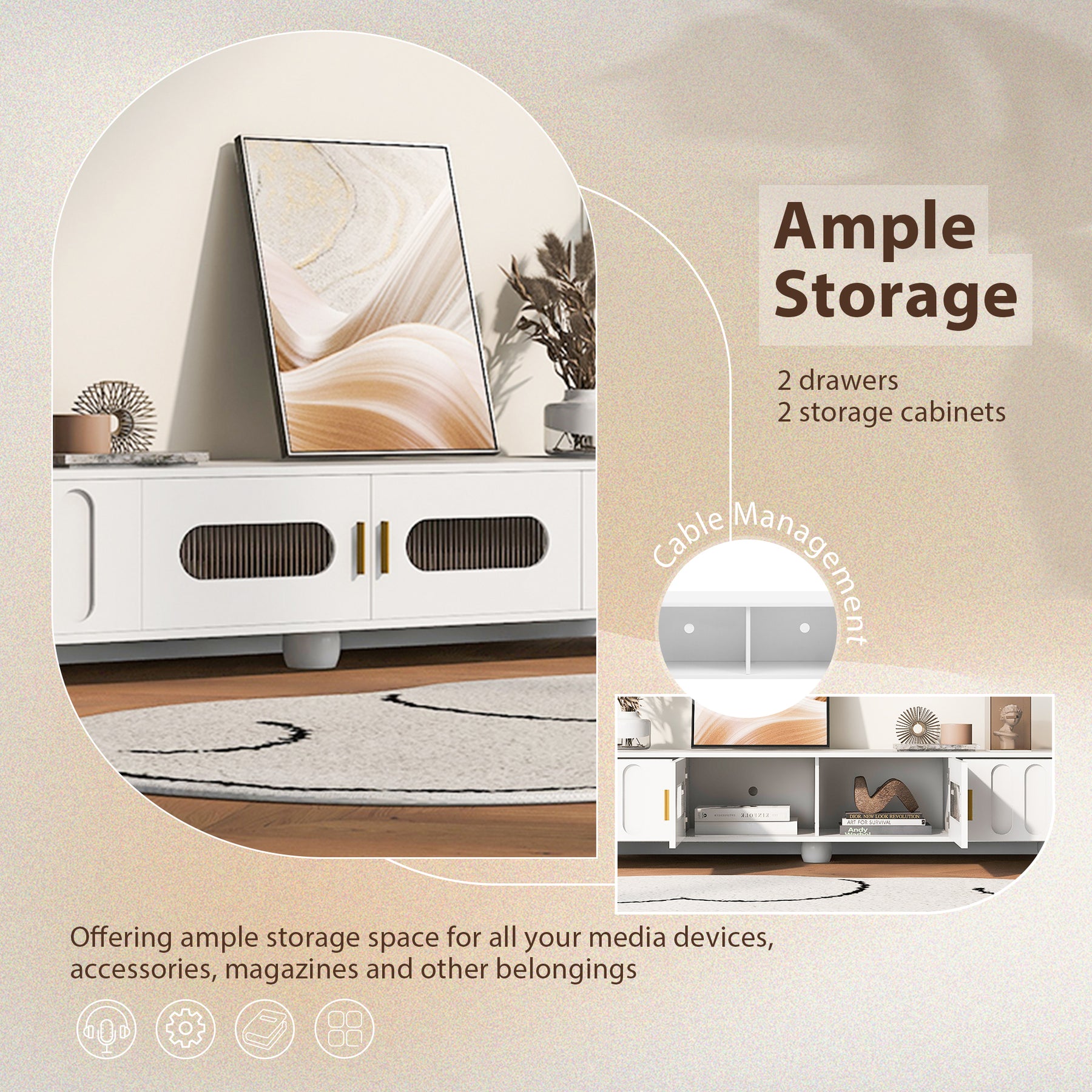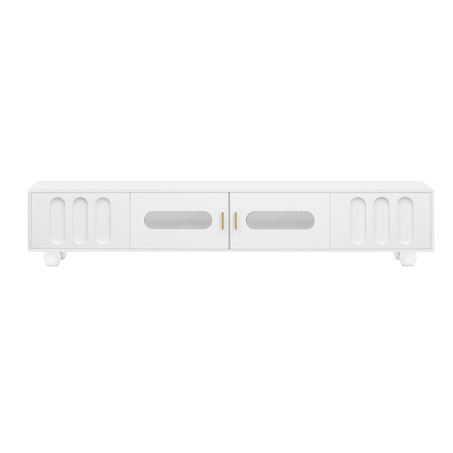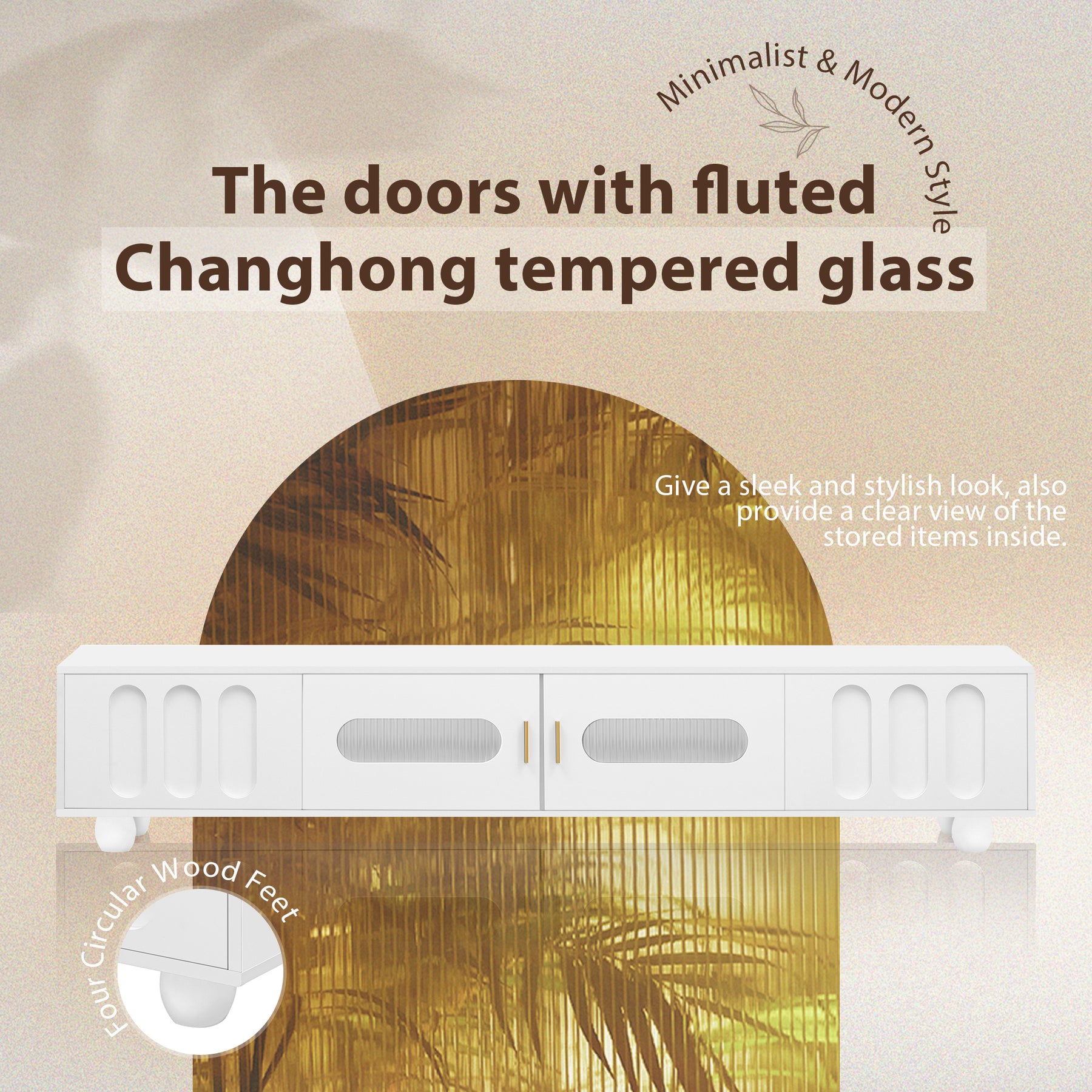 This contemporary and sleek TV stand featuring dual doors and two drawers for a versatile storage layout. The cabinet doors are made of Changhong tempered glass with an elegant arched shape and each drawer door presenting three oval-shaped designs, adding a touch of sophistication to the overall look.