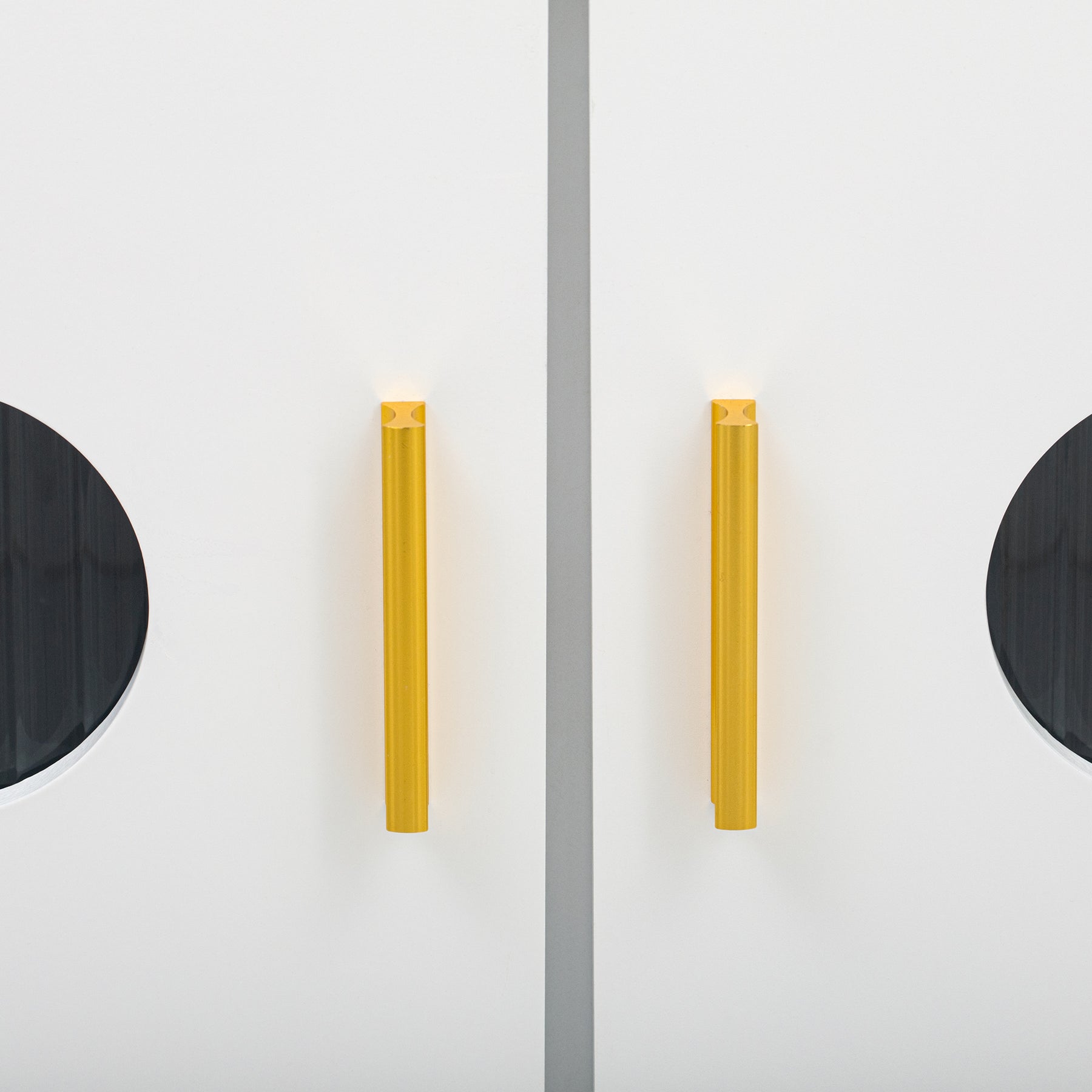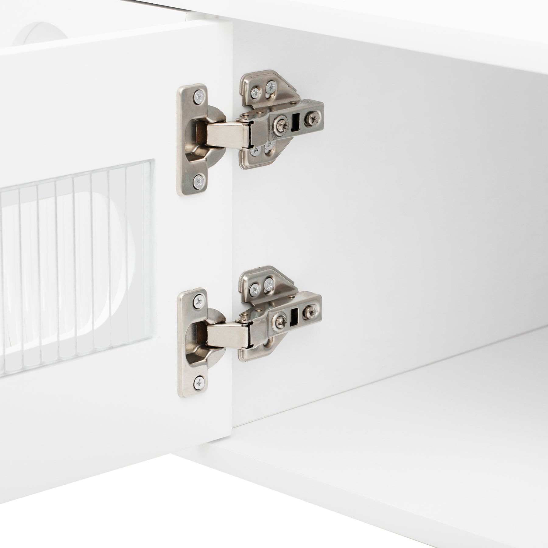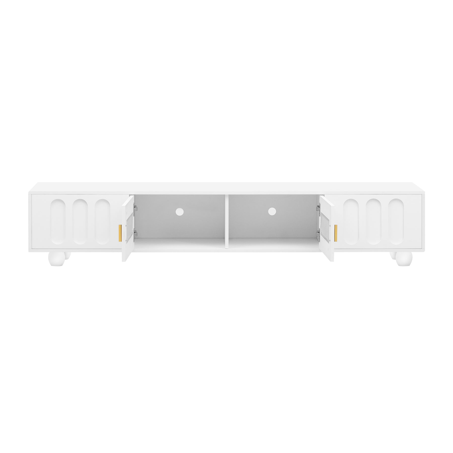 This contemporary and sleek TV stand featuring dual doors and two drawers for a versatile storage layout. The cabinet doors are made of Changhong tempered glass with an elegant arched shape and each drawer door presenting three oval-shaped designs, adding a touch of sophistication to the overall look.