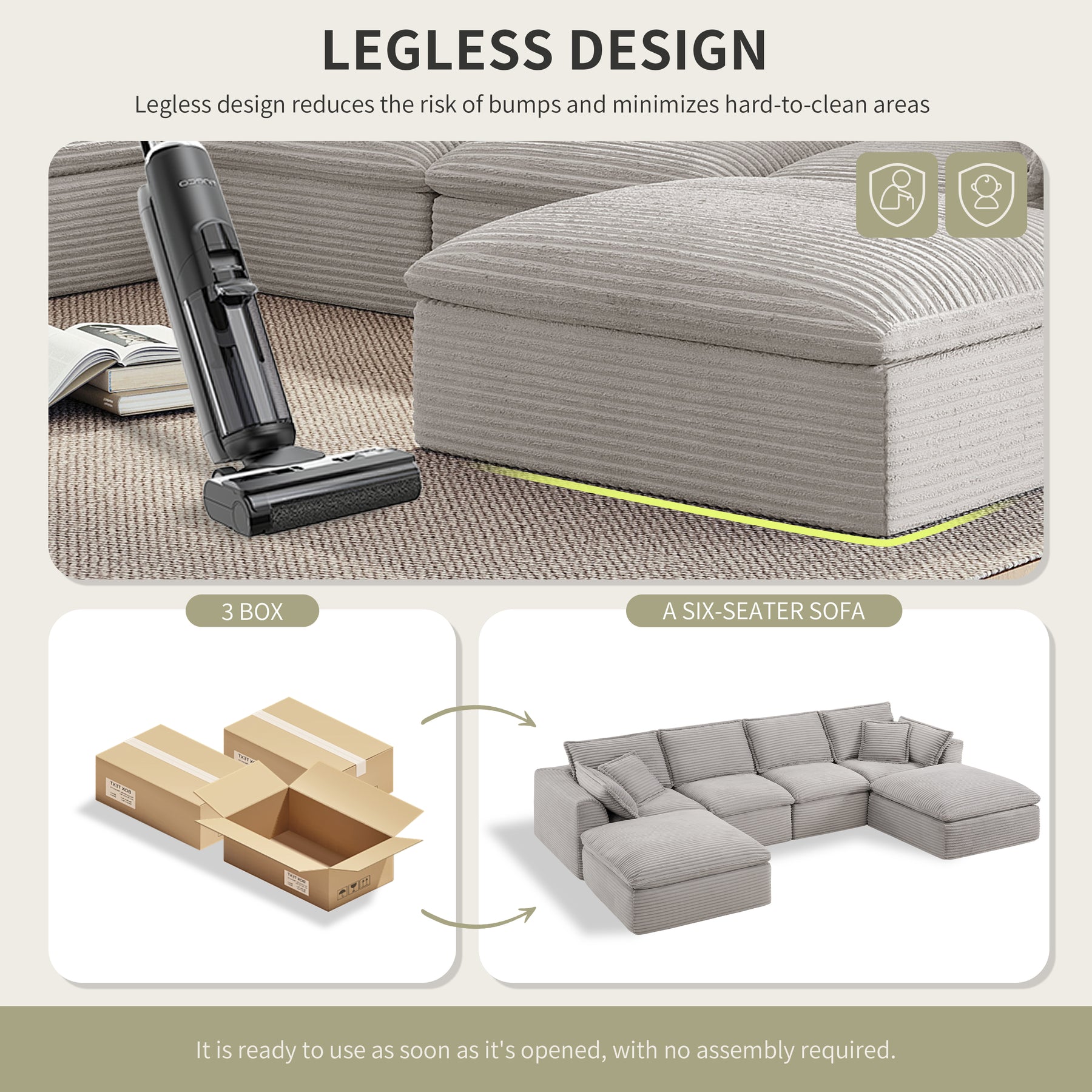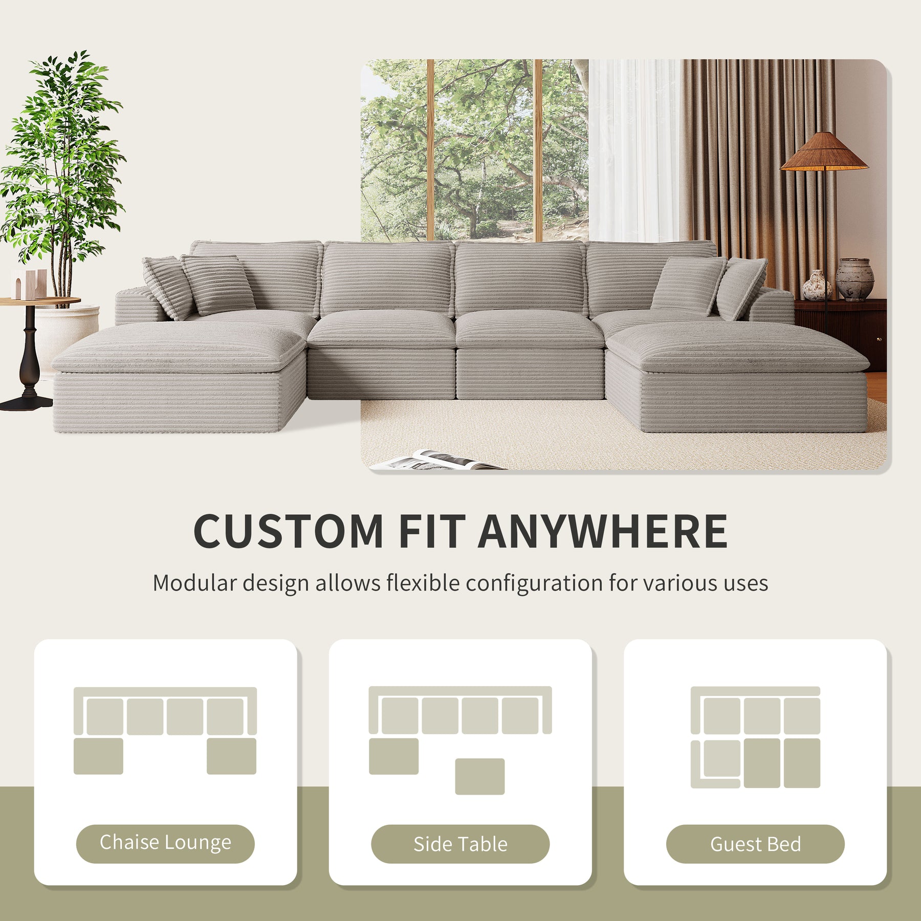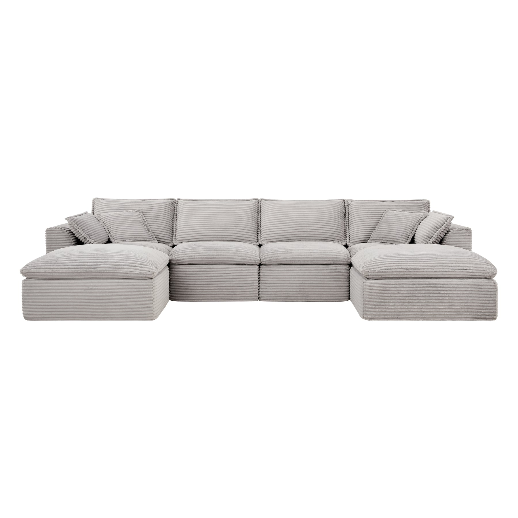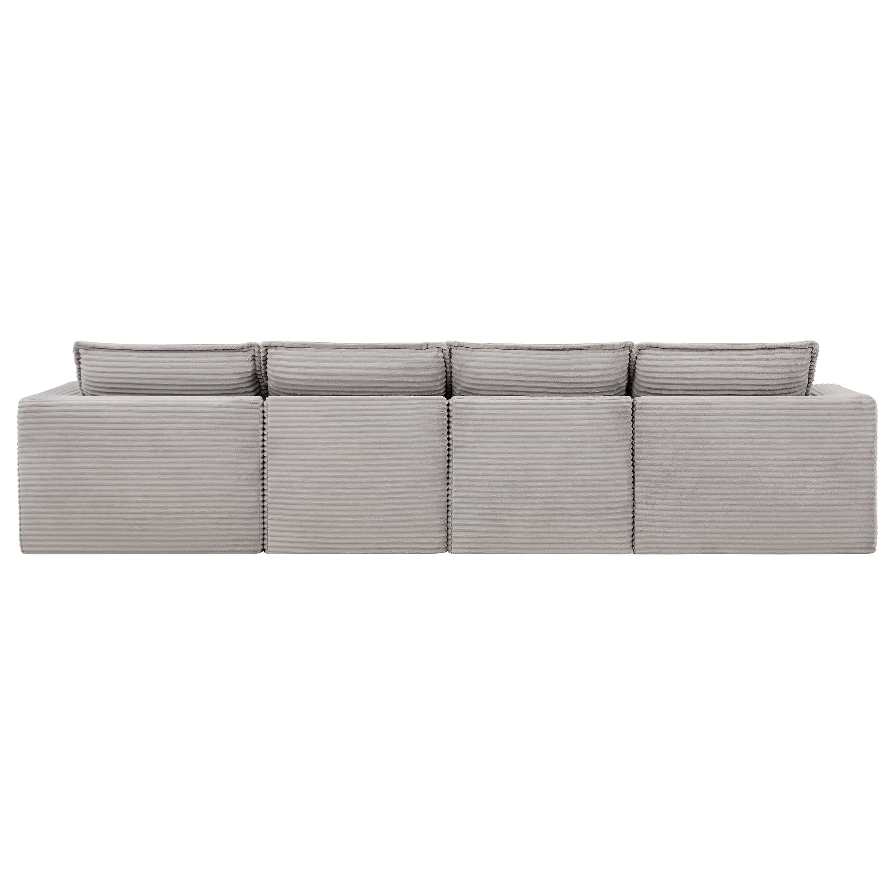 Experience spacious luxury redefined with our fully-compressed modular sofa – featuring a generous 4-seater main section and two versatile ottomans designed for ultimate flexibility. Arriving compactly packaged yet expanding into a sprawling lounge haven, this set delivers uncompromised comfort through high-density, high-resilience foam cushions that offer plush softness without sacrificing support. Each piece boasts generously oversized dimensions: deep seats and wide bases invite full-body relaxation, whether you're stretching out solo or hosting friends. The magic lies in its effortless modularity – freely configure the sectional and ottomans as connected seating, detached footrests, or even impromptu side tables to match your space and mood. Wrapped in sumptuous horizontal rib corduroy upholstery, the fabric showcases elegant textured lines that catch the light while resisting wear, blending tactile sophistication with everyday durability. Perfect for large living rooms or open-plan spaces, this is more than a sofa – it’s your personalized comfort ecosystem where cloud-like softness meets intelligent design. No Assembly Acquired. Delivered compact. Lives large.