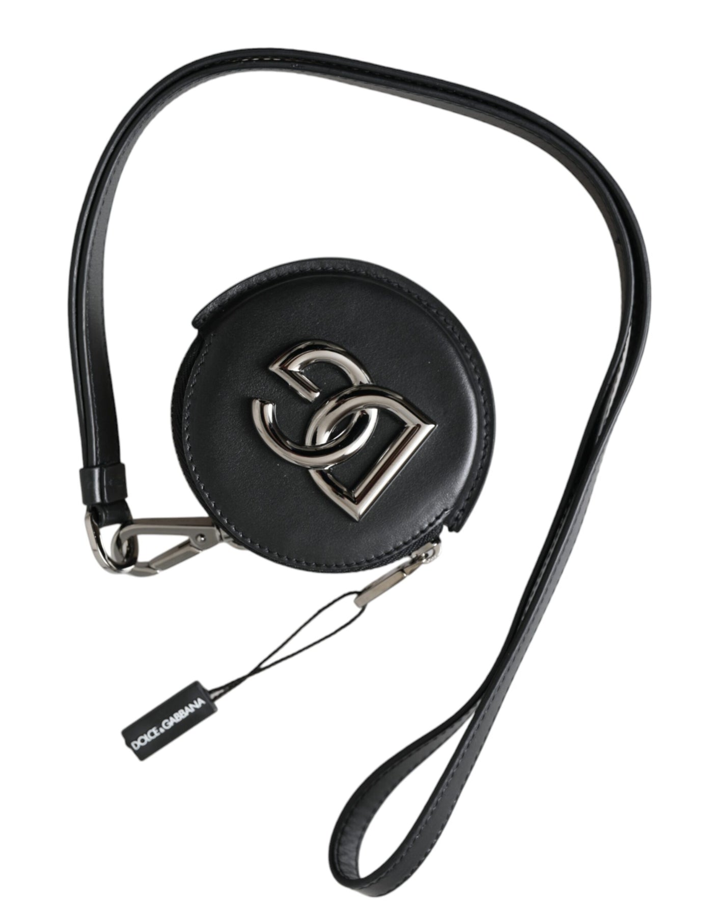 Dolce & Gabbana Black Round Leather DG Logo Coin Purse Lanyard Wallet