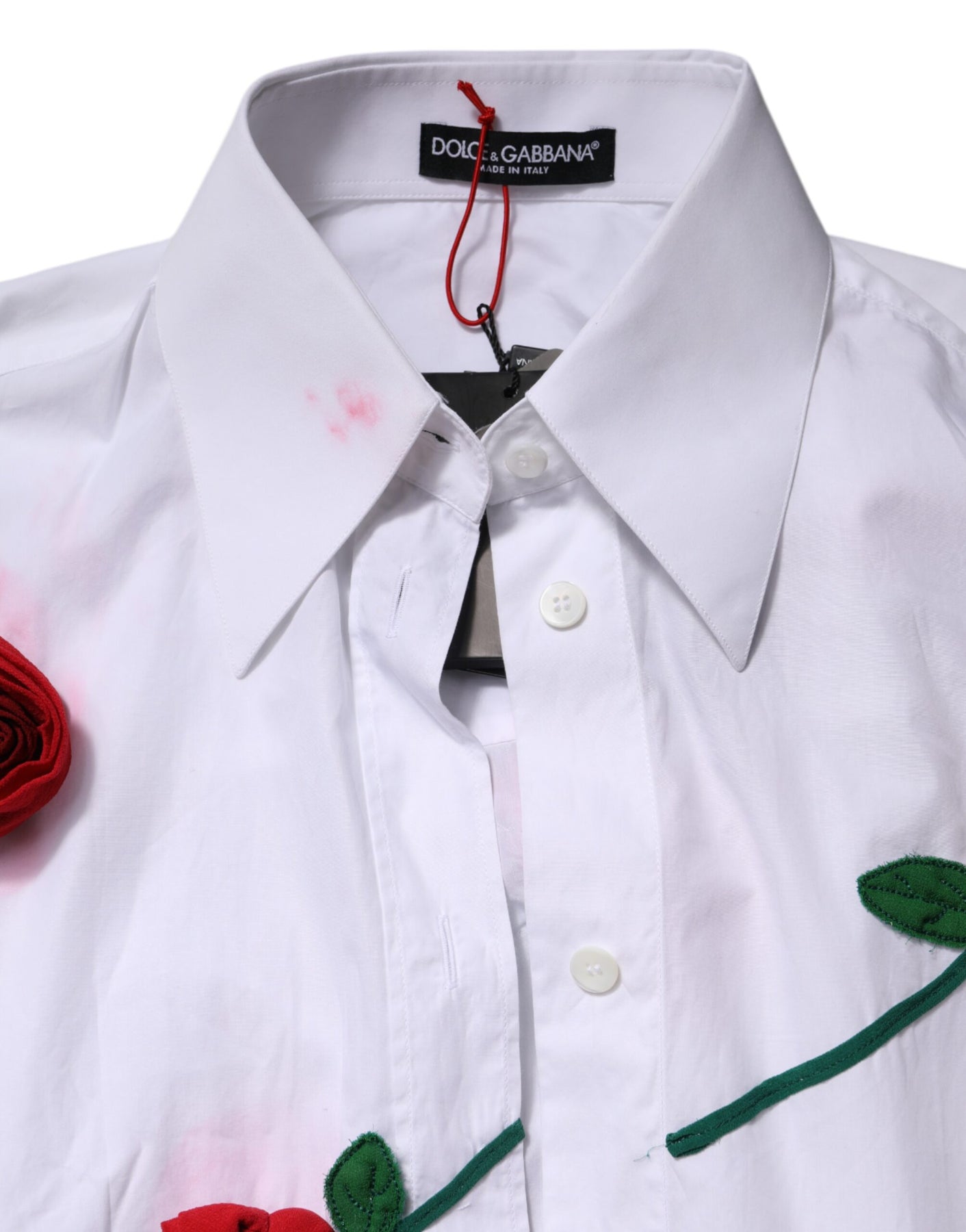 Dolce & Gabbana White Cotton Floral Appliques Dress Shirt Top