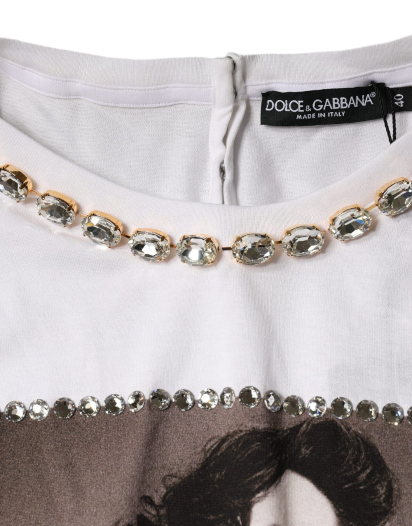 Dolce & Gabbana White Crystal Neckline Embellished Printed T-shirt