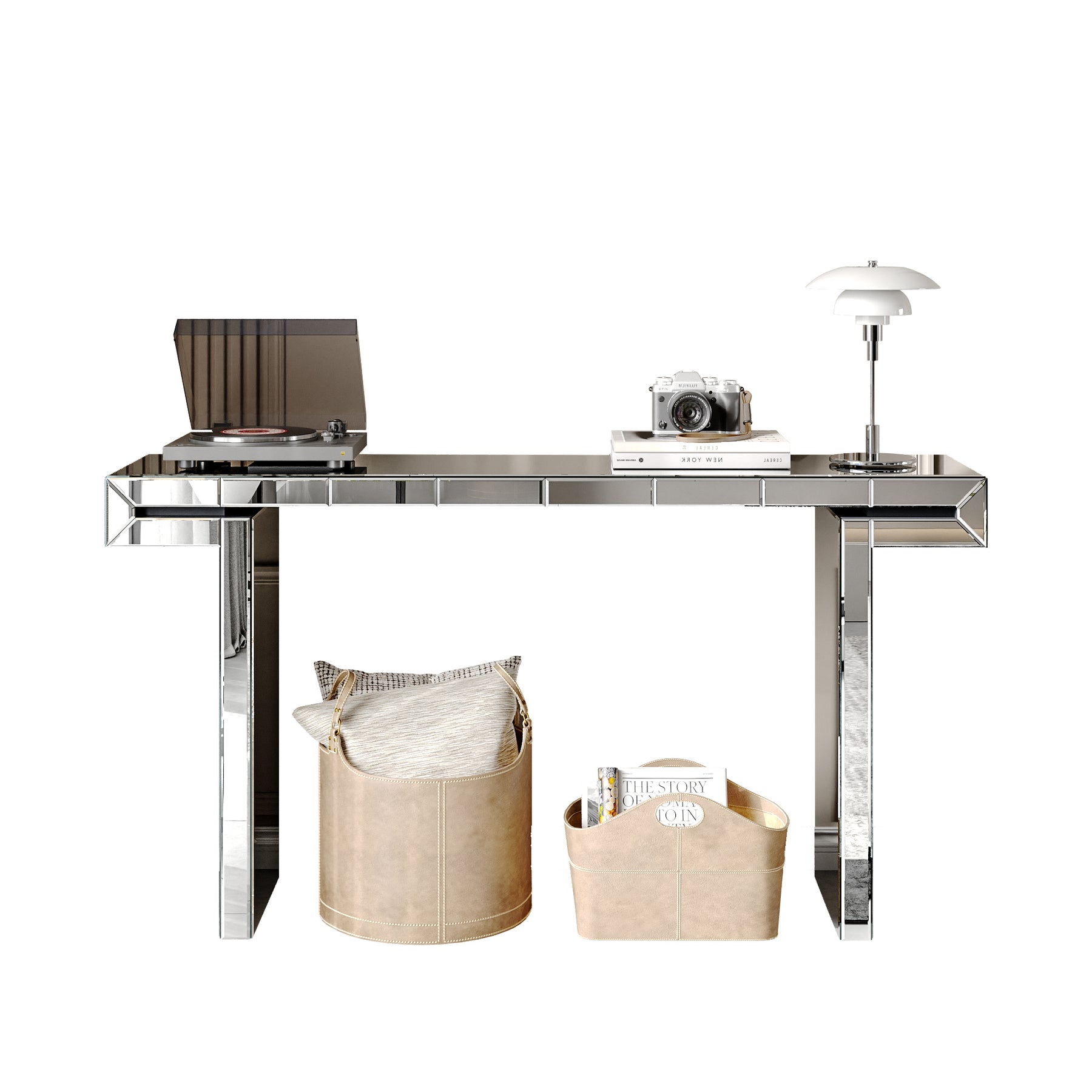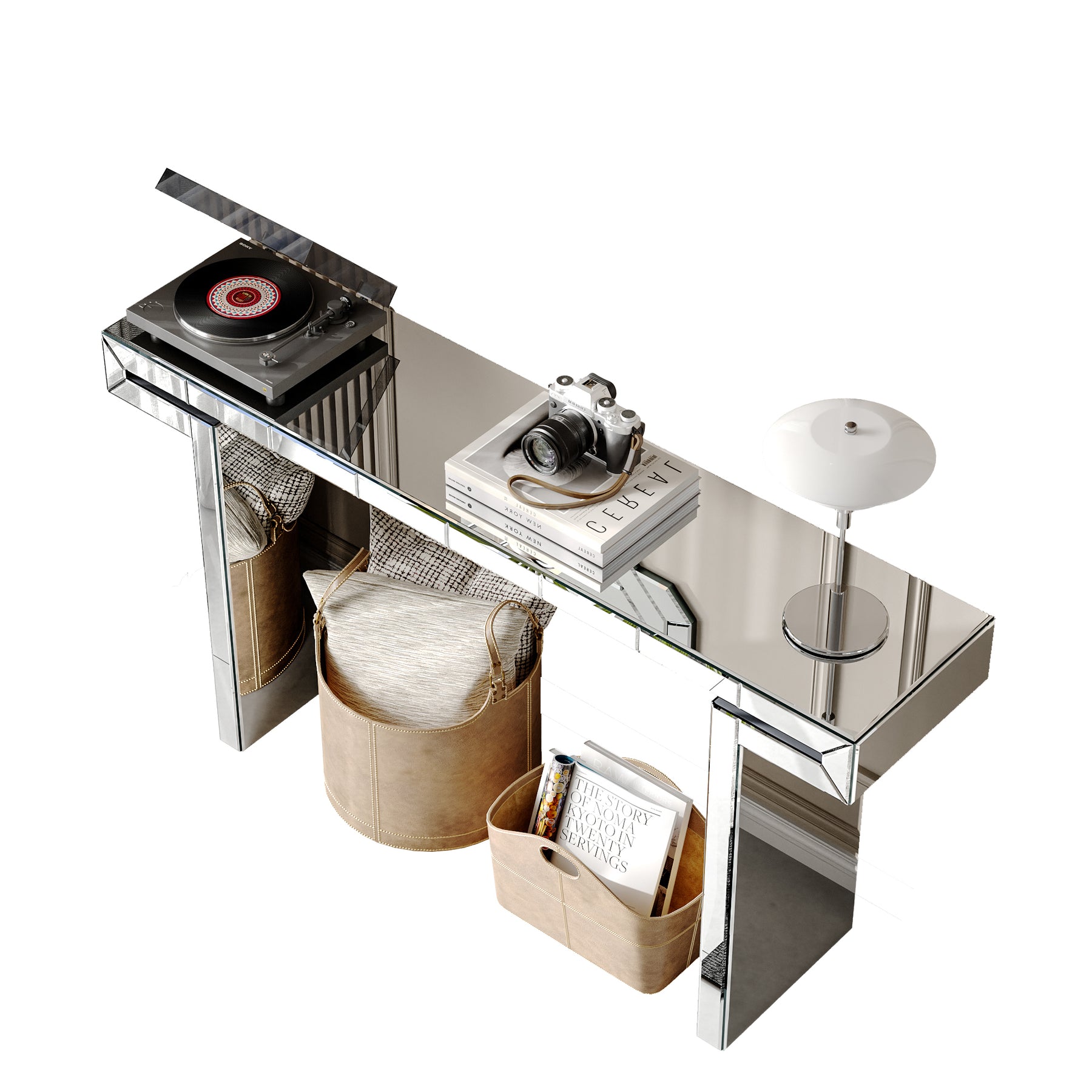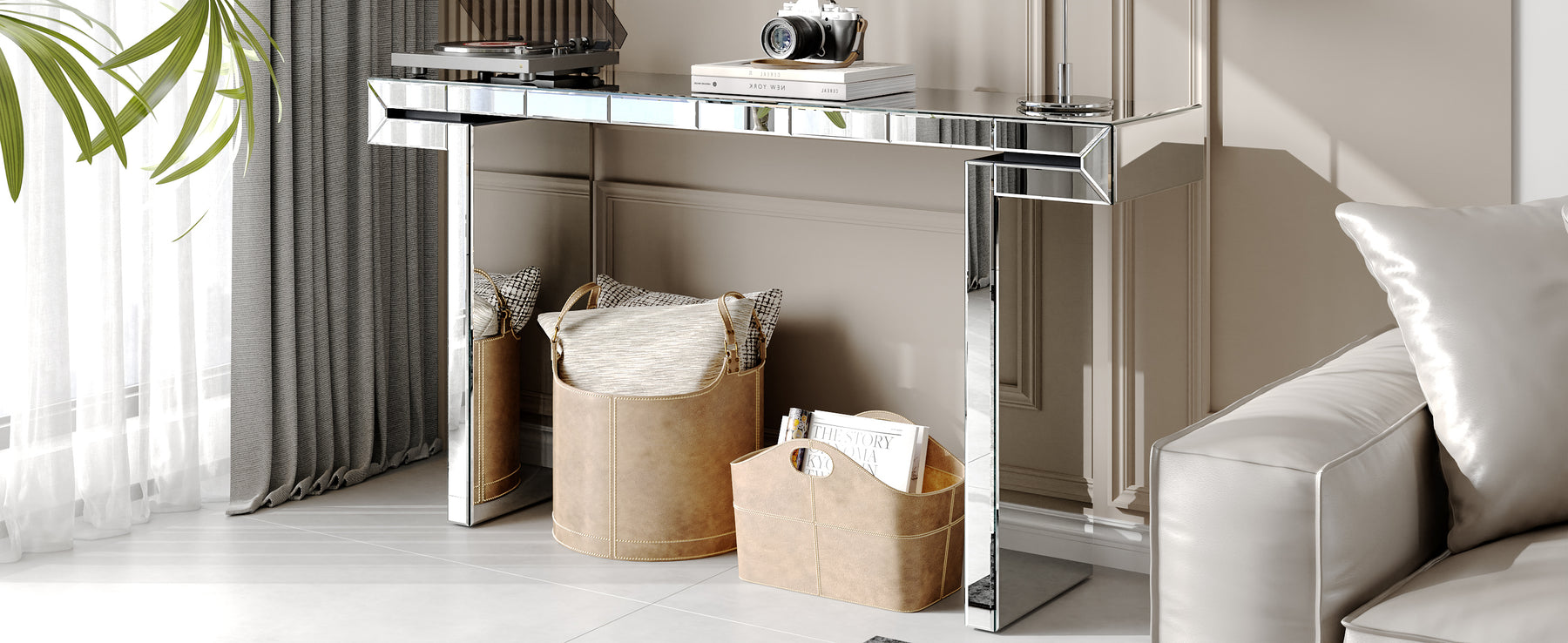 Enhance your entryway or living room with this luxury full-length mirror console table, designed to merge functionality with light luxury sophistication. Its striking full-body mirrored surfaces and fluted tempered glass details create a bold yet elegant statement, while the 60-inch length and slim 14.17-inch width make it ideal for narrow spaces. The innovative fold-back design seamlessly connects the tabletop and legs, ensuring a cohesive, modern look that complements sofas or stands alone as an entryway centerpiece. Safety and convenience are prioritized: hand-polished tempered glass edges eliminate sharpness, and the 2-corner assembly (using three pre-cut panels and two connectors) allows quick, tool-free setup. Perfect for small apartments or spacious homes, the mirror finish visually expands areas, adding brightness and depth. Shipped in reinforced, damage-resistant packaging, this table arrives ready to elevate your décor. Whether placed in hallways, behind sofas, or as a glamorous entryway display, its 31.5-inch height and sleek profile suit contemporary, minimalist, or high-end styles. Crafted for durability and style, this console table is a timeless upgrade for organizing essentials or showcasing cherished décor.