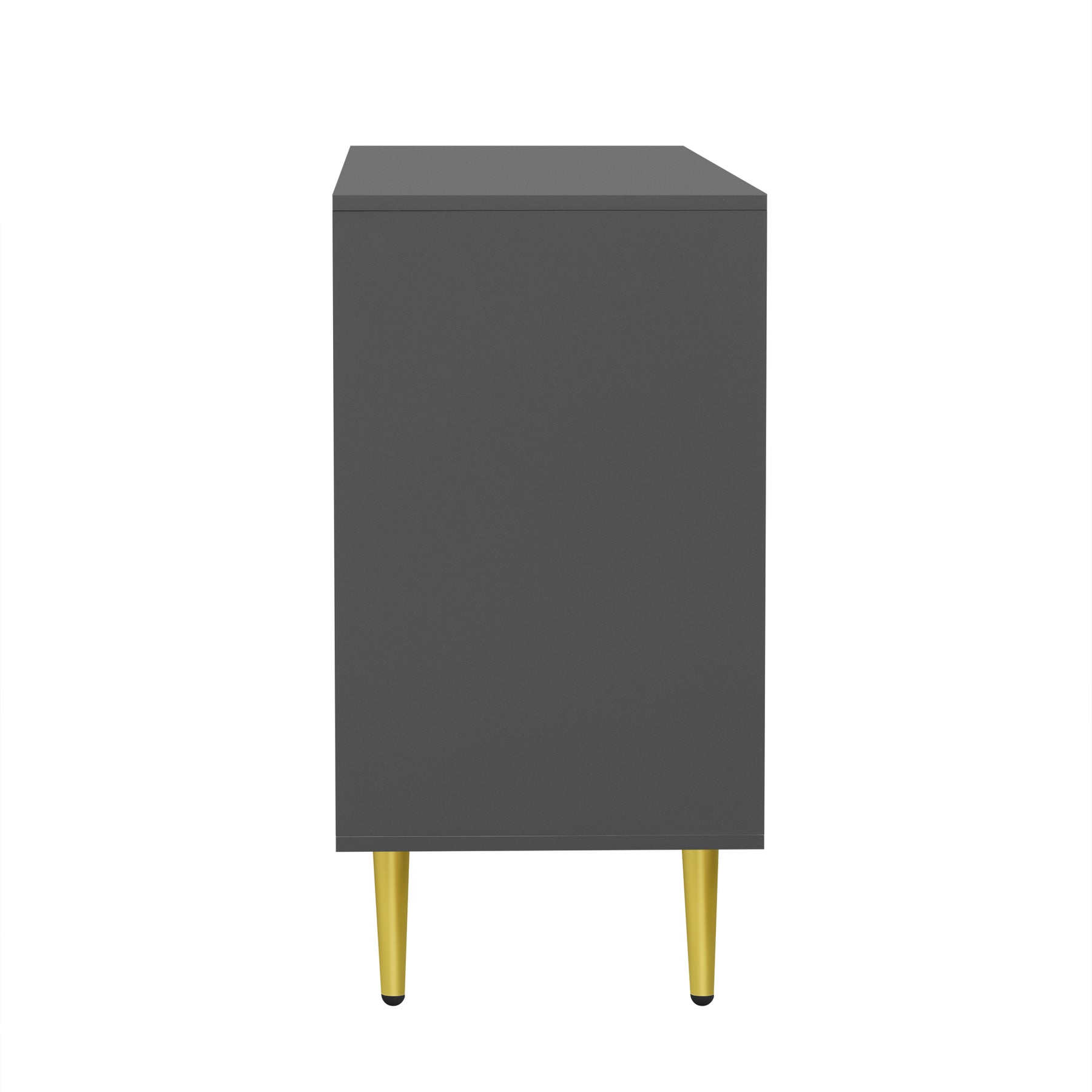 Crafted with meticulous craftsmanship and an eye for simplicity and elegance, this TV cabinet seamlessly integrates into modern living spaces, showcasing an exquisite design that harmoniously blends functionality and style. Featuring premium gray panels and supported by sturdy golden metal legs, it embodies a sophisticated and timeless aesthetic that complements a variety of decor styles, adding a luxurious touch to your living space. The ample two-door storage compartment, equipped with sleek, easy-to-open handles, efficiently accommodates audio-visual equipment, daily essentials, and more, while the central partition, with its layered design, introduces versatility and functionality, serving as both a display area and additional storage space. Furthermore, the cabinet boasts an adjustable shelf, allowing you to customize the storage layout to suit your needs, fostering order and aesthetics in your living room. Additionally, it includes anti-tip device at the back for added safety, ensuring peace of mind and stability in your home environment.
