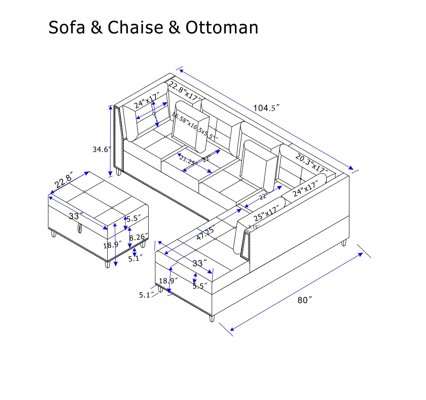 • 【Upgraded Combination Sofa】 This sofa is an upgraded version of the 3 seats and 1 chaise and 1 ottoman. The ottoman has storage function.