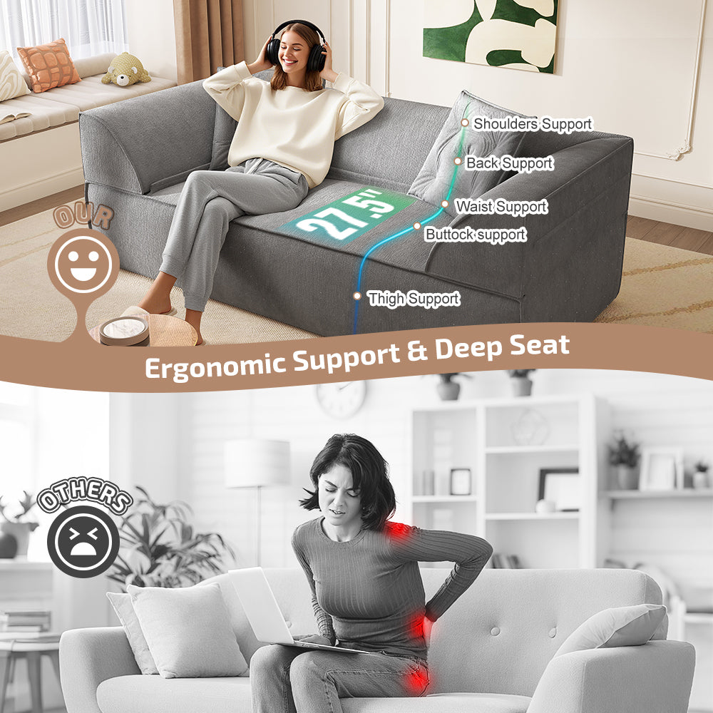 • 【Deep Seat Couch】Deeply immersive comfort, the carefully designed enlarged seat depth (27.5') far exceeds ordinary seating, allowing your legs to fully stretch while providing comprehensive back support. Whether you're tall or prefer curling up comfortably, everyone can find their perfect position.